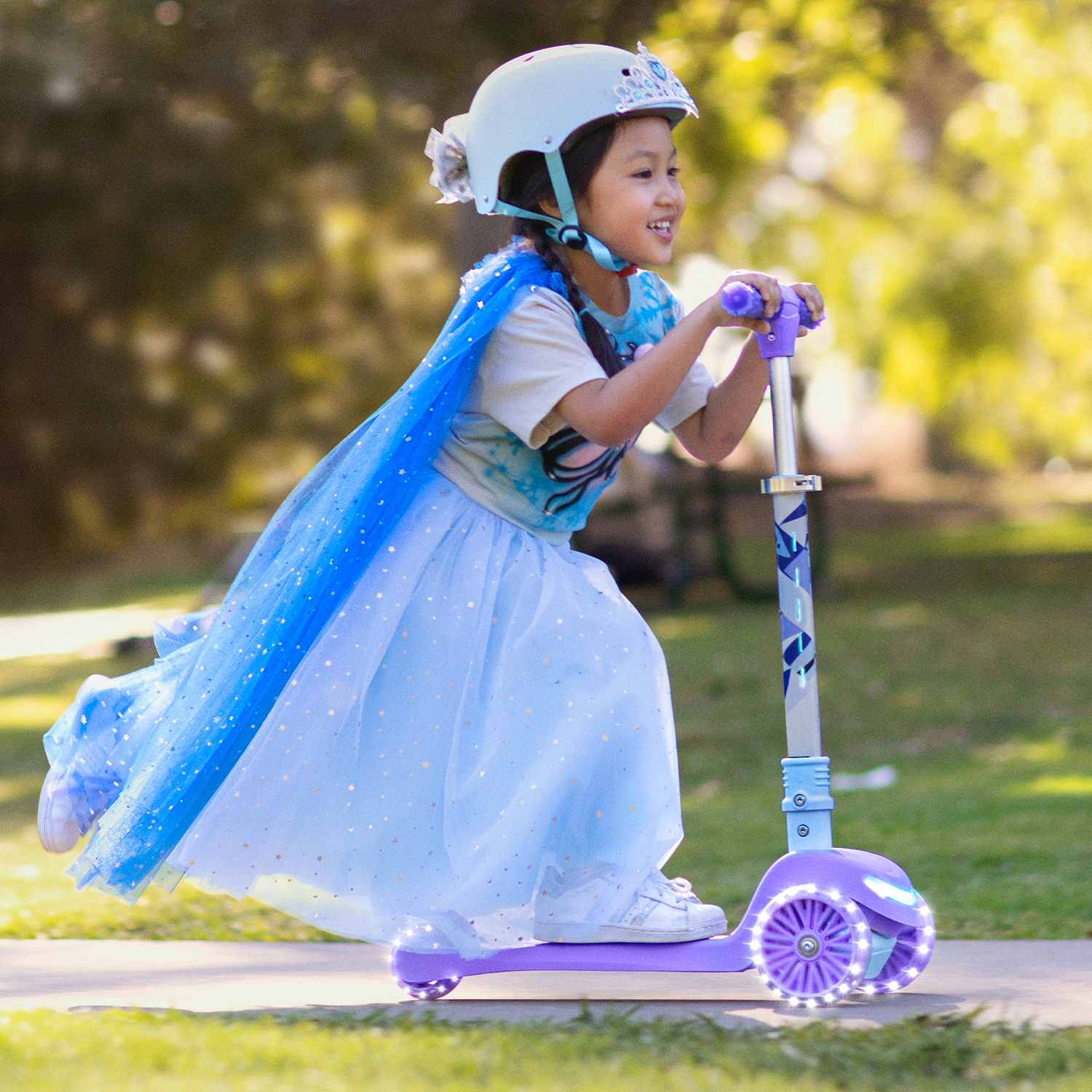 Get ready to scoot into the unknown with the Jetson Disney Frozen 3-Wheel Light-Up Kick Scooter. Featuring an amazing graphic of Elsa on the purple deck that is sure to enchant Frozen fans. LED lights can be found in the stem with seven different light functions programmed, while the scooter’s wheels contain kinetic lights that light up as you ride. Its 3-wheel design is intended to give even the smallest riders maximum balance as they ride. The intuitive lean-to-steer system is a super-easy way for new riders to learn to scoot – they simply control the direction of the scooter by grabbing the handlebars and shifting their weight. The scooter’s easily foldable mechanism makes it super simple to fold the handlebar and lock it into place in the deck. With its height-adjustable handlebar this is also one scooter that can grow along with your child, making this the perfect first scooter for any budding princess. Recommended for kids ages 3 and up.