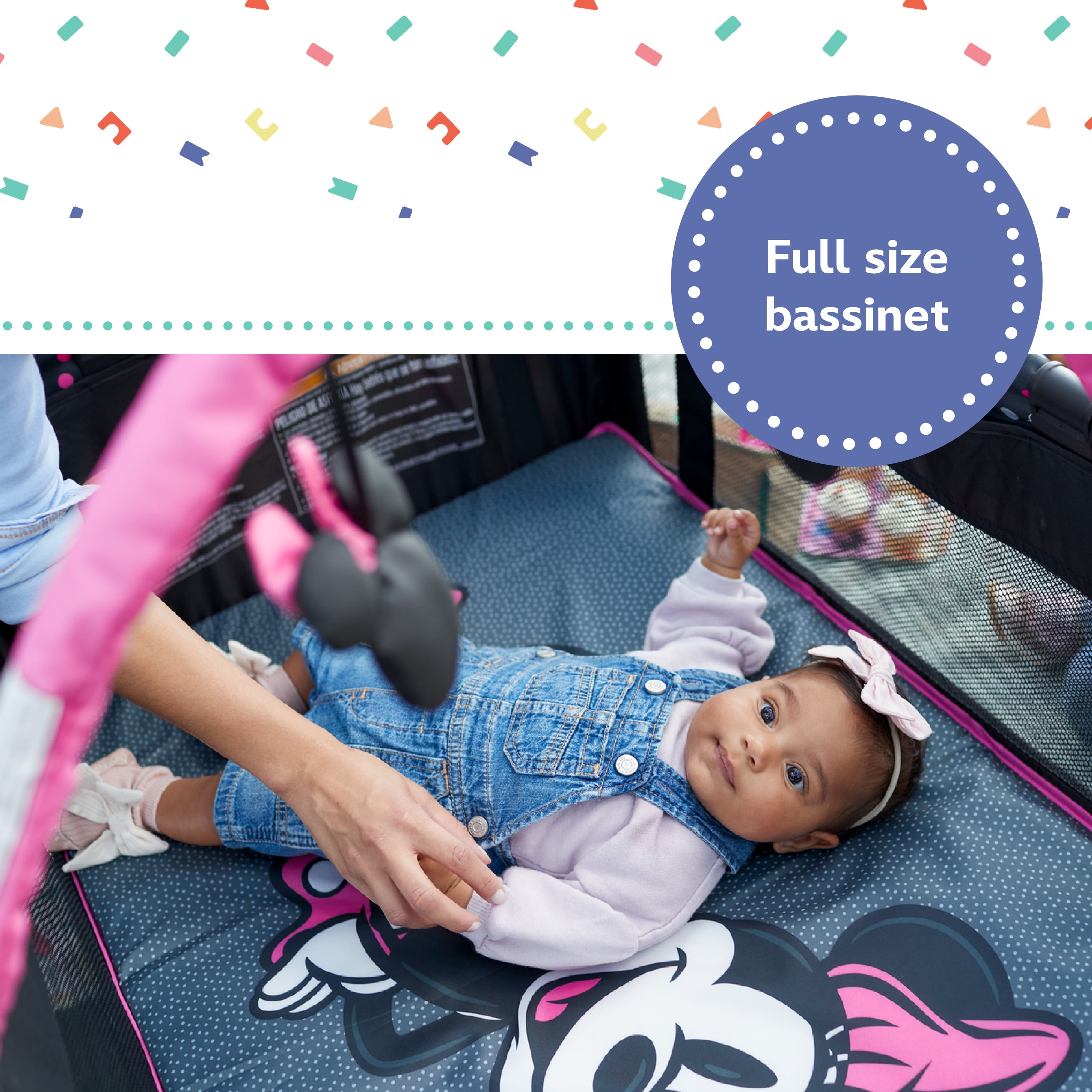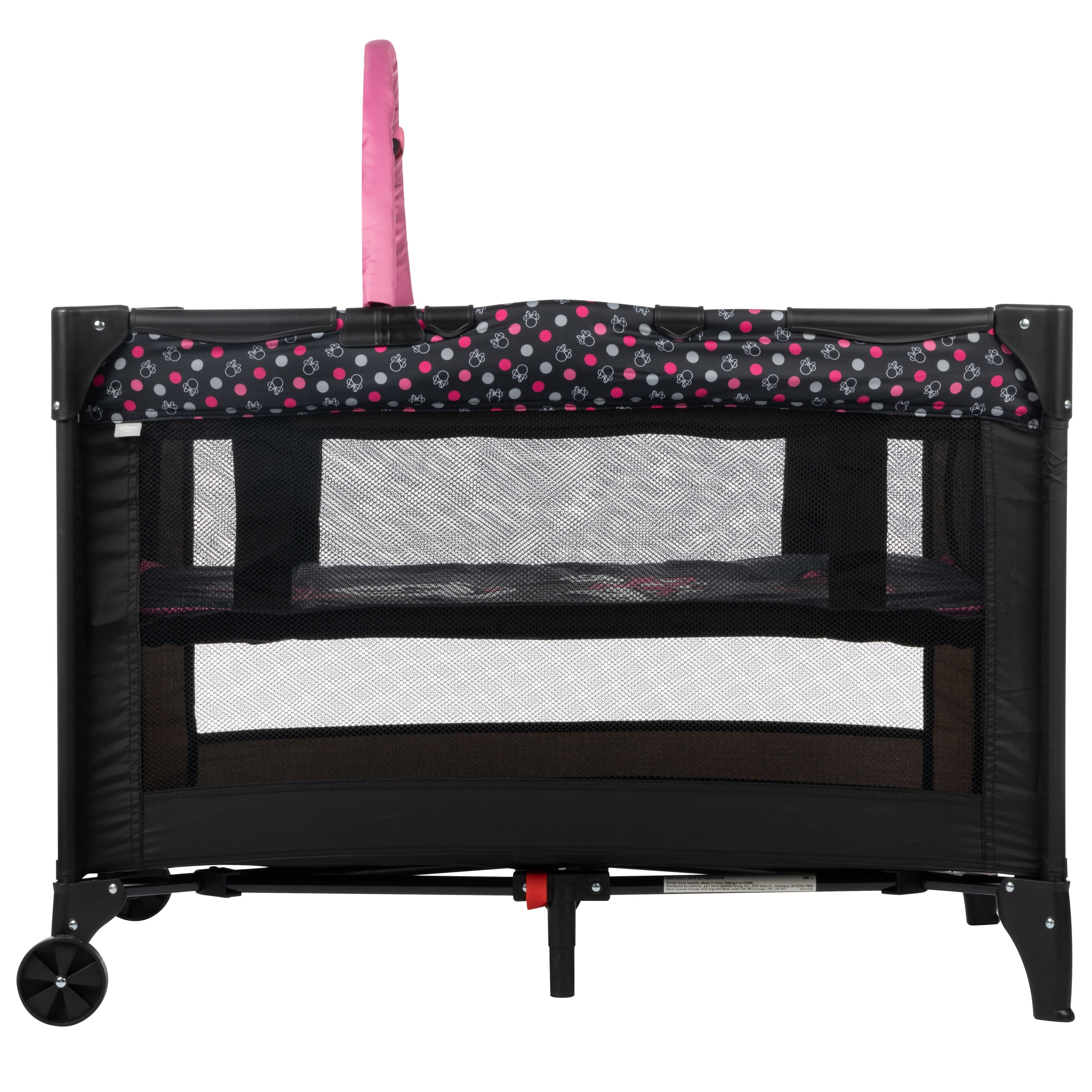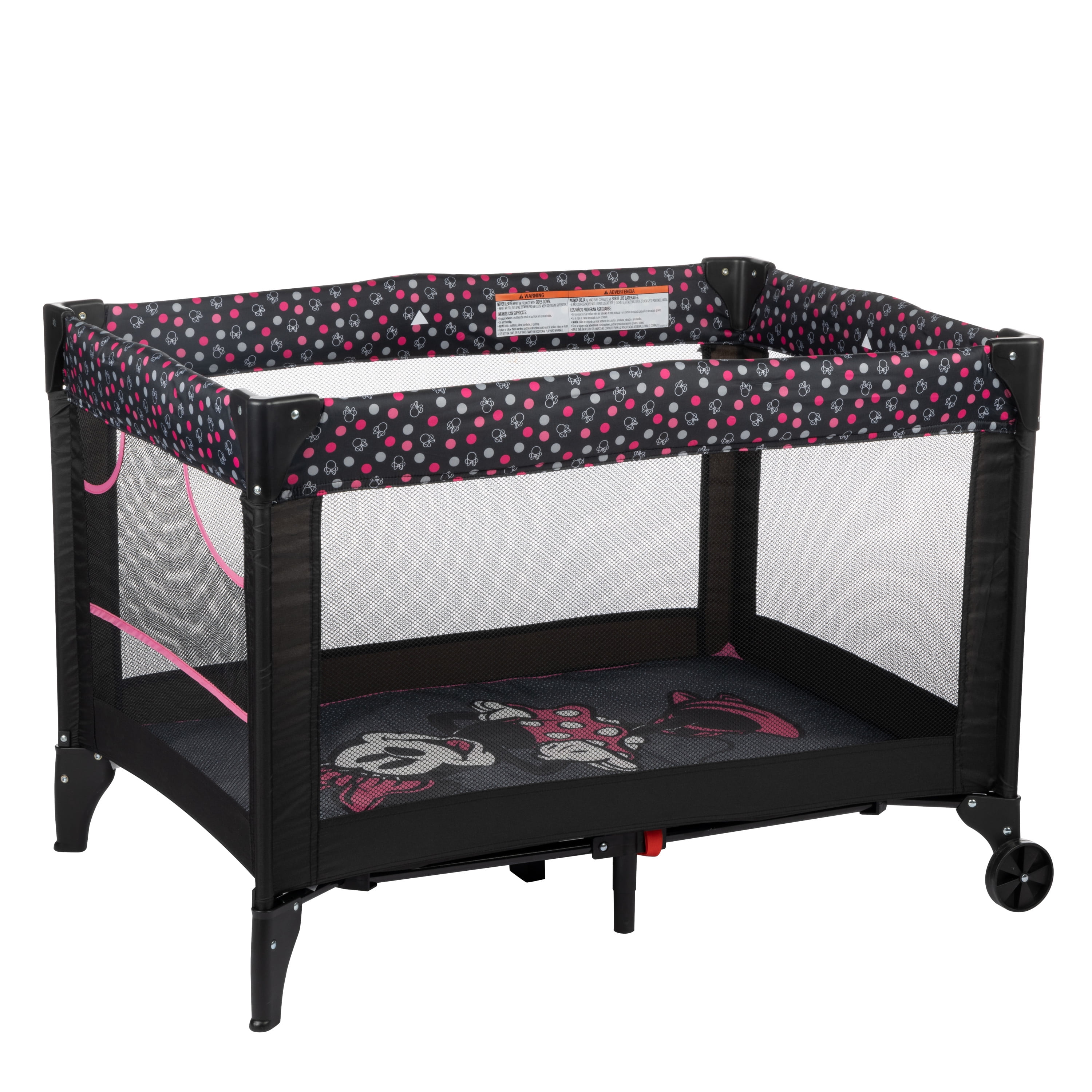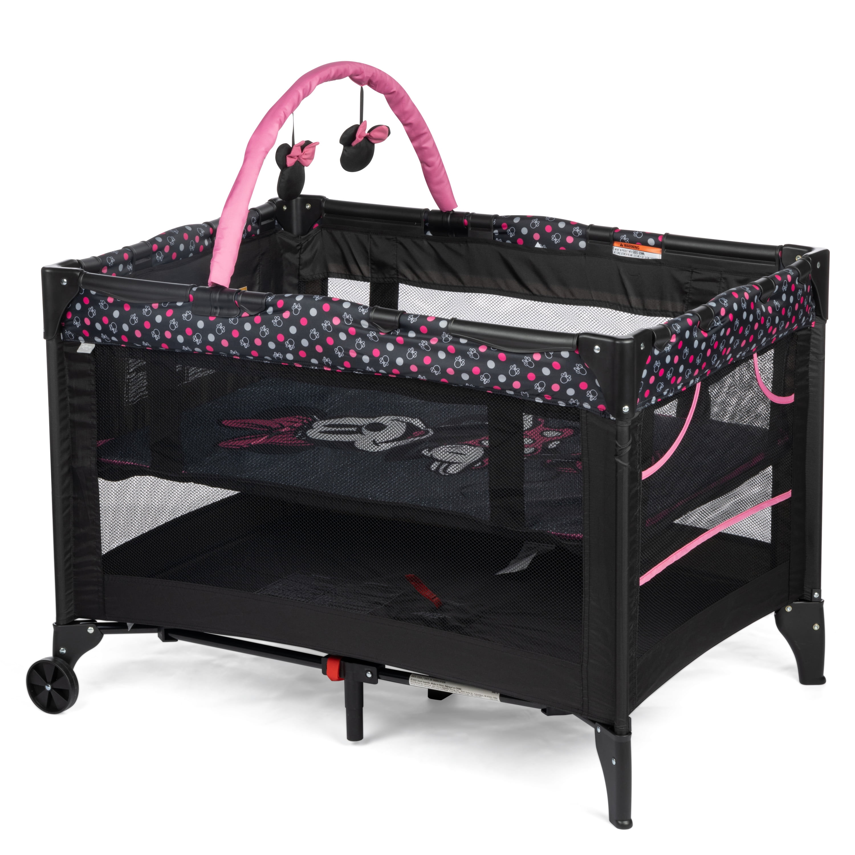 Disney Baby 3D Ultra Baby Play Yard with Bassinet and Toy Bar, Modern Minnie Full size play yard Full size bassinet Quick and compact fold for easy travel Easy to store and transport with carry bag 2 built-in wheels for mobility Breathable mesh sides allow visibility Detachable toy bar with 2 Disney-themed toys Disney-inspired pattern and colors Spacious area for naps and play Assembled Weight: 19.4 lb Color / Fashion: Modern Minnie Designed with a firm, flat sleeping surface that meets the Consumer Product Safety Commission’s recommendations for safe sleep Bassinet mode is suitable for babies up to 15 lbs., or when they begin to push themselves up on their hands and knees Play yard mode is suitable for children up 35”, or when they can climb out