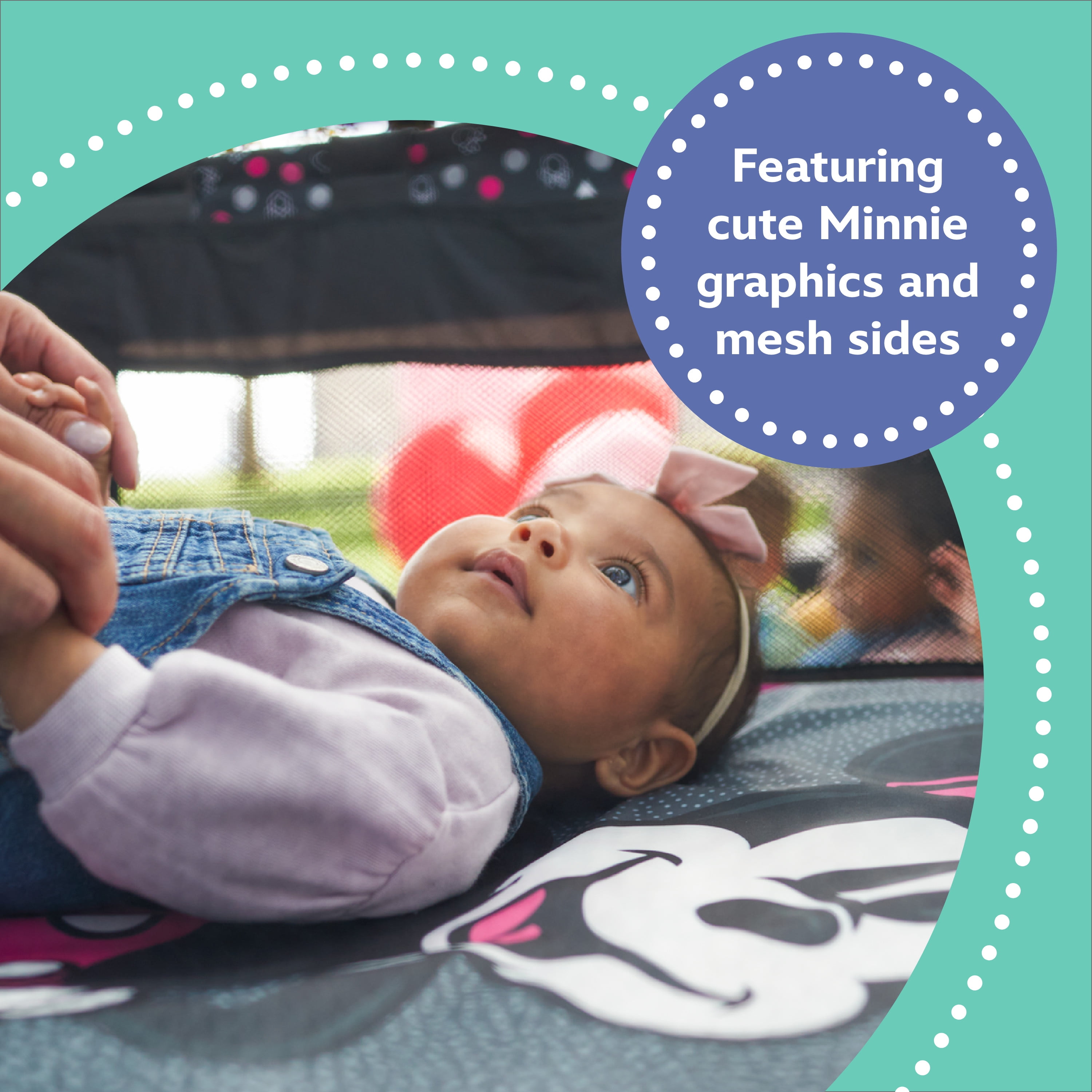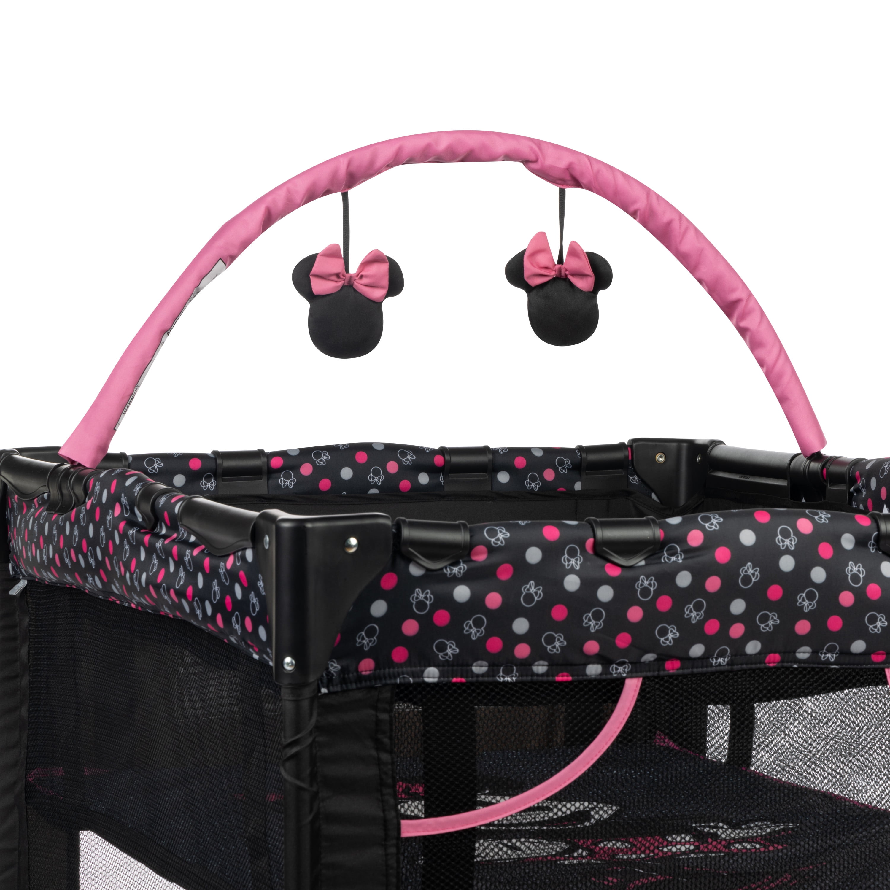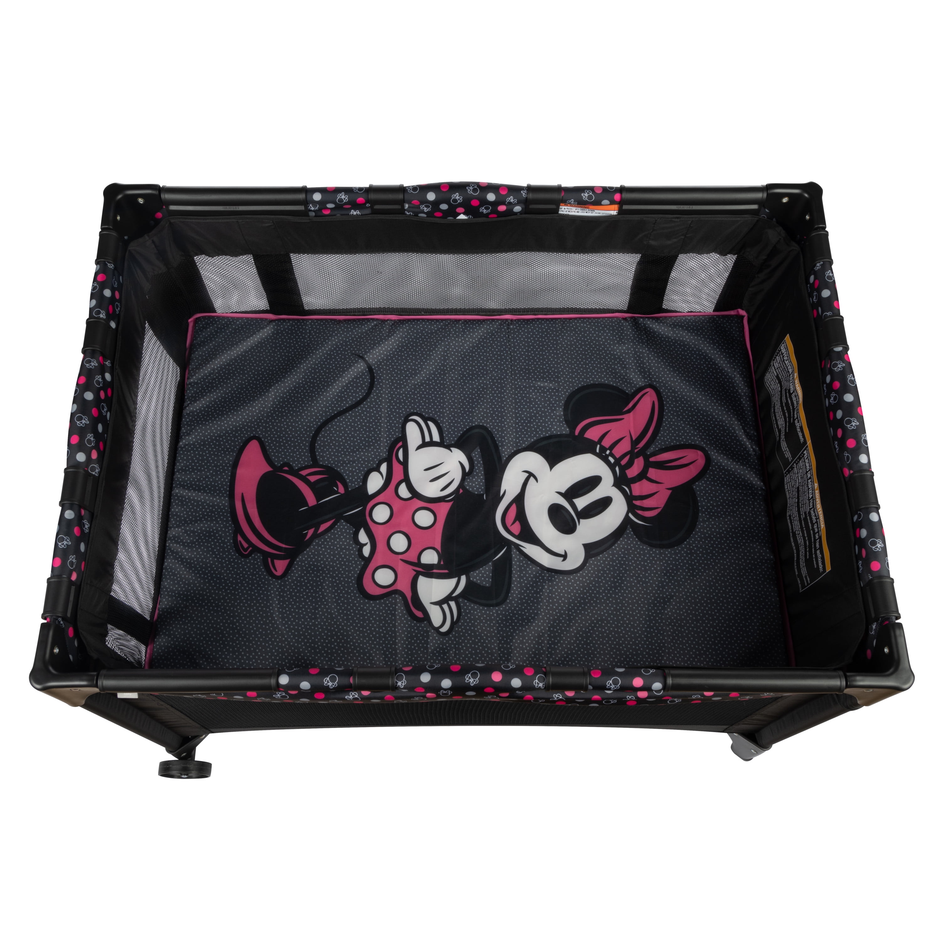 Disney Baby 3D Ultra Baby Play Yard with Bassinet and Toy Bar, Modern Minnie Full size play yard Full size bassinet Quick and compact fold for easy travel Easy to store and transport with carry bag 2 built-in wheels for mobility Breathable mesh sides allow visibility Detachable toy bar with 2 Disney-themed toys Disney-inspired pattern and colors Spacious area for naps and play Assembled Weight: 19.4 lb Color / Fashion: Modern Minnie Designed with a firm, flat sleeping surface that meets the Consumer Product Safety Commission’s recommendations for safe sleep Bassinet mode is suitable for babies up to 15 lbs., or when they begin to push themselves up on their hands and knees Play yard mode is suitable for children up 35”, or when they can climb out