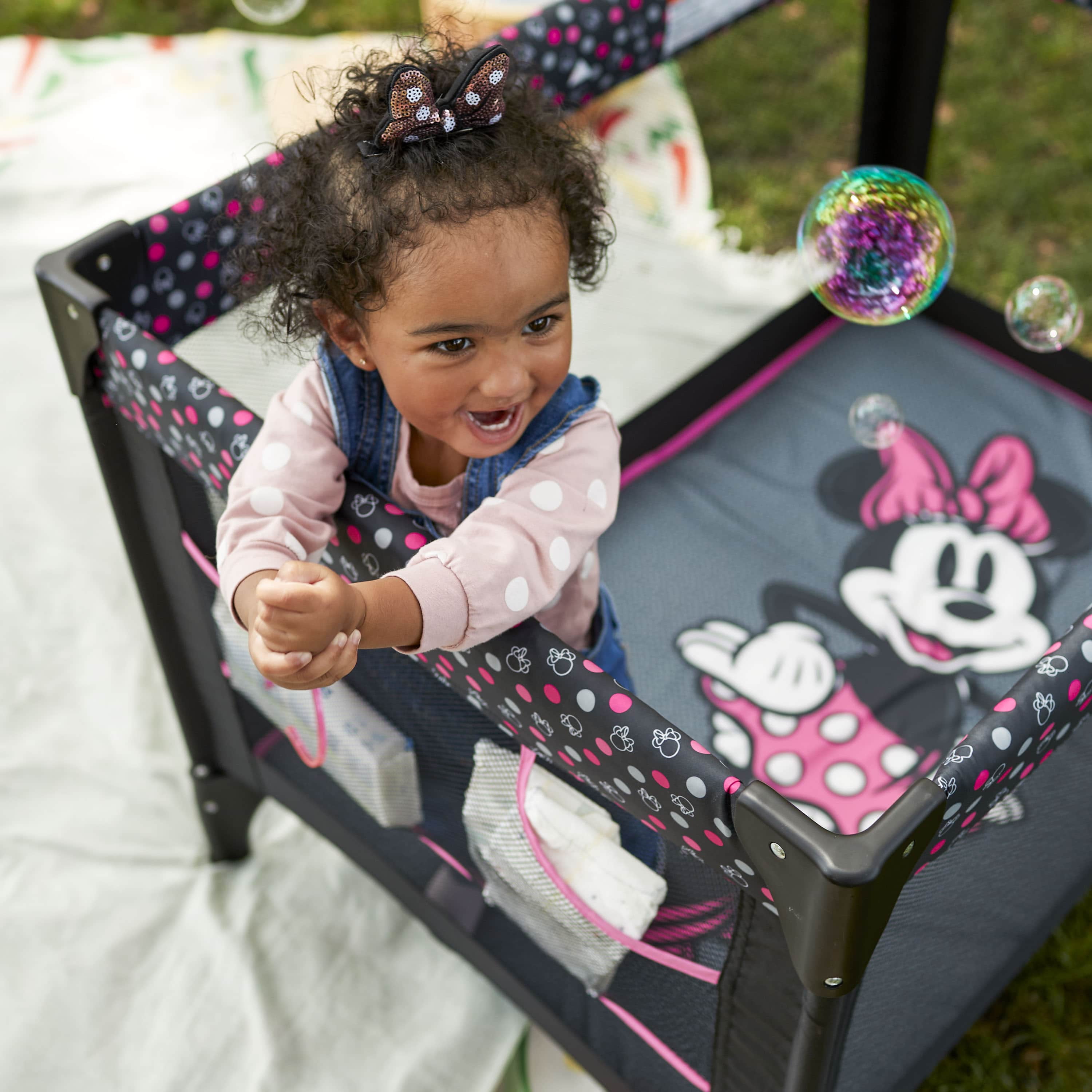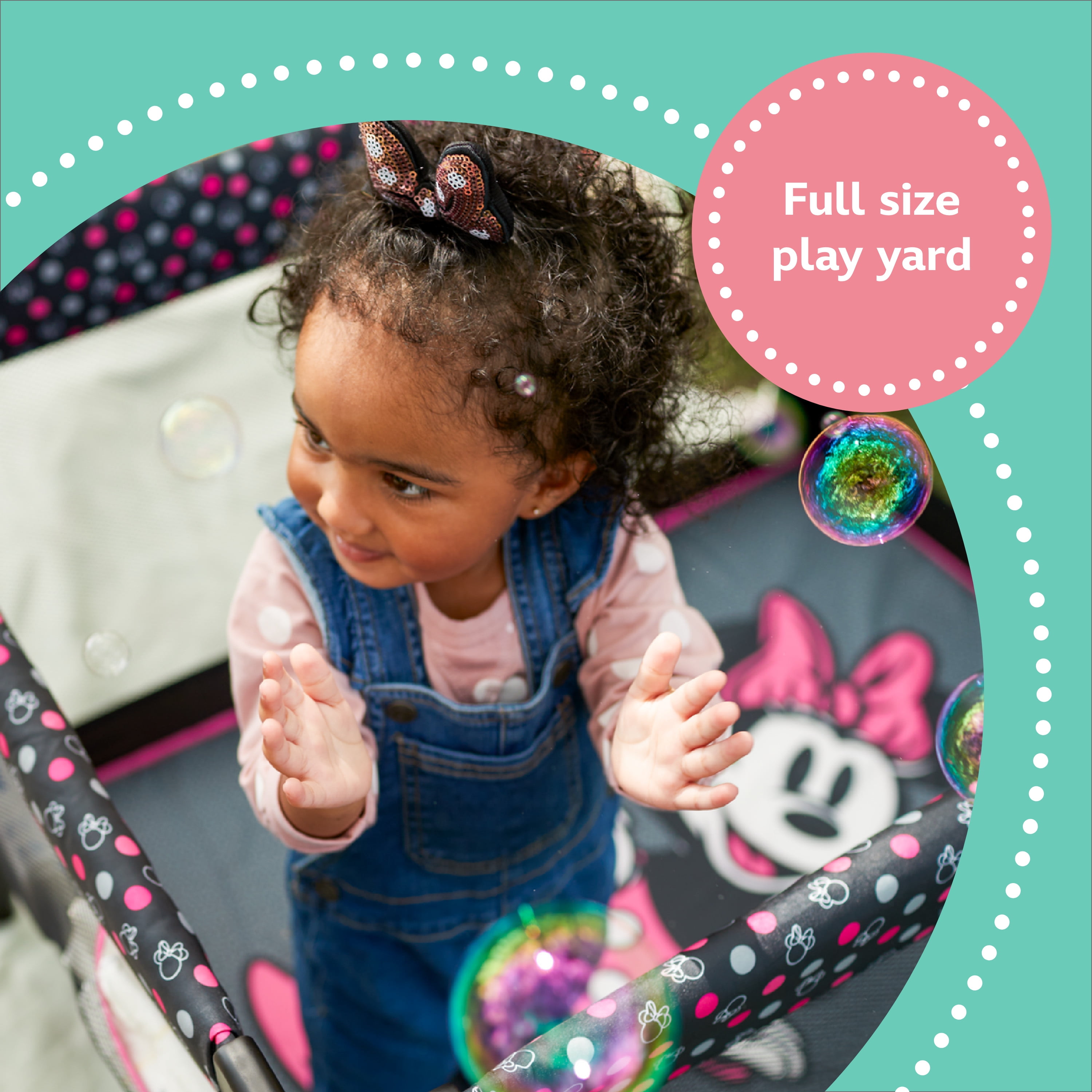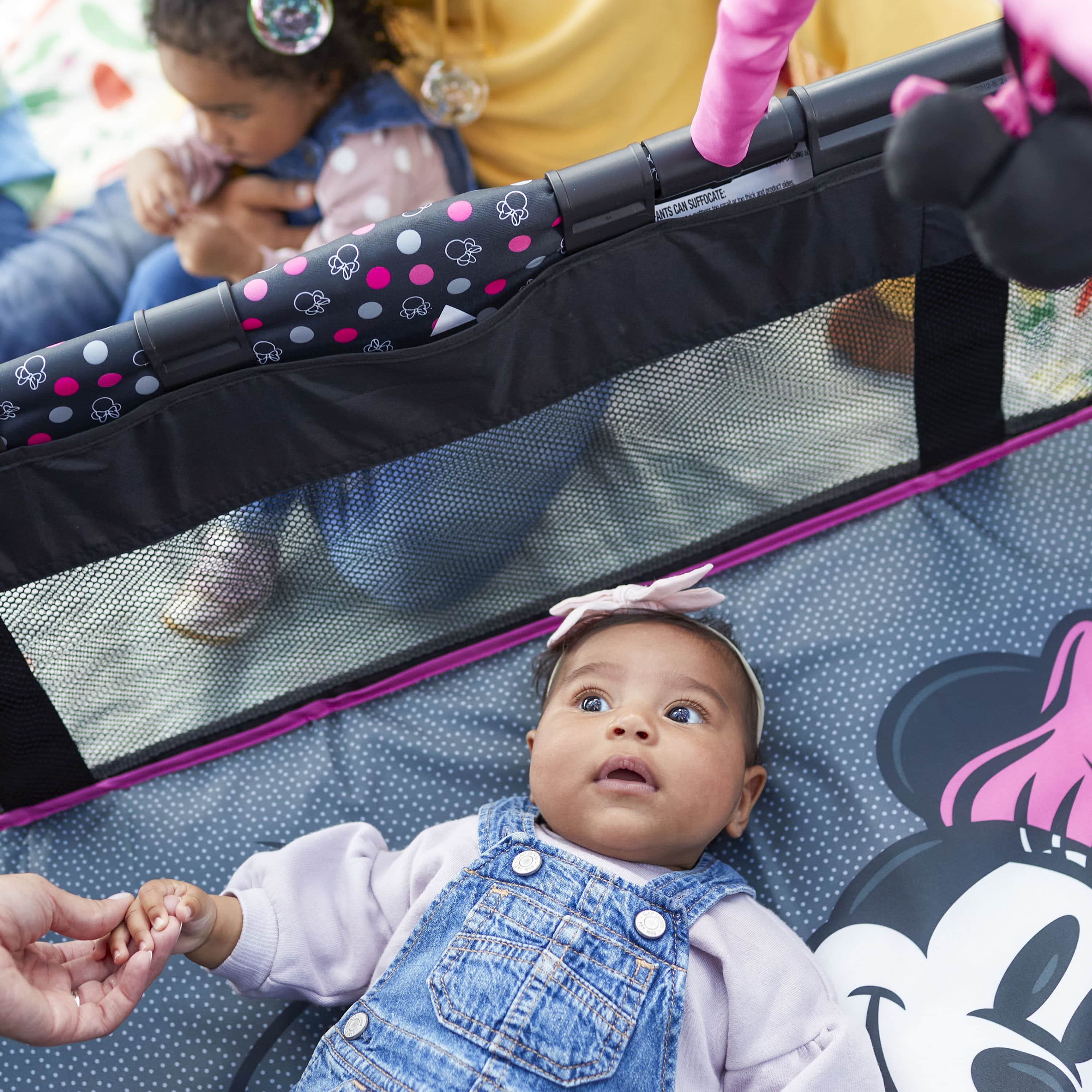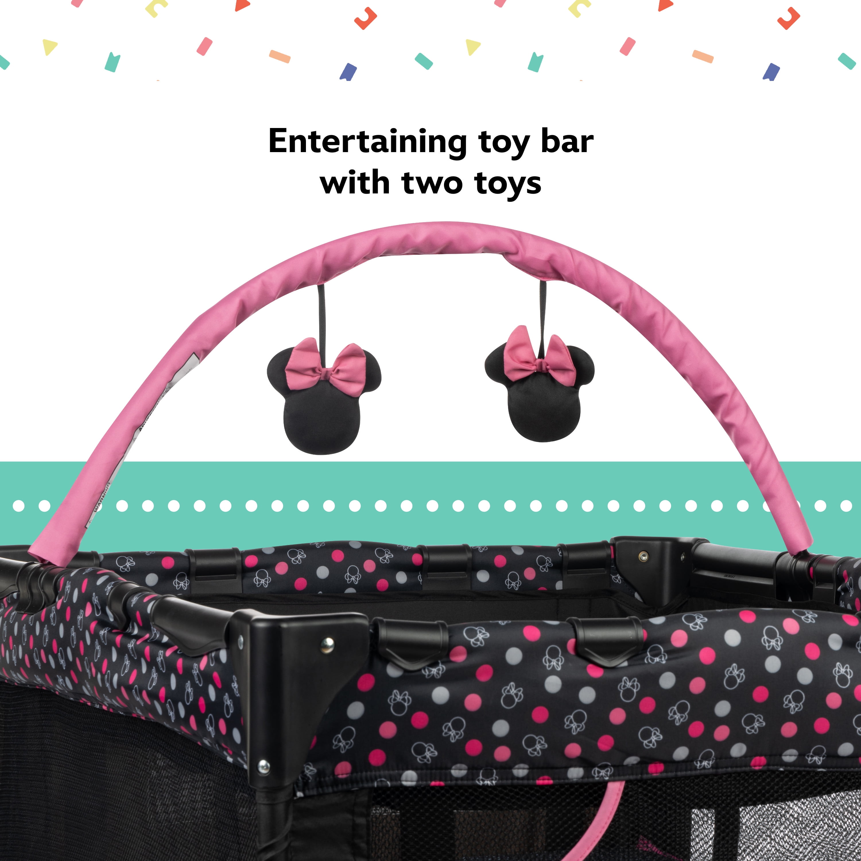 Disney Baby 3D Ultra Baby Play Yard with Bassinet and Toy Bar, Modern Minnie Full size play yard Full size bassinet Quick and compact fold for easy travel Easy to store and transport with carry bag 2 built-in wheels for mobility Breathable mesh sides allow visibility Detachable toy bar with 2 Disney-themed toys Disney-inspired pattern and colors Spacious area for naps and play Assembled Weight: 19.4 lb Color / Fashion: Modern Minnie Designed with a firm, flat sleeping surface that meets the Consumer Product Safety Commission’s recommendations for safe sleep Bassinet mode is suitable for babies up to 15 lbs., or when they begin to push themselves up on their hands and knees Play yard mode is suitable for children up 35”, or when they can climb out