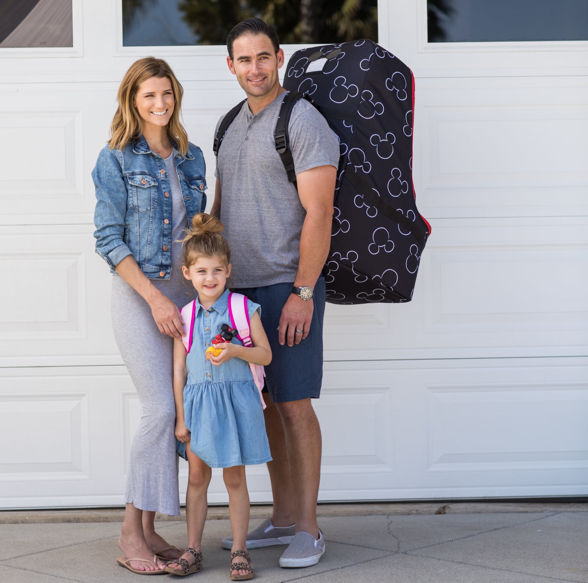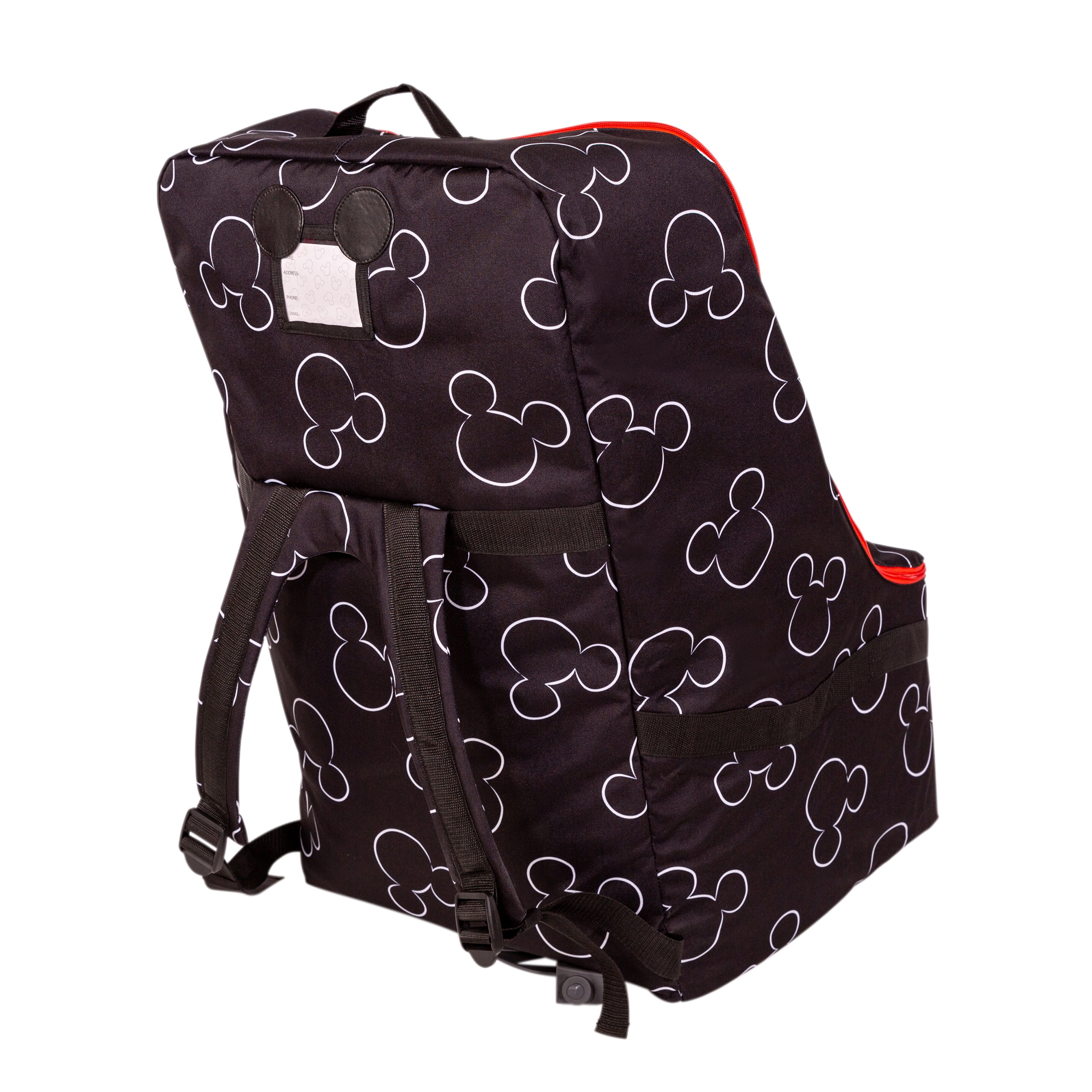 The Disney Baby by J.L. Childress Ultimate Backpack Padded Car Seat Travel Bag protects your child’s car seat when traveling and enables you to be hands-free. Perfect for checking your car seat as luggage, bringing the seat on an airplane, on cruises or as a storage bag. The padded, harness-style backpack straps are ergonomically designed to position the car seat higher on your back for comfortable carrying. Thick padding on all sides and padded interior wings protect your car seats’ safety features. Featuring a Mickey Mouse ID card pocket and ID card and adorable Mickey Mouse zipper pulls, this heavy-duty car seat travel bag will make traveling with a car seat easier and more magical! The dual-zipper opening makes it easy to put in and take out your car seat and zippers can be locked for safety. BONUS: Stuff Pouch Included! This special version includes a zippered pouch to store and organize clothes, diapers, toys and more INSIDE the Car Seat Travel Bag! Reduce your luggage fees and save money!