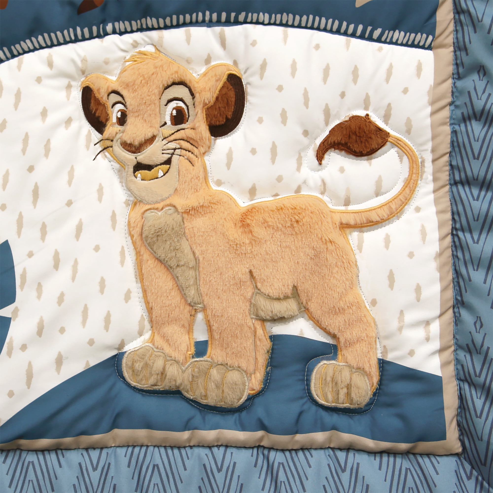 This 3-piece bedding set includes one quilt, one fitted crib sheet, and one crib skirt The quilt features Simba made in a soft furry plush with an embroidered face The fitted crib sheet features Simba, Pumbaa, and Timon tossed on a white ground with paw prints, trees and the sun The crib skirt is a pretty two-toned chevron print and is eco-friendly Coordinates with the Disney Baby Bedding Lion King Adventure Nursery Accessories