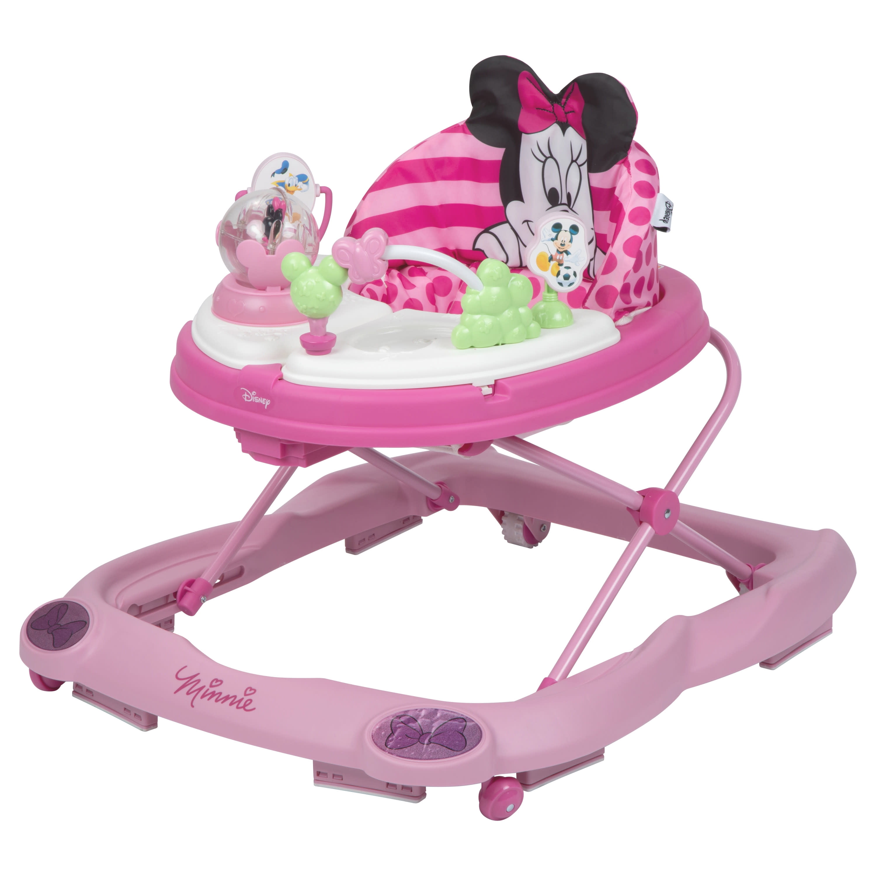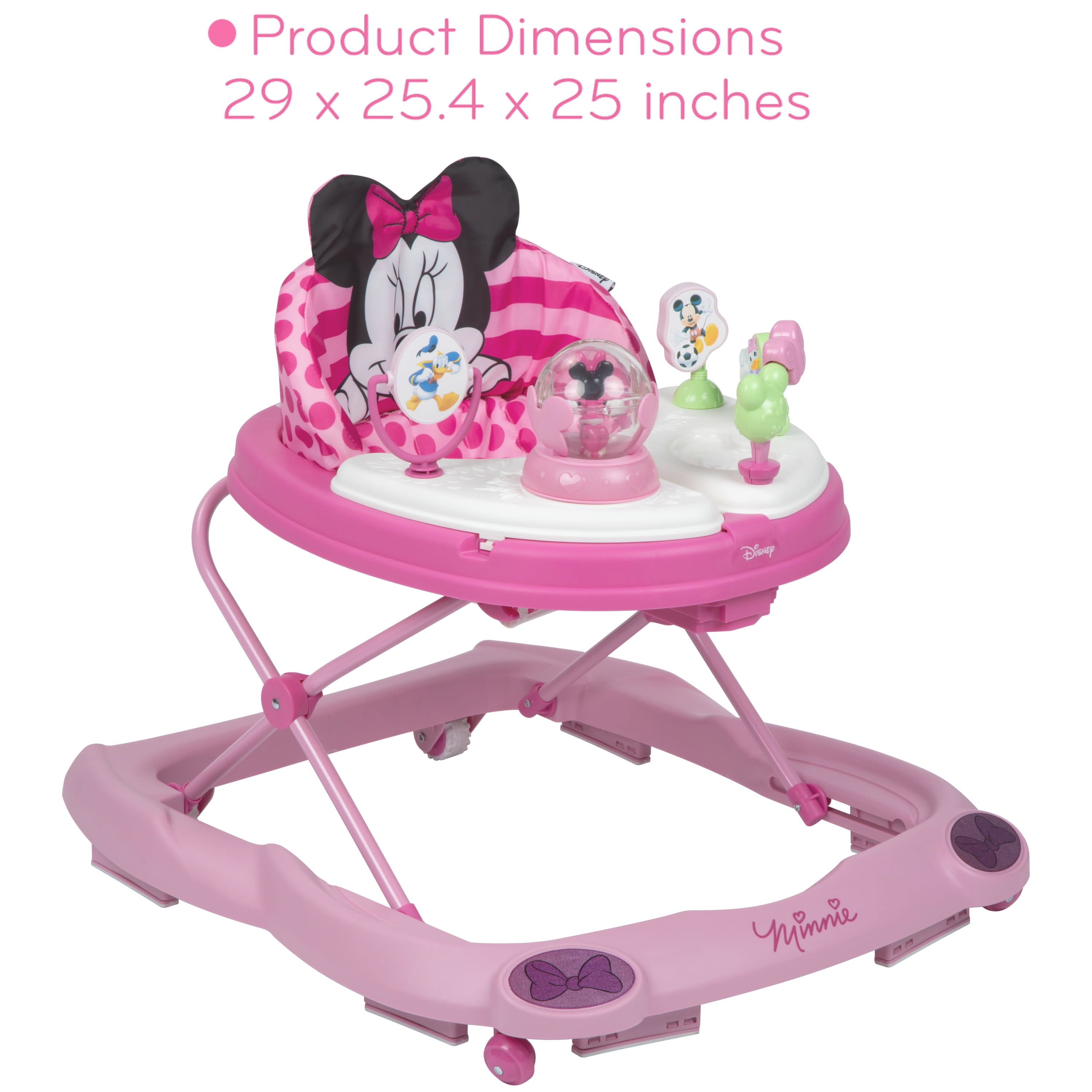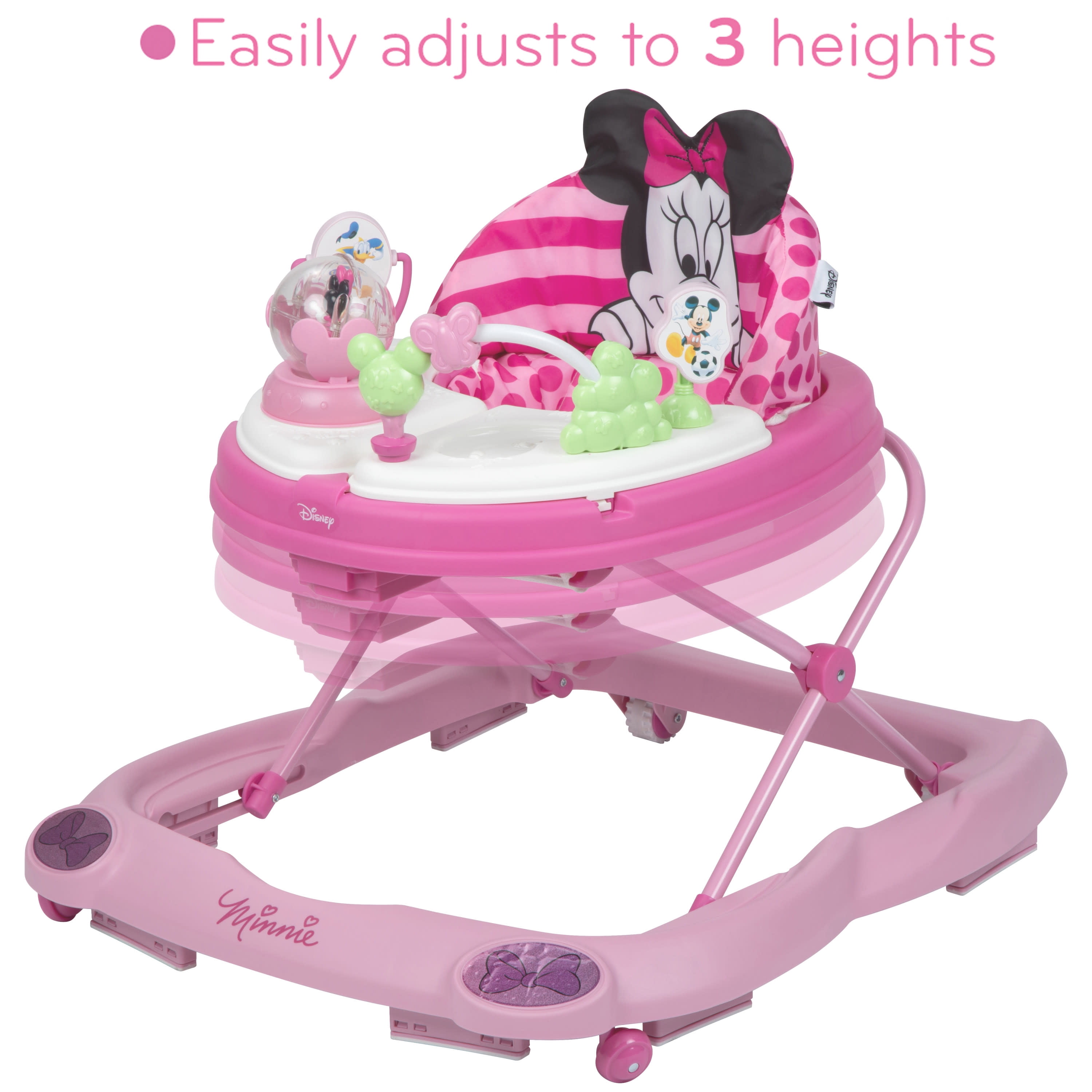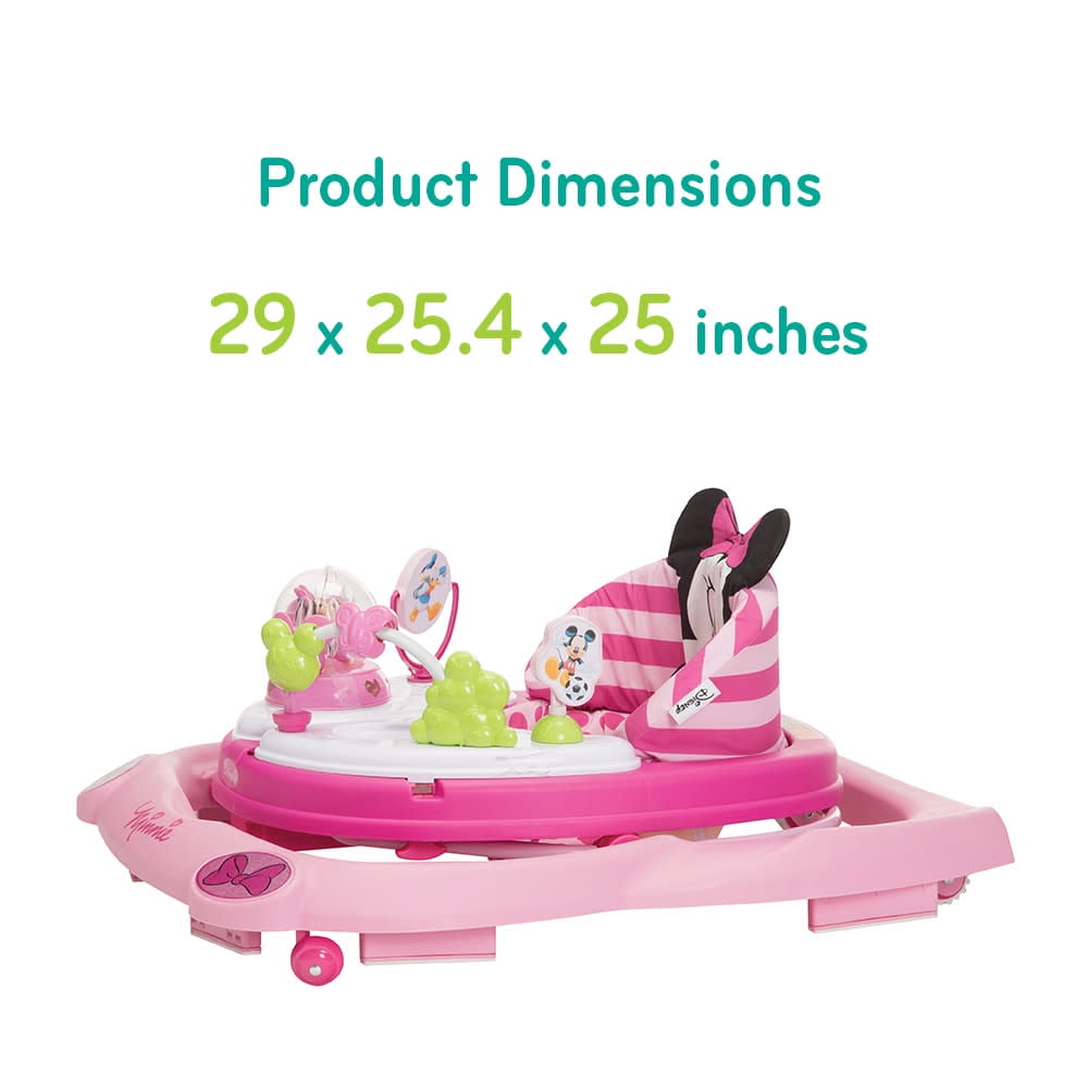 Disney Baby Minnie Mouse Music & Lights Walker, Glitter Minnie 2 swing-open activity trays with 4 fun Minnie Mouse themed toys and 12 songs 3-position height adjustment Oversized snack/play tray Sturdy wheels work on floors or carpets Grip strips reduce movement on uneven surfaces Machine washable padded seat Use only for a child who can hold their head upright unassisted and who is not able to walk or climb out of the product.