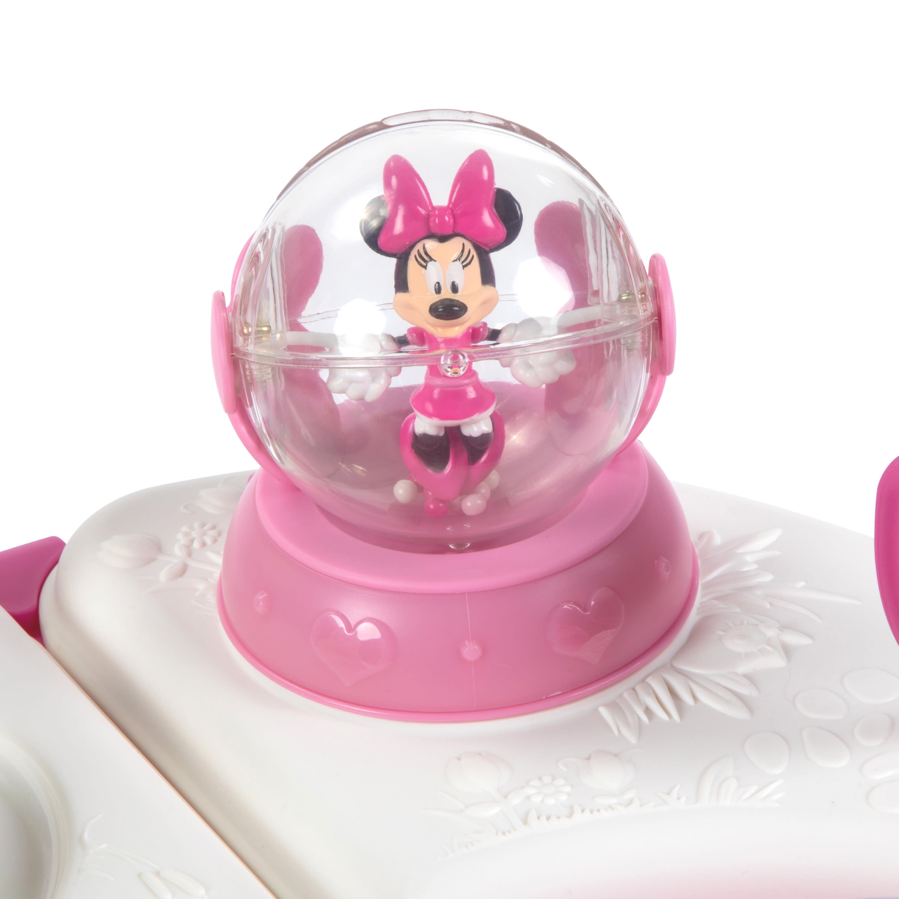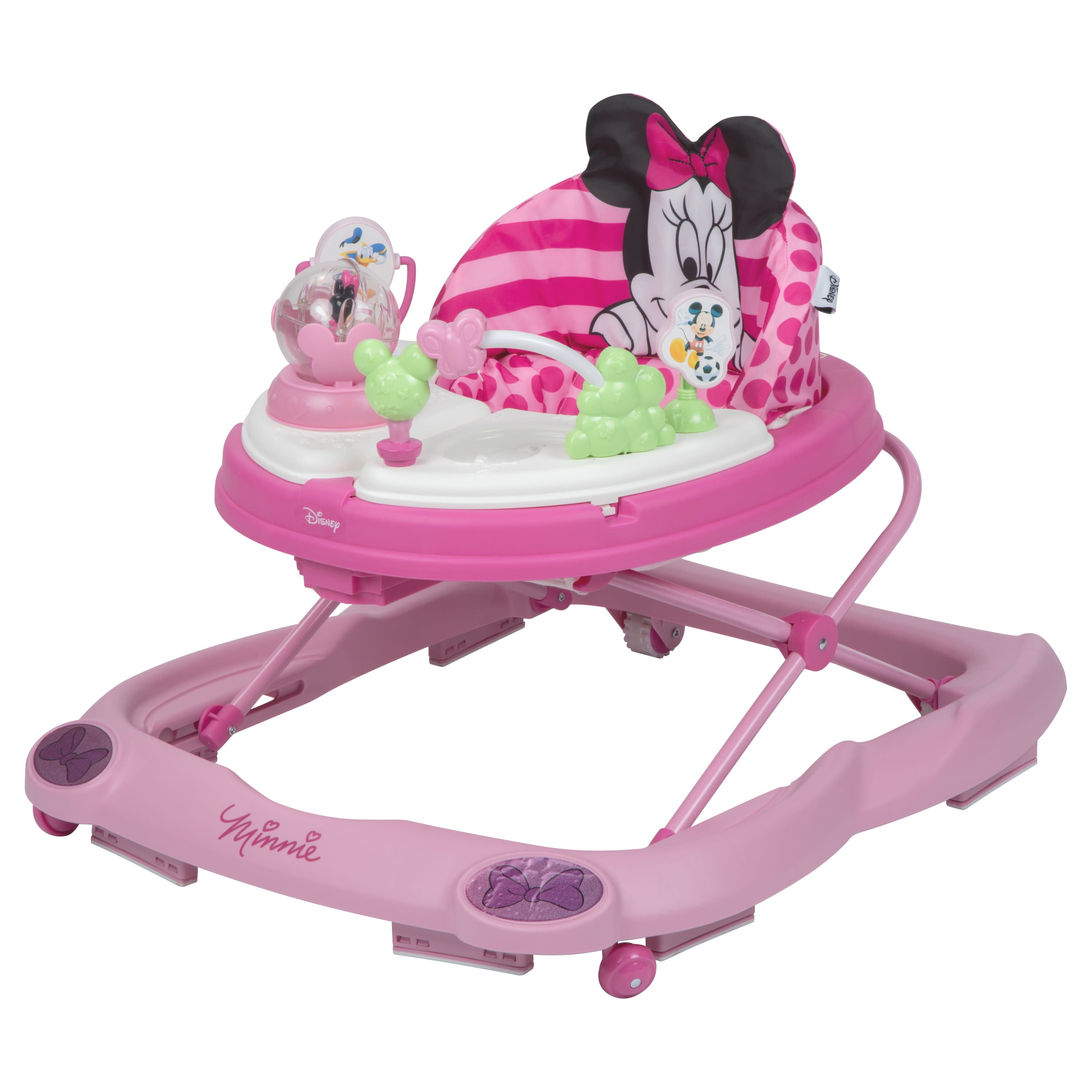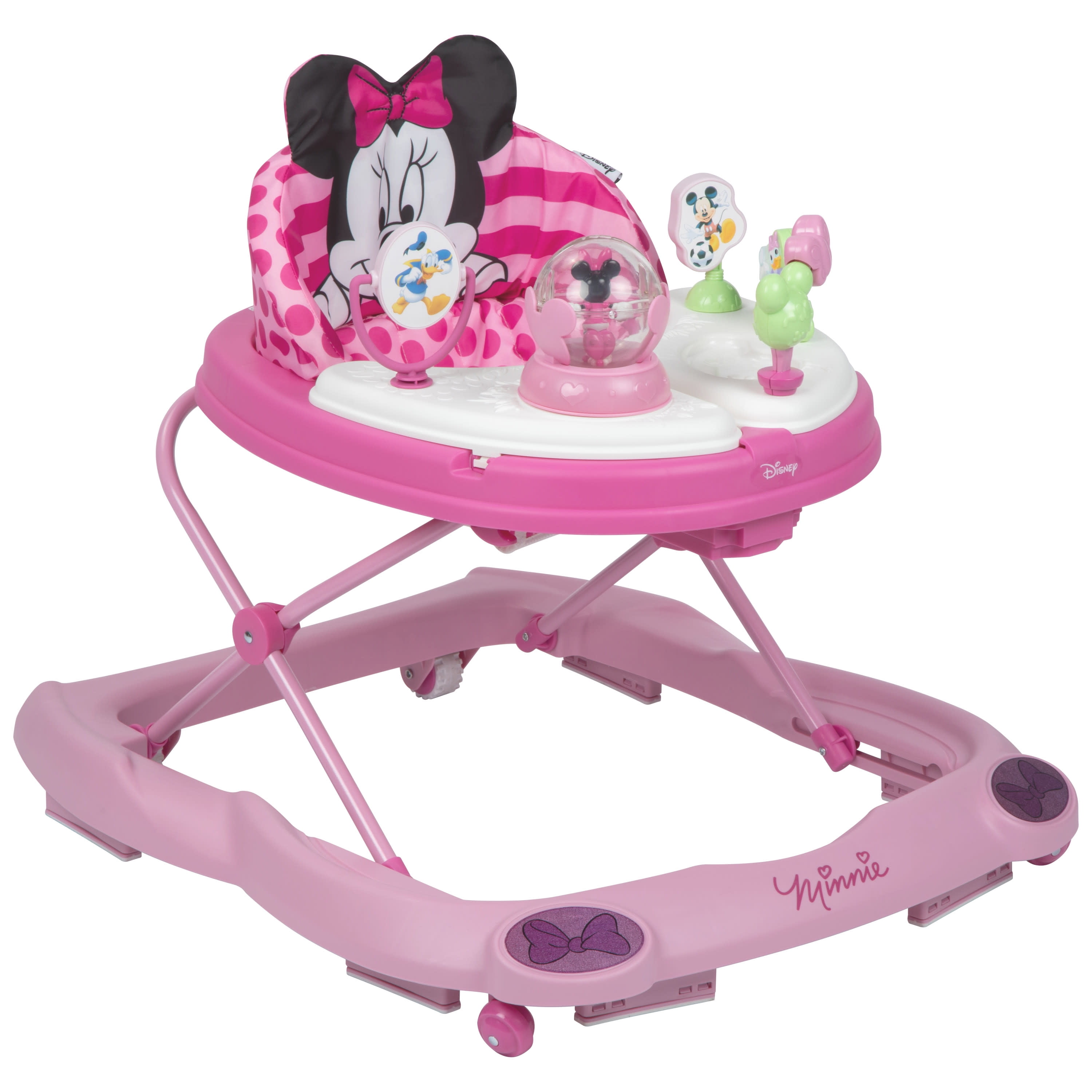 Disney Baby Minnie Mouse Music & Lights Walker, Glitter Minnie 2 swing-open activity trays with 4 fun Minnie Mouse themed toys and 12 songs 3-position height adjustment Oversized snack/play tray Sturdy wheels work on floors or carpets Grip strips reduce movement on uneven surfaces Machine washable padded seat Use only for a child who can hold their head upright unassisted and who is not able to walk or climb out of the product.