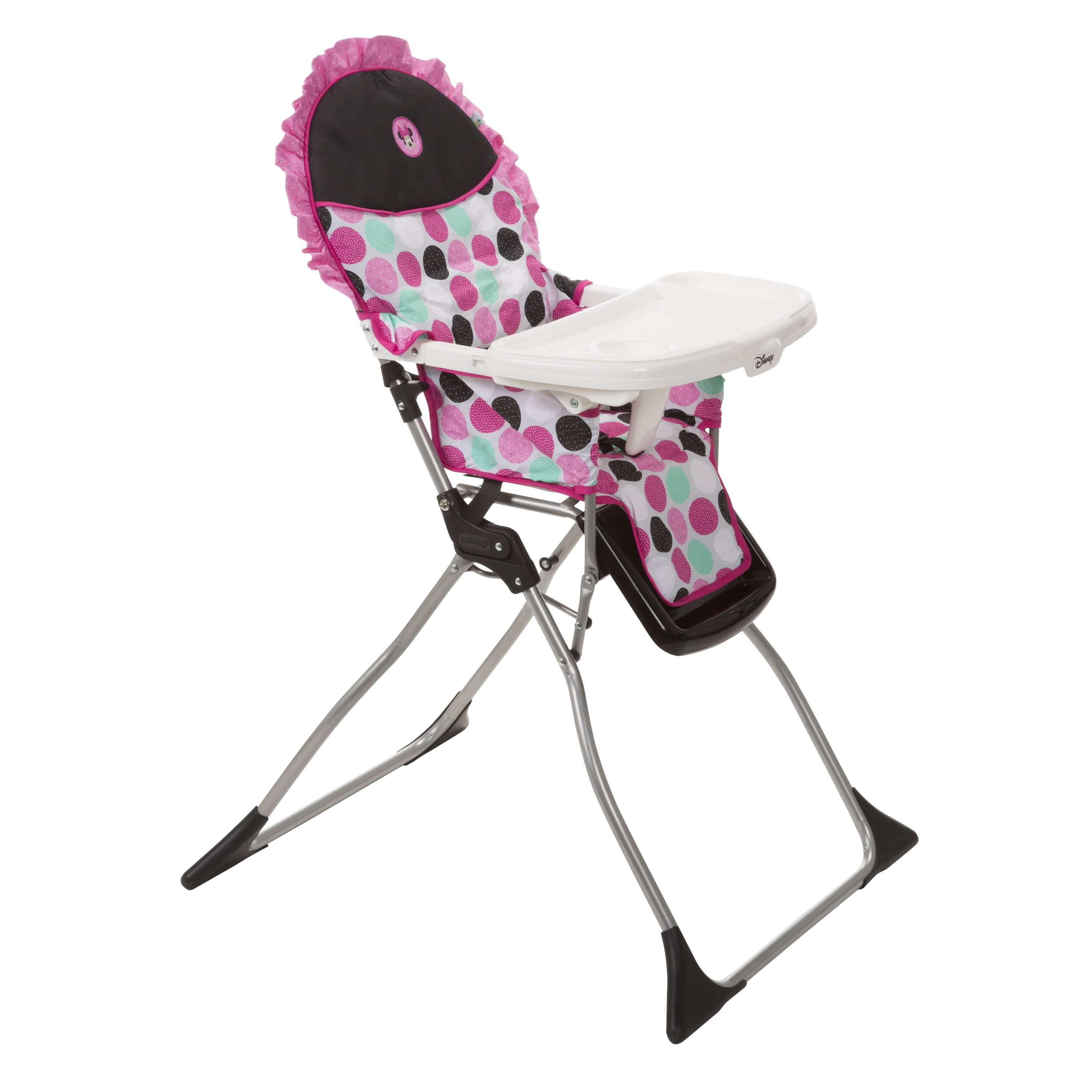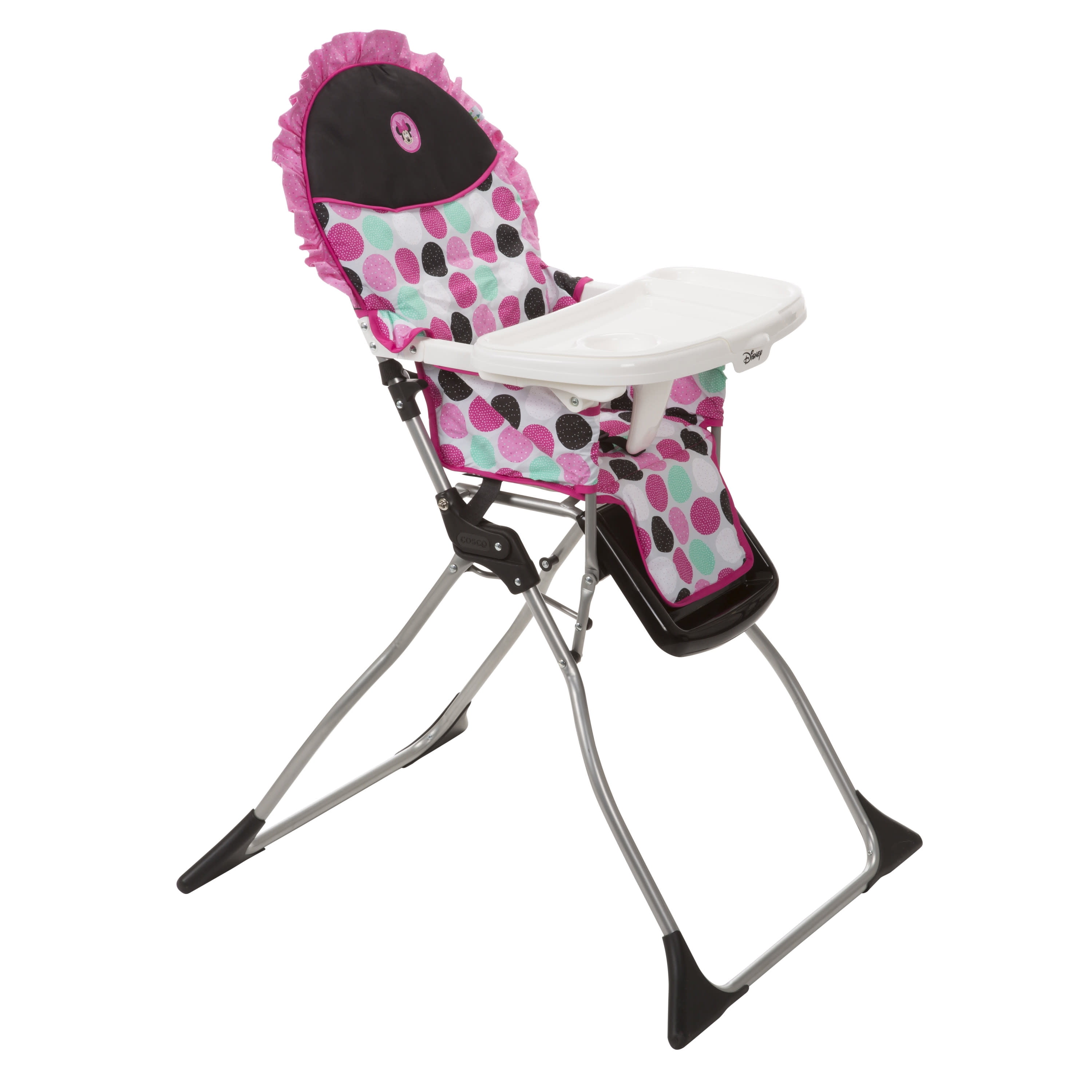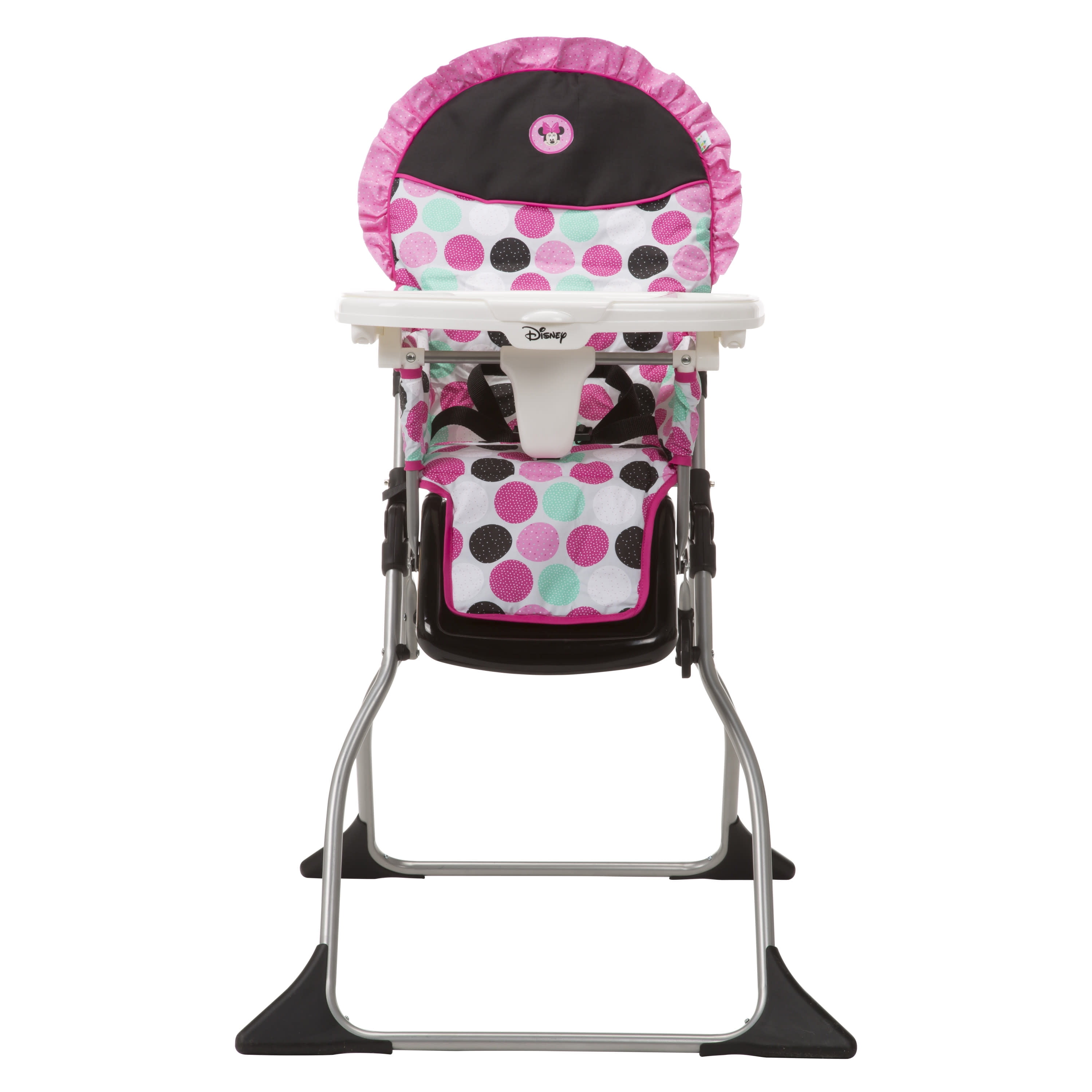 Disney Baby Simple Fold Plus High Chair, Minnie Dotty All the necessities for easy feeding Compact fold for quick and easy storage 3-position adjustable tray Dishwasher-safe insert tray Stands on its own when folded For use from 6 months and up to 50 pounds, the 3-point harness keeps your baby secure as well as your growing toddler