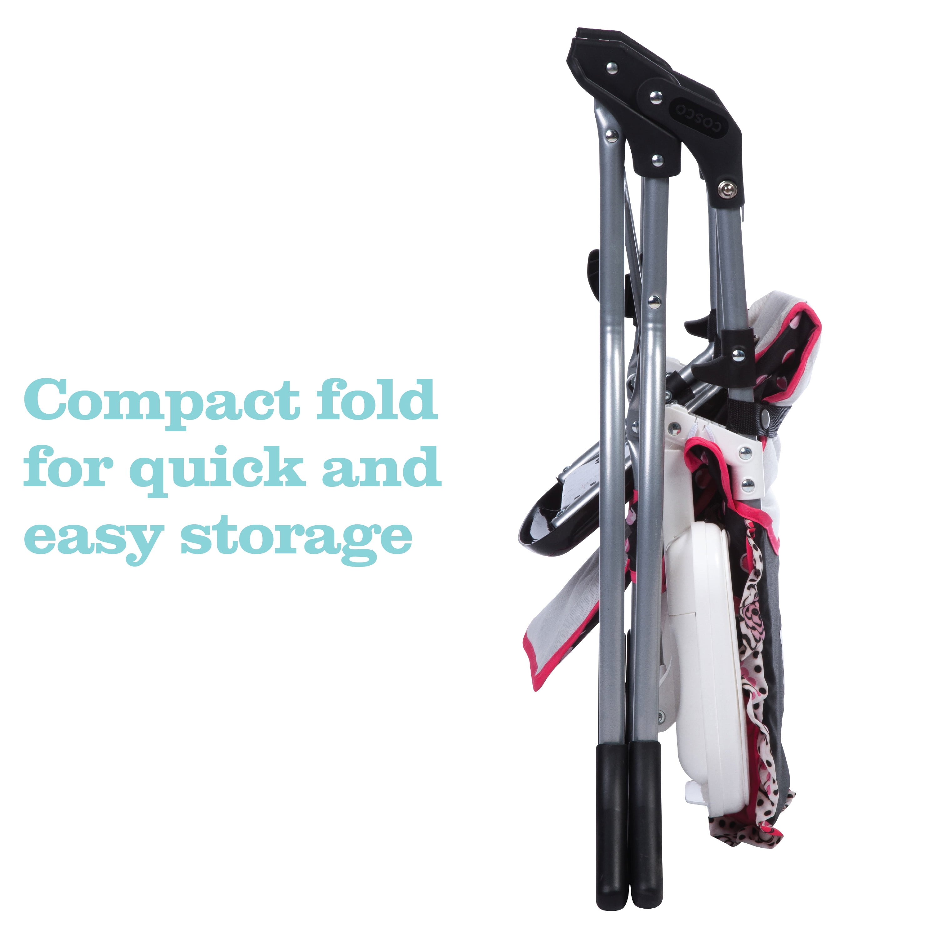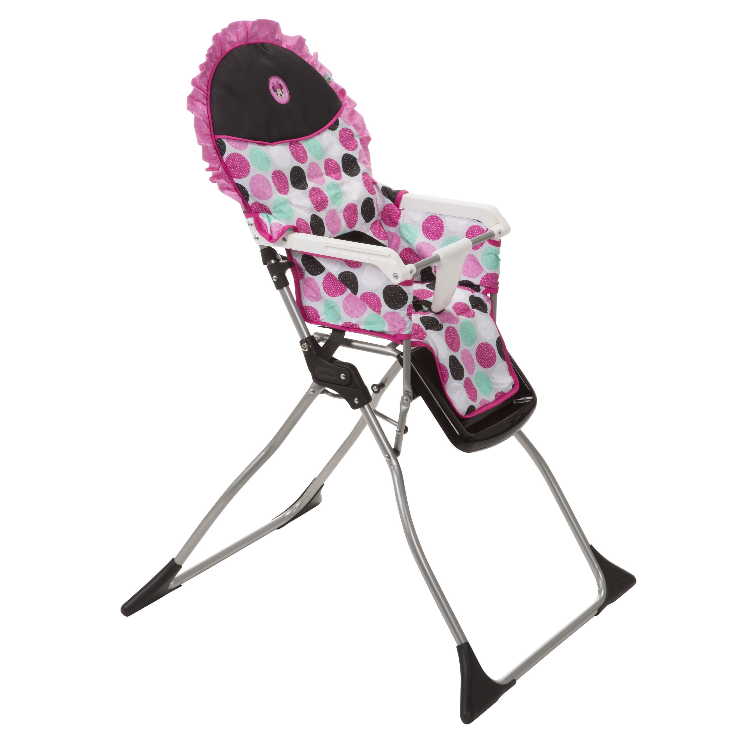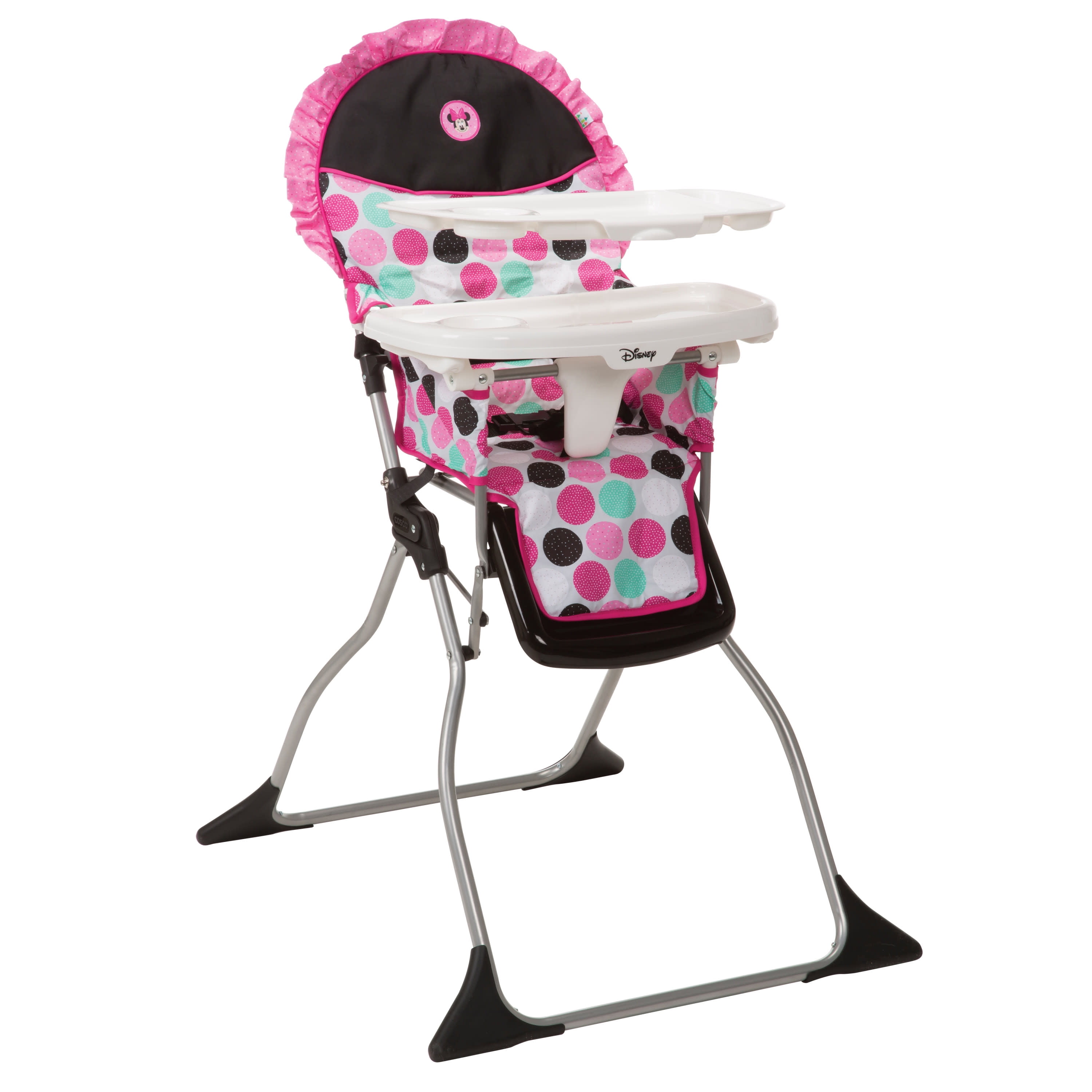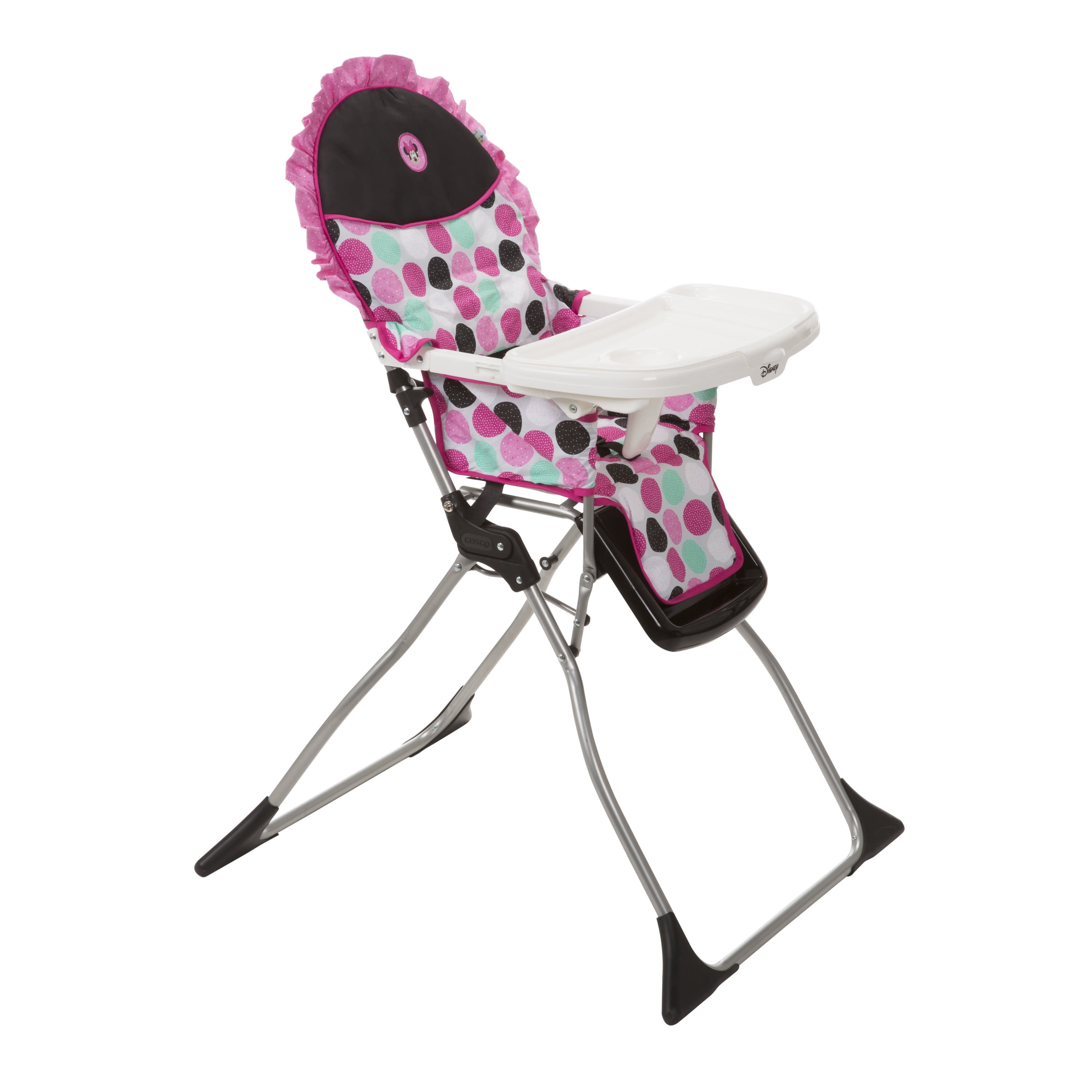 Disney Baby Simple Fold Plus High Chair, Minnie Dotty All the necessities for easy feeding Compact fold for quick and easy storage 3-position adjustable tray Dishwasher-safe insert tray Stands on its own when folded For use from 6 months and up to 50 pounds, the 3-point harness keeps your baby secure as well as your growing toddler
