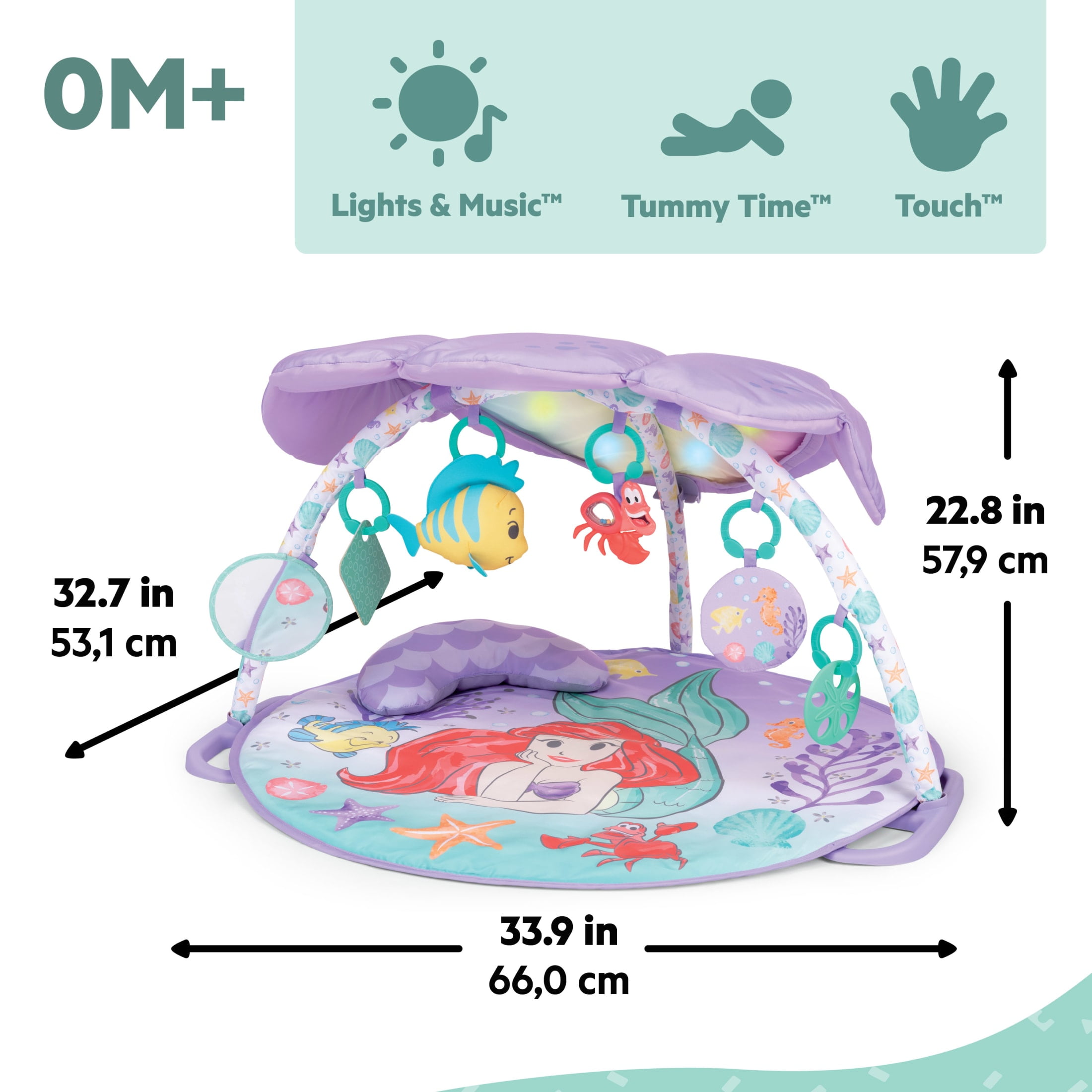 Disney The Little Mermaid Ariel Gym Lights Up: Baby will enjoy a bioluminescent light show under the rainbow seashell canopy! Twinkly lights will captivate and create an immersive experience Plays Music: Kick, wiggle and dance to 25+ minutes of engaging melodies Includes Tummy Time Prop Pillow: The purple prop pillow creates a textured coral reef for baby to explore while giving extra support during tummy time Iridescent Rainbow Seashell: The watercolor-inspired seashell canopy is made with a higher-end shimmery fabric that glistens like sunlight on the water Baby Shower Gift or Baby Gift: This activity gym and play mat is made for ages newborn and up, making it a sweet and special gift that families can enjoy from day one