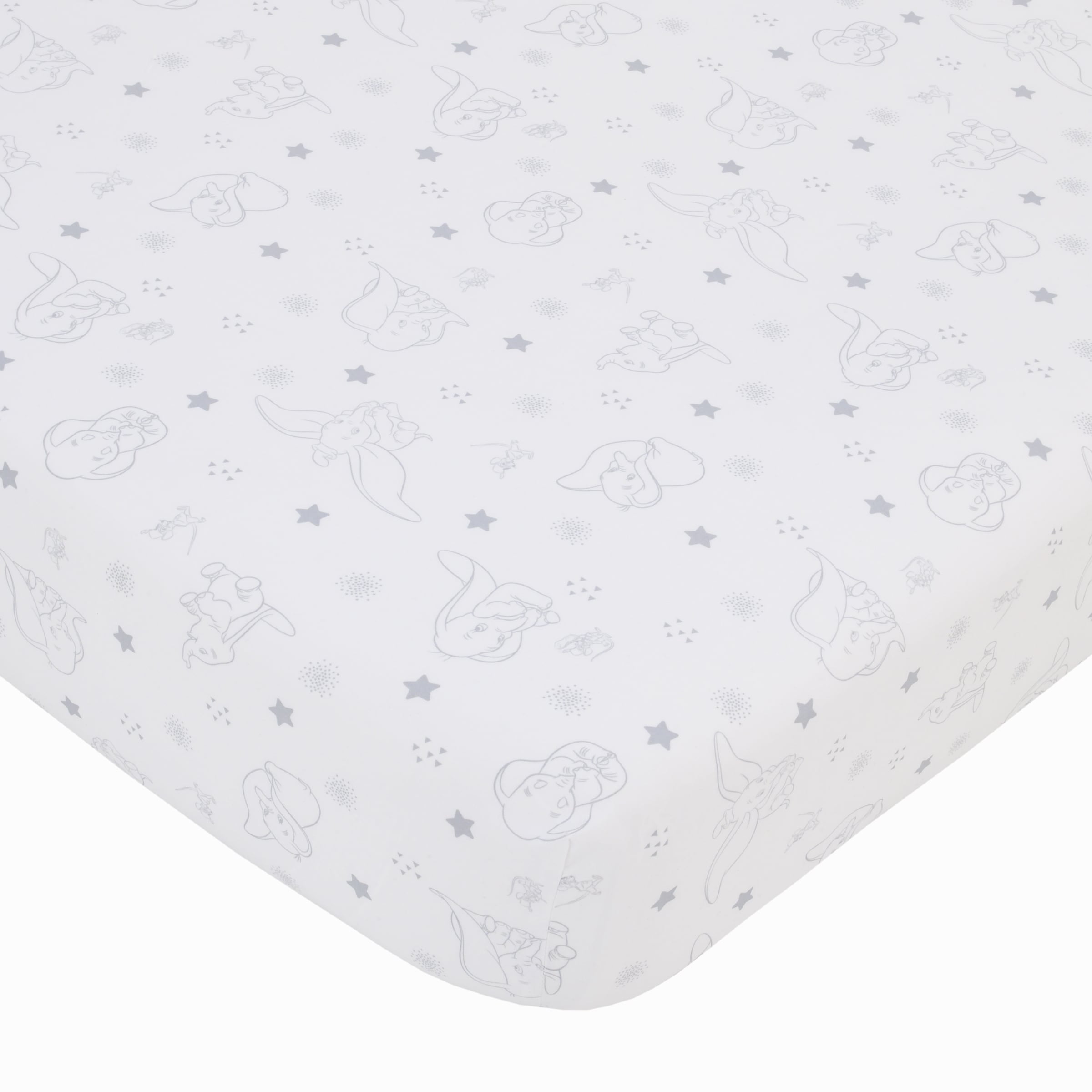 Storks have a very special delivery with the Dumbo Shine Bright Lil Star 4 Piece Crib Bedding Set! Featuring a comforter, fitted crib sheet, changing pad cover, and crib skirt; this bedding set is made of cozy soft fabrics. Precious Dumbo is set against a sky of stars, and puffy clouds, with encouraging words “Little Star Shine Bright”. Designed in shades of light blue, gray, white with yellow and orange accents. Measures 33″ x 42″. The changing pad cover has a plush light blue center panel with printed pattern along the sides, and fits a standard size pad. The crib sheet features an allover pattern of Dumbo with stars in shades of gray and white, and includes full elastic for a safe and snug fit. Measures 28″ x 52″ x 8″ and fits a standard size crib/toddler mattress. The solid light blue crib skirt has a 10″ drop. Coordinates with a full line of Disney Dumbo Shine Bright Lil Star Crib Bedding and Accessories!