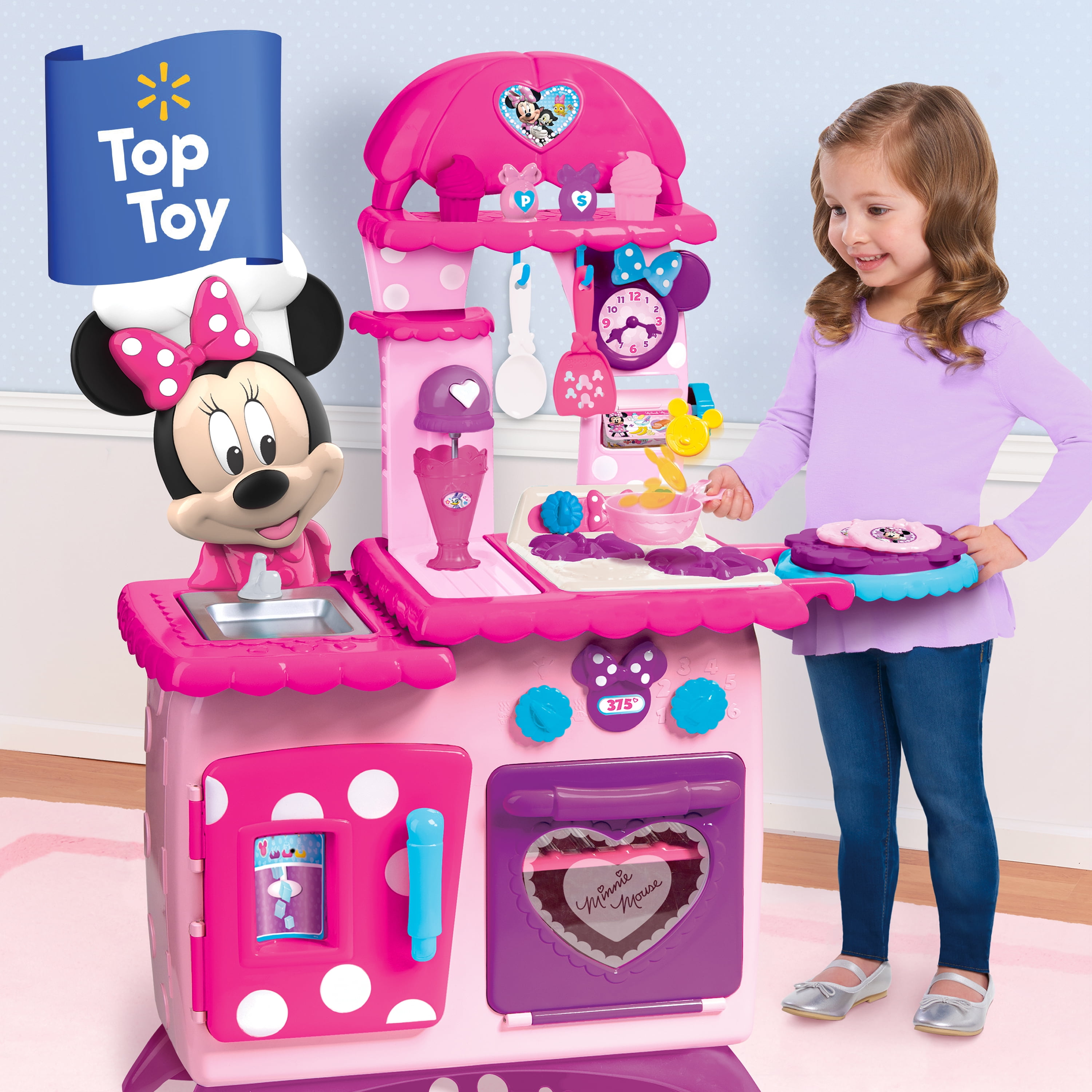 Awards and Recognitions: 2022 Toy Catalog. Whether you’re shopping for a kids toy as a gift, birthday present, or just because, the Disney Junior Minnie Mouse Flipping Fun Pretend Play Kitchen Set, Play Food, Realistic Sounds makes a wonderful surprise! Set includes: play kitchen, two plates, frying pan, large spoon, spatula, play pancake, two play cupcakes, baking tray, milkshake glass, and salt and pepper shakers. Features include: play refrigerator, pretend ice maker, play stove, working Lazy Susan, clicking knobs, and a clock with movable hands. Fun hidden kitchen reveals! Plays realistic cooking sounds. Perfect for pretend play! Adult assembly required. Ages 3+