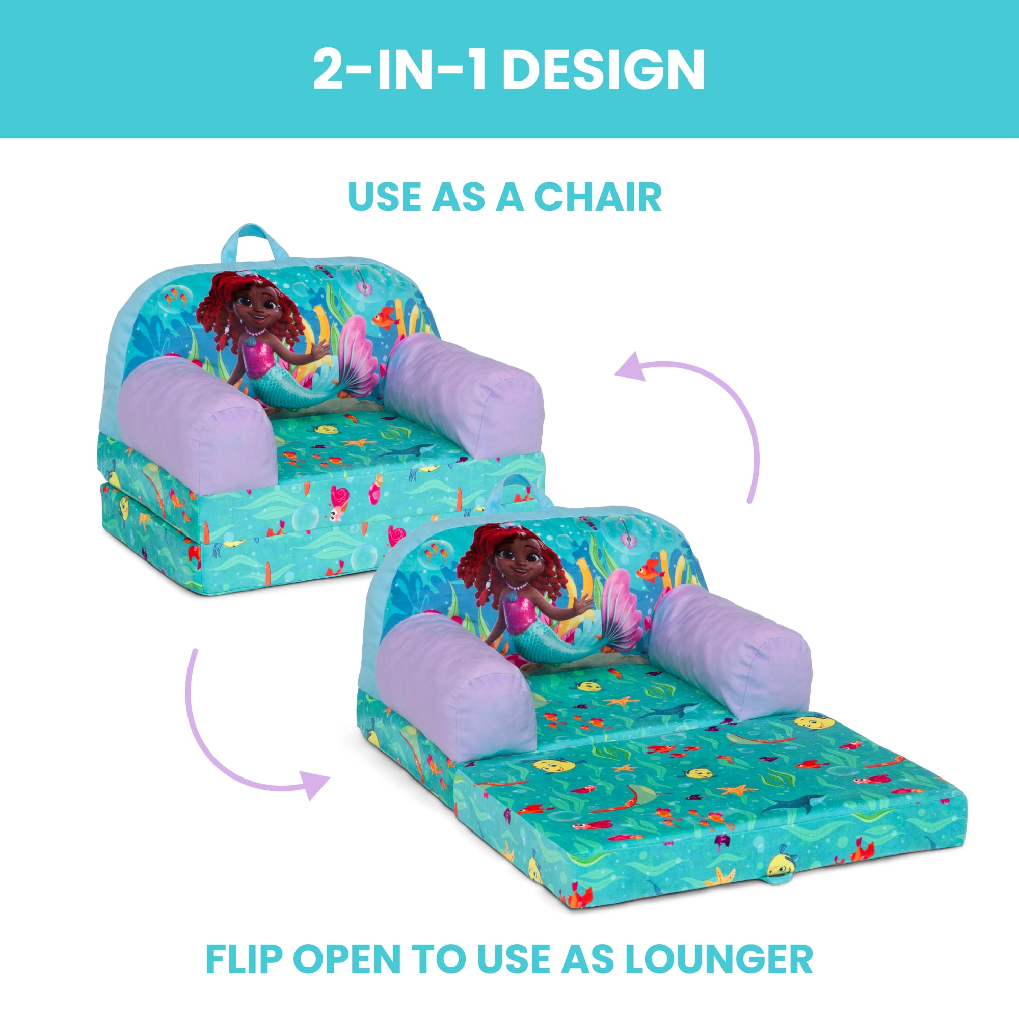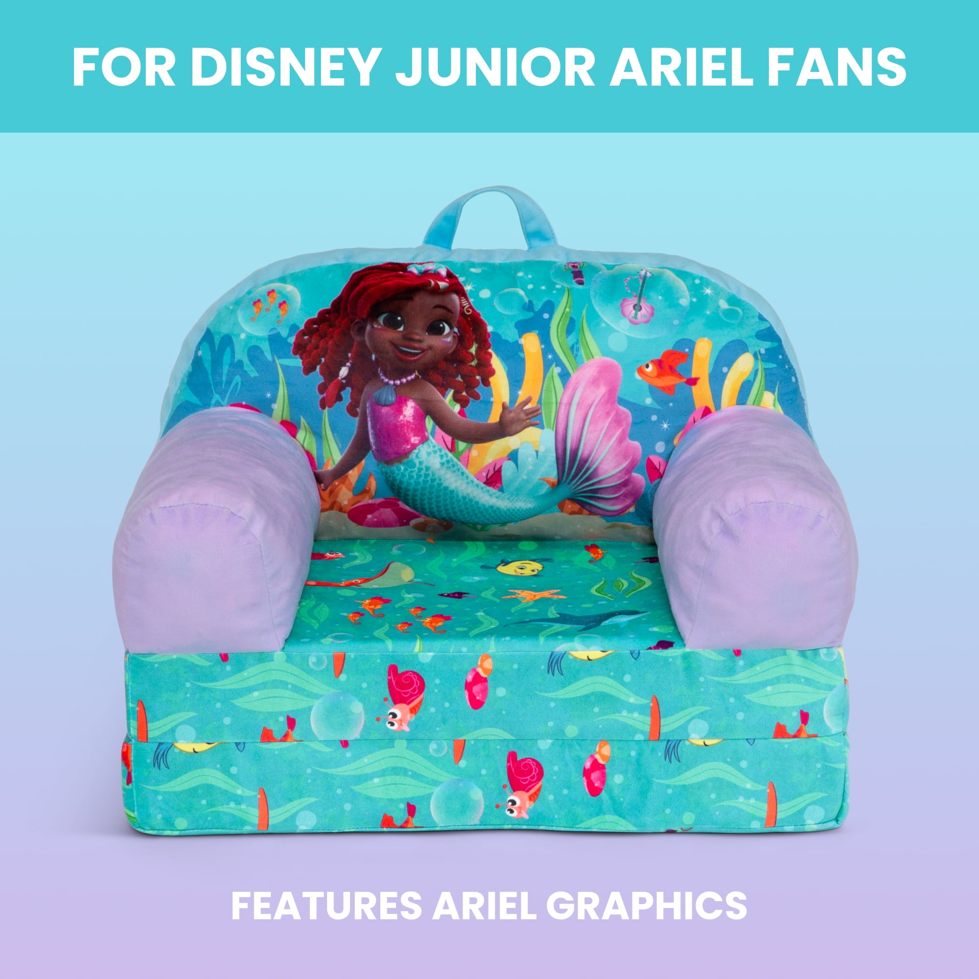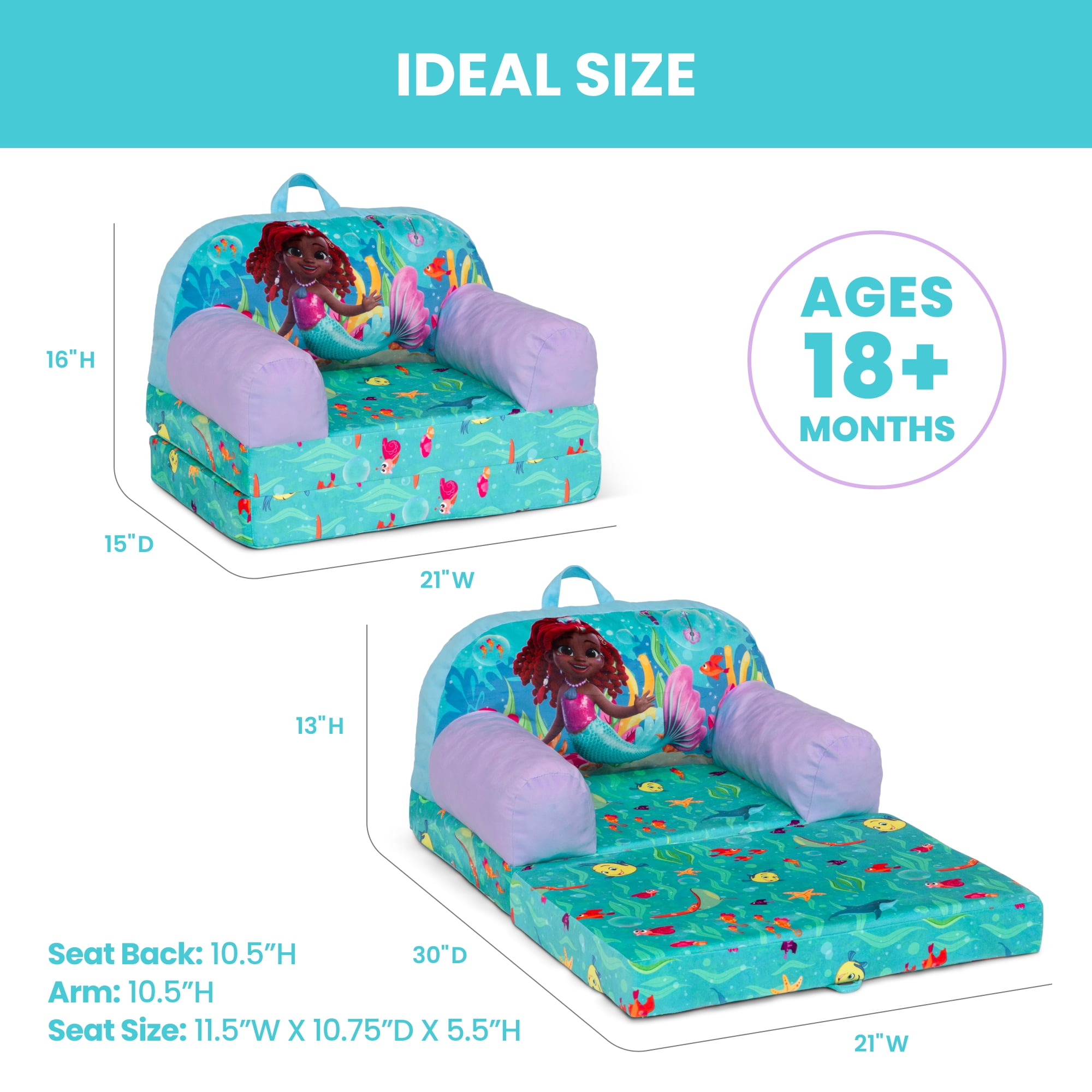 CONVERTIBLE 2-IN-1 DESIGN: This flip-out chair converts to a lounger/sleeper| Ideal for reading, relaxing, playing or sleeping GREENGUARD GOLD CERTIFIED: This chair meets the most stringent chemical emissions standards to create a healthier home for your child. Tested for more than 10,000 chemicals and VOCs, this chair is certified to contribute to cleaner indoor air COMFY FOAM CONSTRUCTION: Supportive foam keeps its shape and provides all-day comfort | Lightweight chair is portable and has a handle for easy toting from room to room | Ideal toddler chair for bedrooms, playrooms, gaming or studying SAFE OPTION: Chair meets or exceeds government and ASTM safety standards SIZE: Chair size: 21”W x 15”D x 16”H; Unfolded: 21”W x 30”D x 13”H; Seat size: 11.5”W x 10.75”D x 5.5”H; Seat back: 10.5”H; Arm: 10.5”H | Recommended for ages 18 months+ FOR JUNIOR’S ARIEL FANS: This plush chair features colorful Junior’s Ariel graphics | This chair will be your child’s cuddly companion for reading, relaxing or snuggling