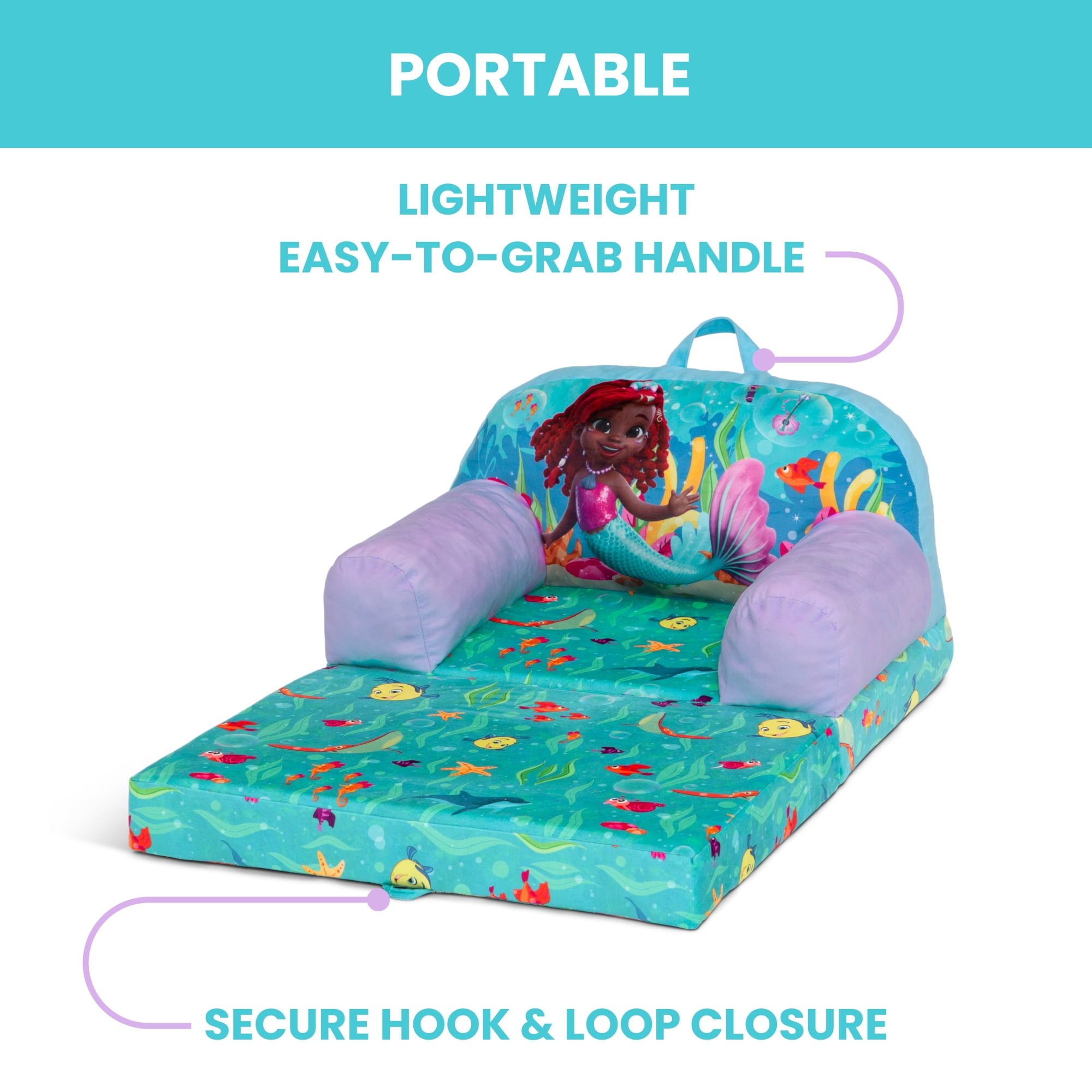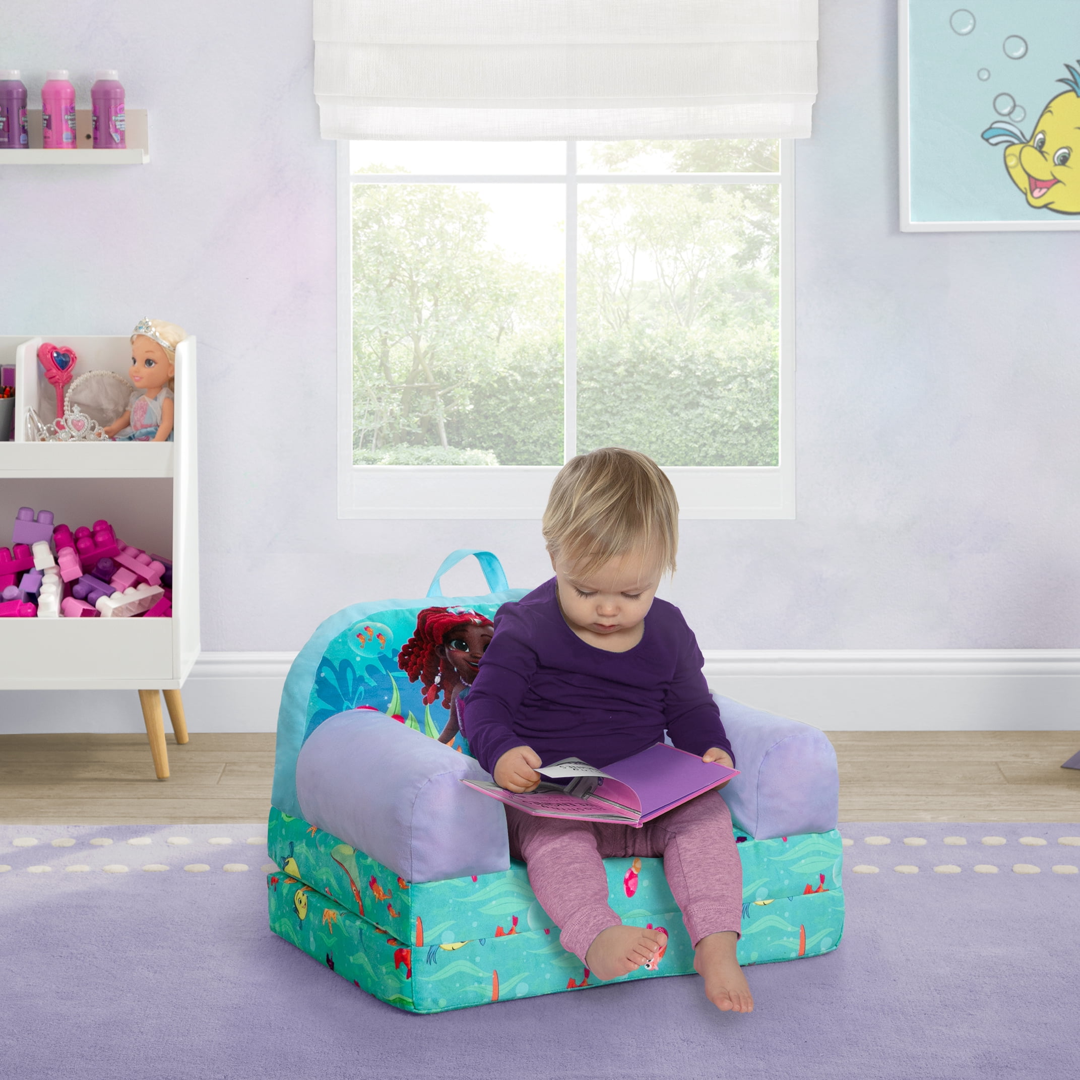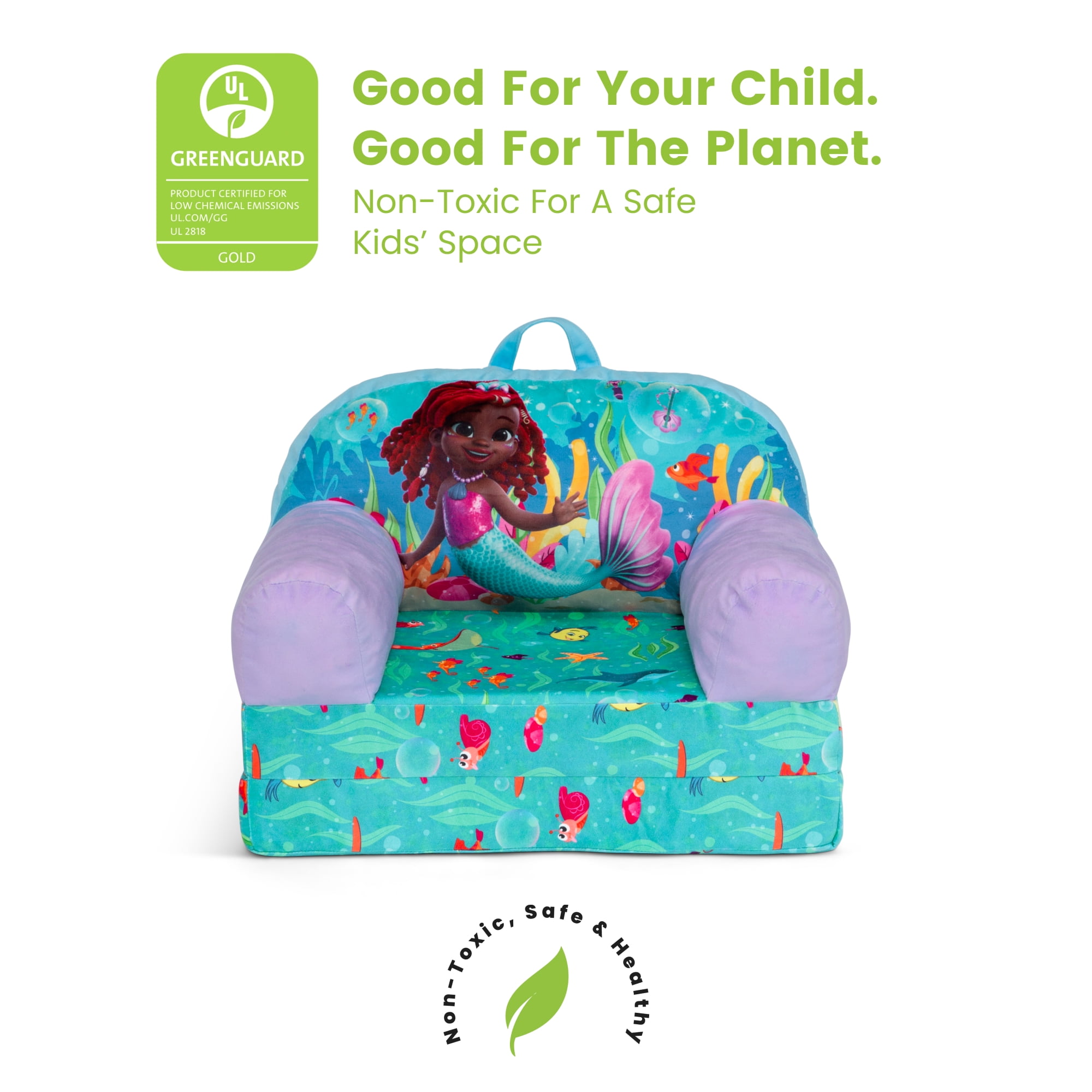 CONVERTIBLE 2-IN-1 DESIGN: This flip-out chair converts to a lounger/sleeper| Ideal for reading, relaxing, playing or sleeping GREENGUARD GOLD CERTIFIED: This chair meets the most stringent chemical emissions standards to create a healthier home for your child. Tested for more than 10,000 chemicals and VOCs, this chair is certified to contribute to cleaner indoor air COMFY FOAM CONSTRUCTION: Supportive foam keeps its shape and provides all-day comfort | Lightweight chair is portable and has a handle for easy toting from room to room | Ideal toddler chair for bedrooms, playrooms, gaming or studying SAFE OPTION: Chair meets or exceeds government and ASTM safety standards SIZE: Chair size: 21”W x 15”D x 16”H; Unfolded: 21”W x 30”D x 13”H; Seat size: 11.5”W x 10.75”D x 5.5”H; Seat back: 10.5”H; Arm: 10.5”H | Recommended for ages 18 months+ FOR JUNIOR’S ARIEL FANS: This plush chair features colorful Junior’s Ariel graphics | This chair will be your child’s cuddly companion for reading, relaxing or snuggling