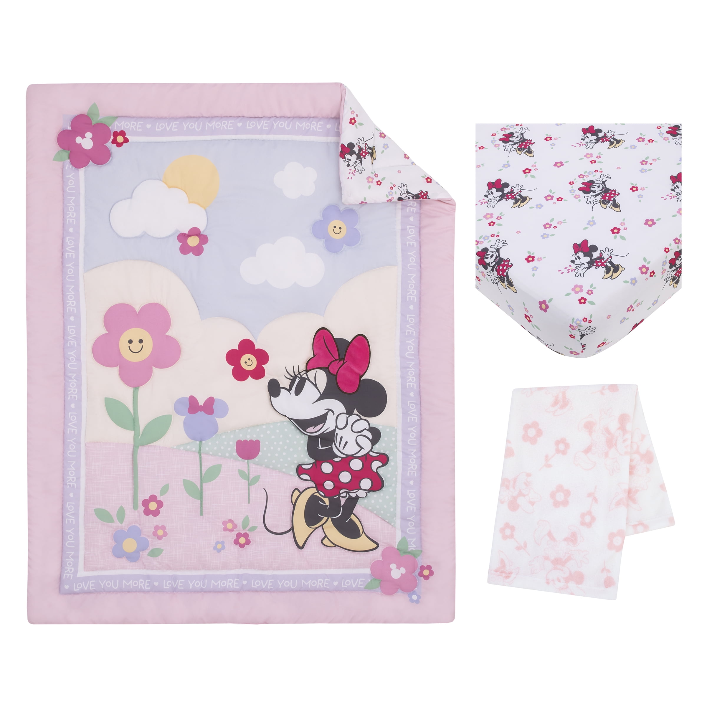 100% Polyester Includes a comforter, fitted crib sheet, and allover print blanket The adorable fitted crib sheet is fully elasticized for a safe and snug fit Design feature Disney Minnie Mouse