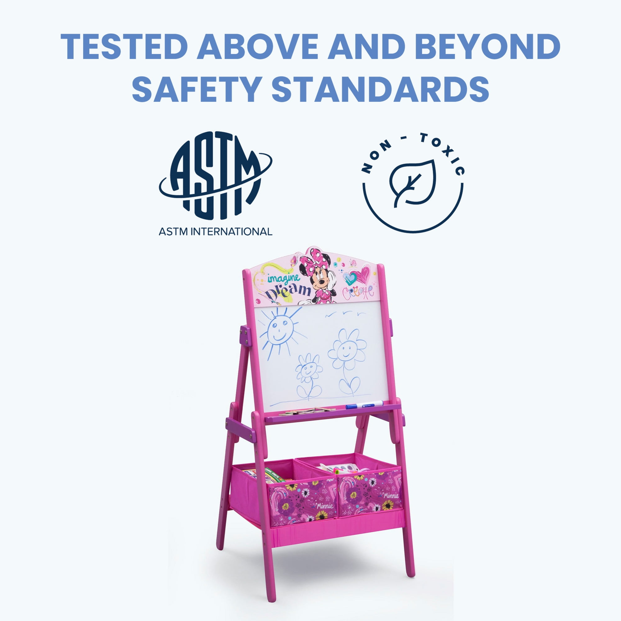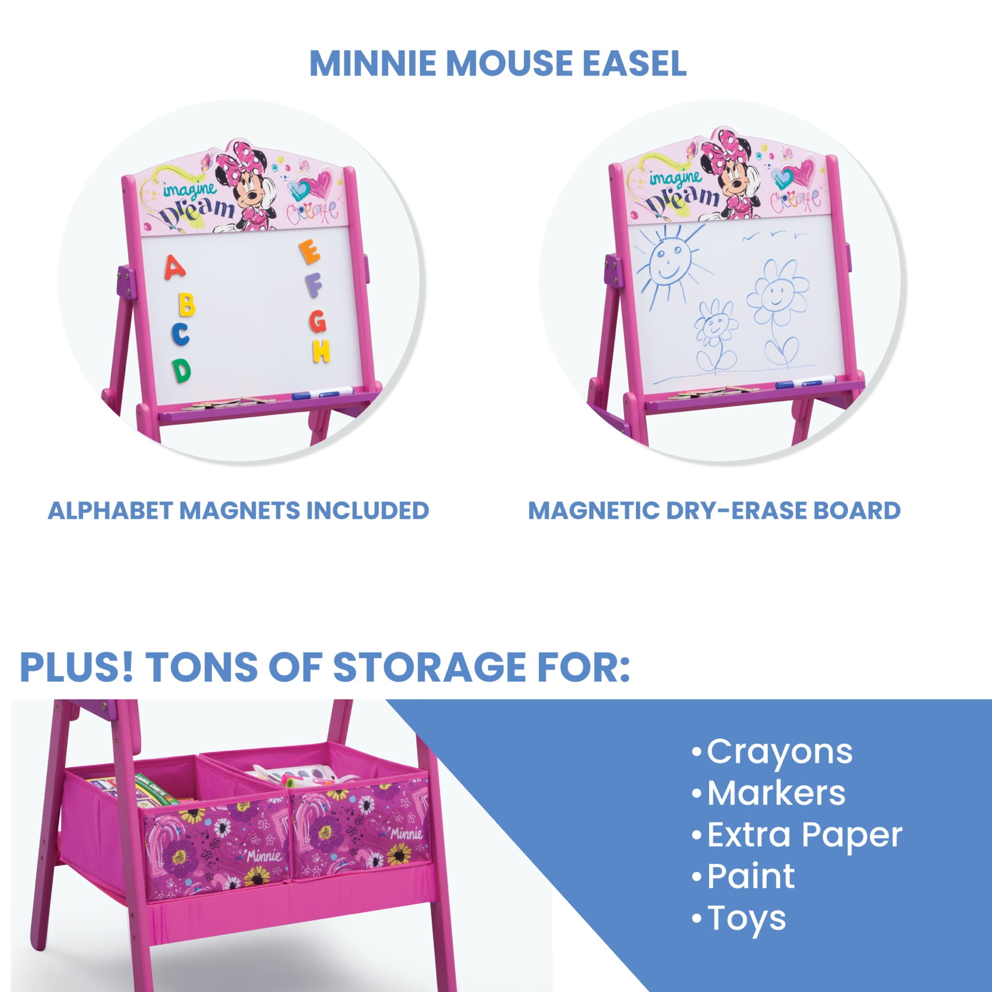 Disney Minnie Mouse Activity Easel with Storage by Delta Children: Includes a magnetic dry erase surface, 2 storage bins and alphabet magnets Strong and sturdy wood construction Fabric bins Assembled dimensions: 20.5″L x 21″W x 45″H Meets or exceeds all safety standards set by the CPSC Features fun Minnie Mouse graphics