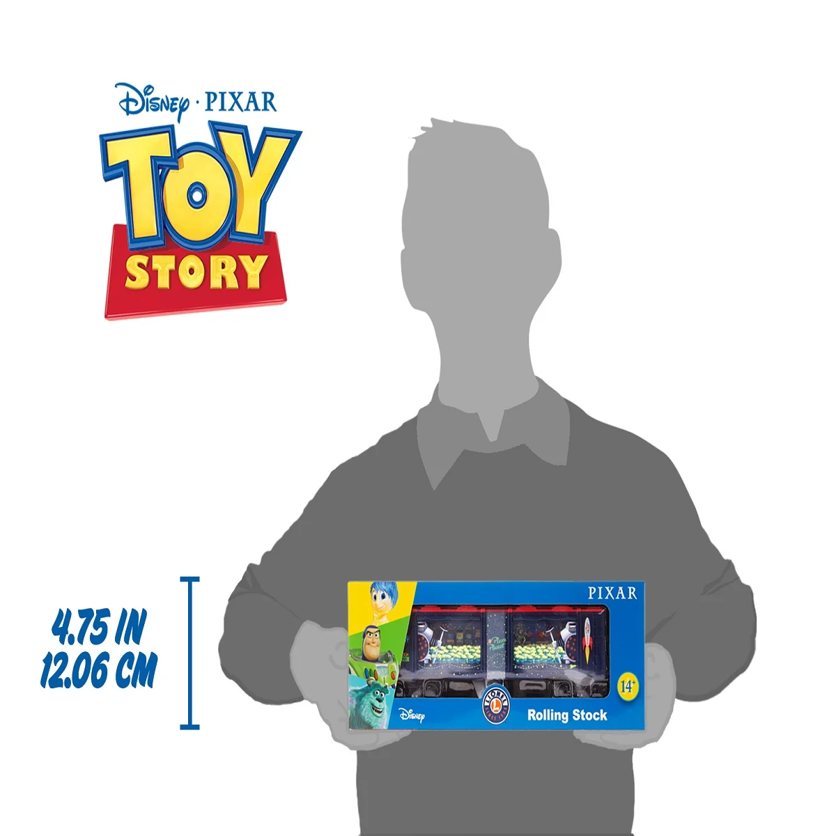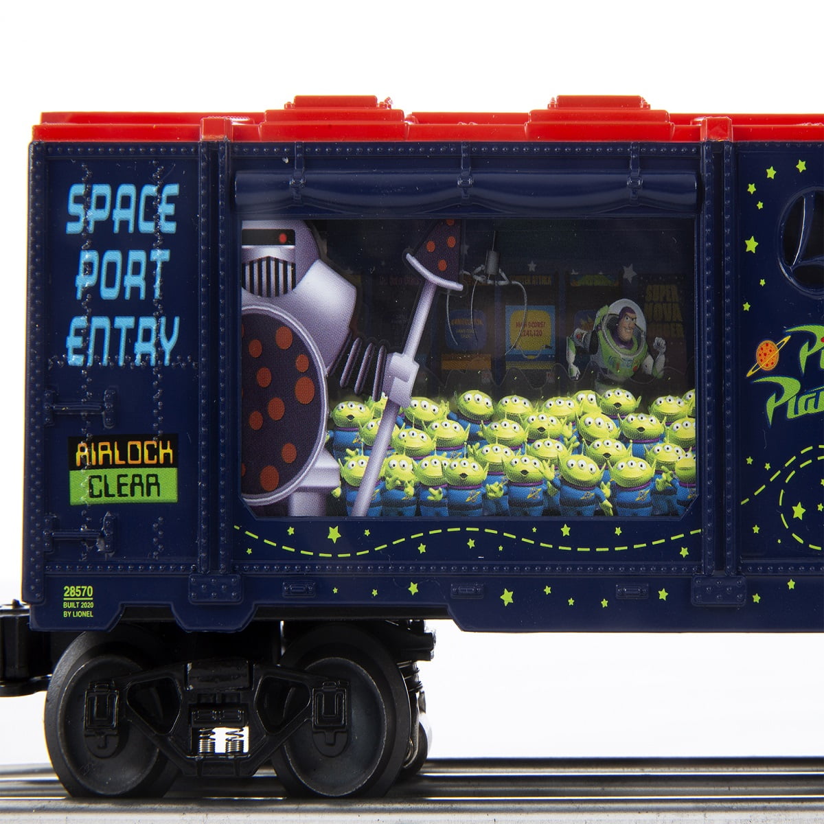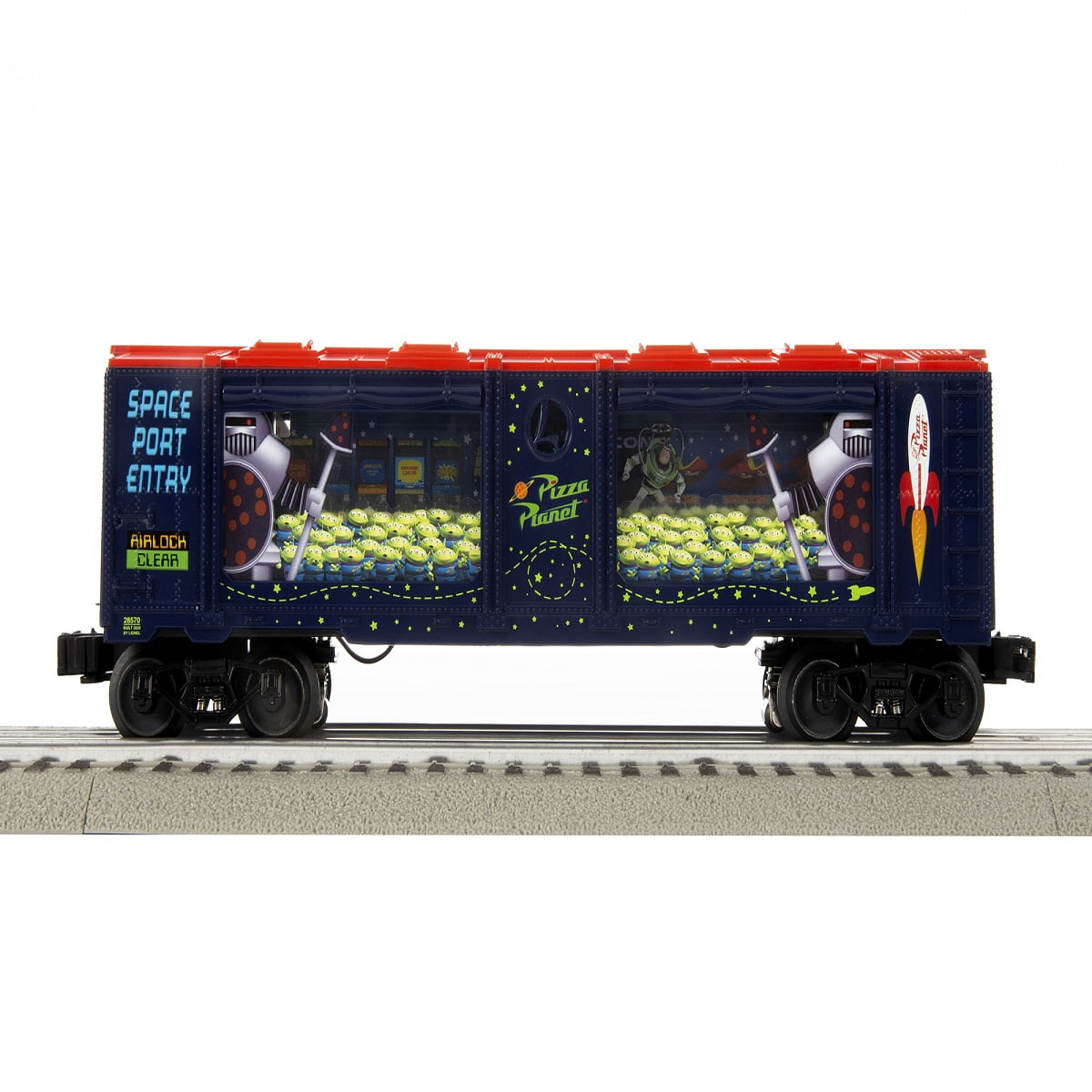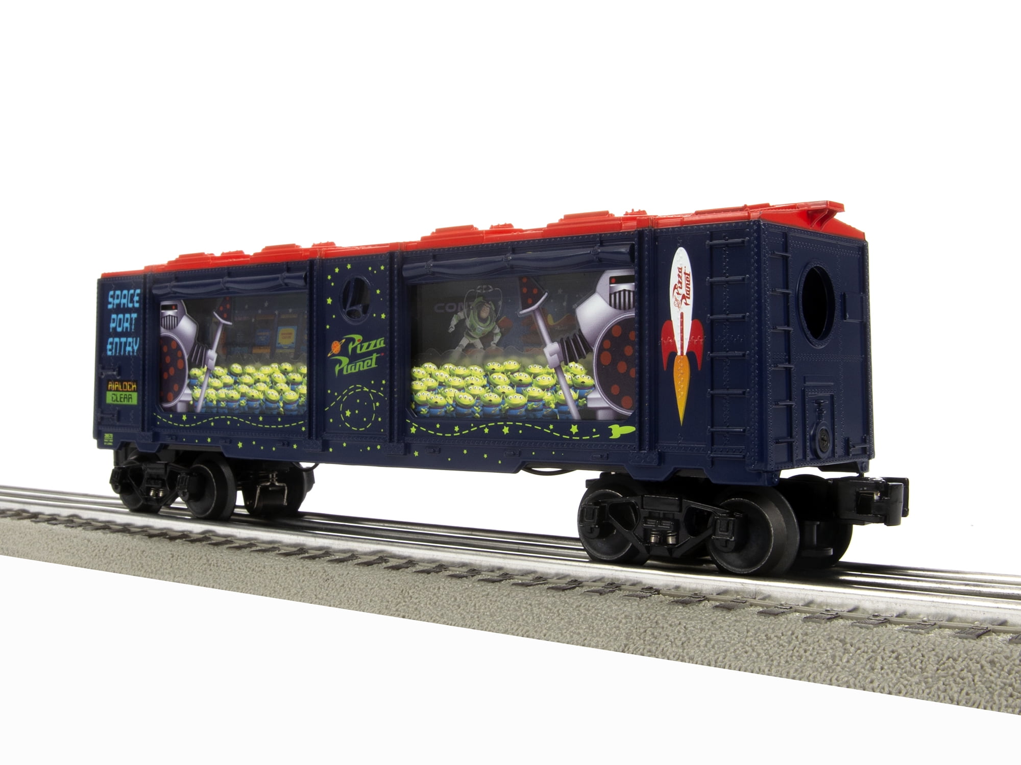 Lionel Disney Pixar Toy Story Pizza Planet Aquarium Train Car will be a great addition to your To Story collection. Aquarium Car showcases our favorite Toy Story movie scene from inside the rocket shaped claw machine at the Pizza Planet restaurant. Buzz Lightyear is being chased by the Claw inside the car full of little green Aliens. Will Space Ranger Buzz be able to outrun both the Aliens and the Claw to reach freedom? Car includes a maintenance-free motor with an On/Off switch and features die-cast metal sprung trucks, operating couplers and interior illumination.
