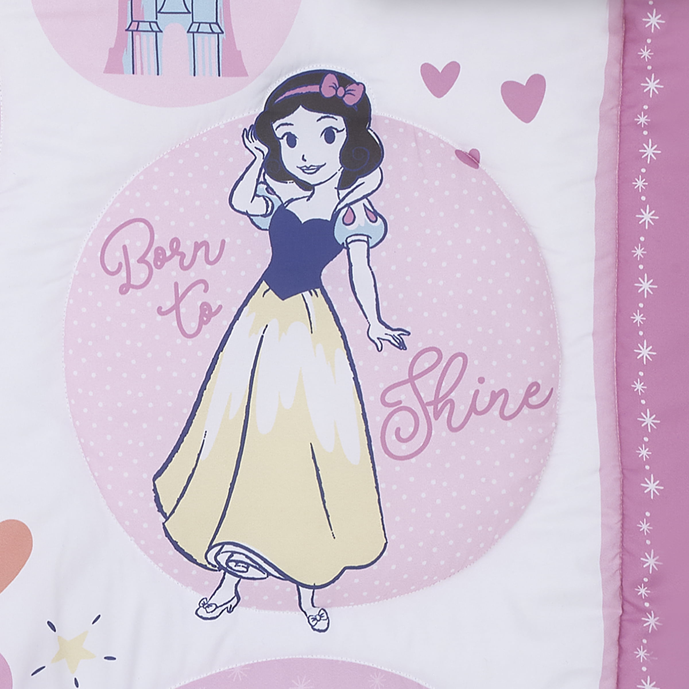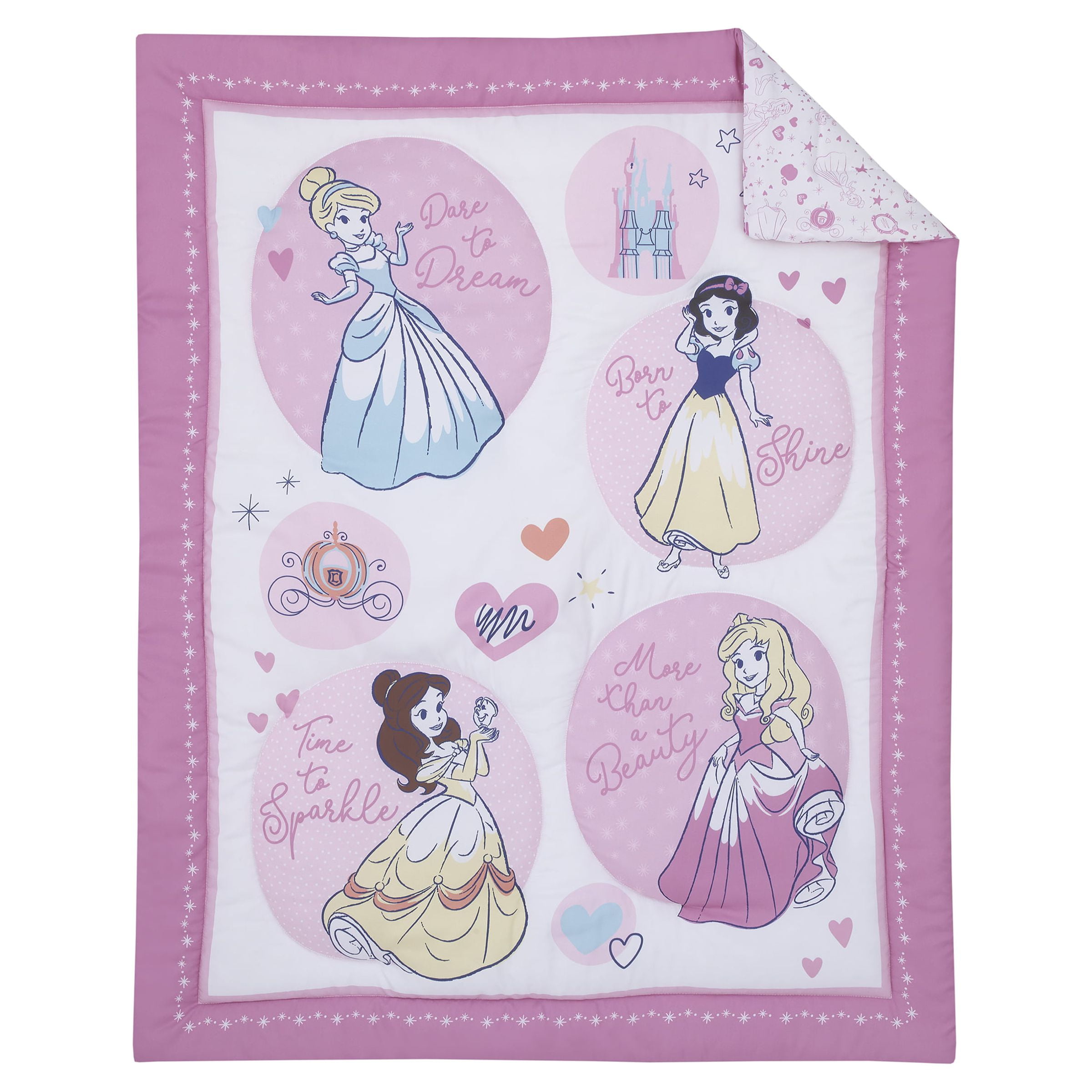 It’s time to sparkle with this Disney Baby Dare to Dream 3 Piece Mini Porta Crib Bedding Set! Featuring all of the original Disney princesses on this 39″ x 30″ super soft comforter! Cinderella, Belle, Snow White and Aurora decorate the front with a pretty solid baby pink color on the back! A contrasting darker pink border features white starbursts. The fitted crib sheets have a white ground with pink hearts, rainbows, stars, crowns and of course the Princesses! Sheets have elastic around the edges for a safe and snug fit. Made of super soft snuggly 100% polyester fabrics, this set fits a porta crib or “mini” crib that uses a mattress that measures 38″ x 24″. Your baby princess was born to shine with this charming collection!