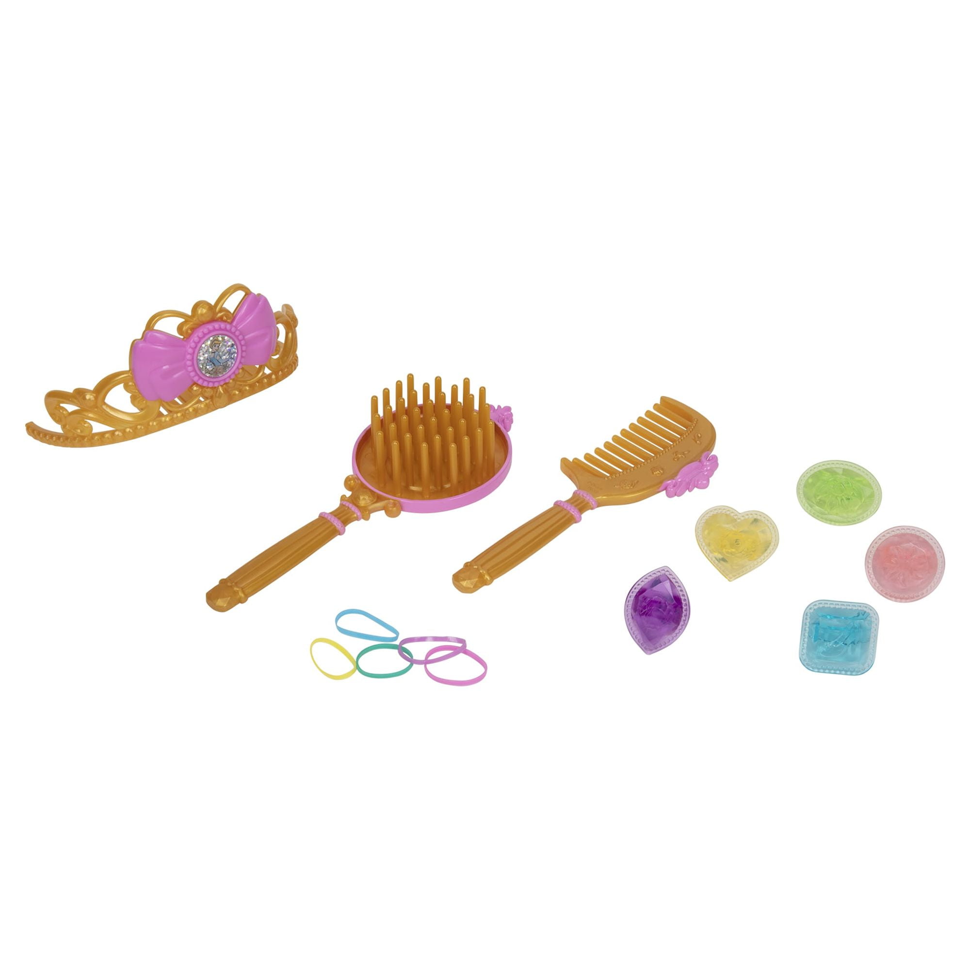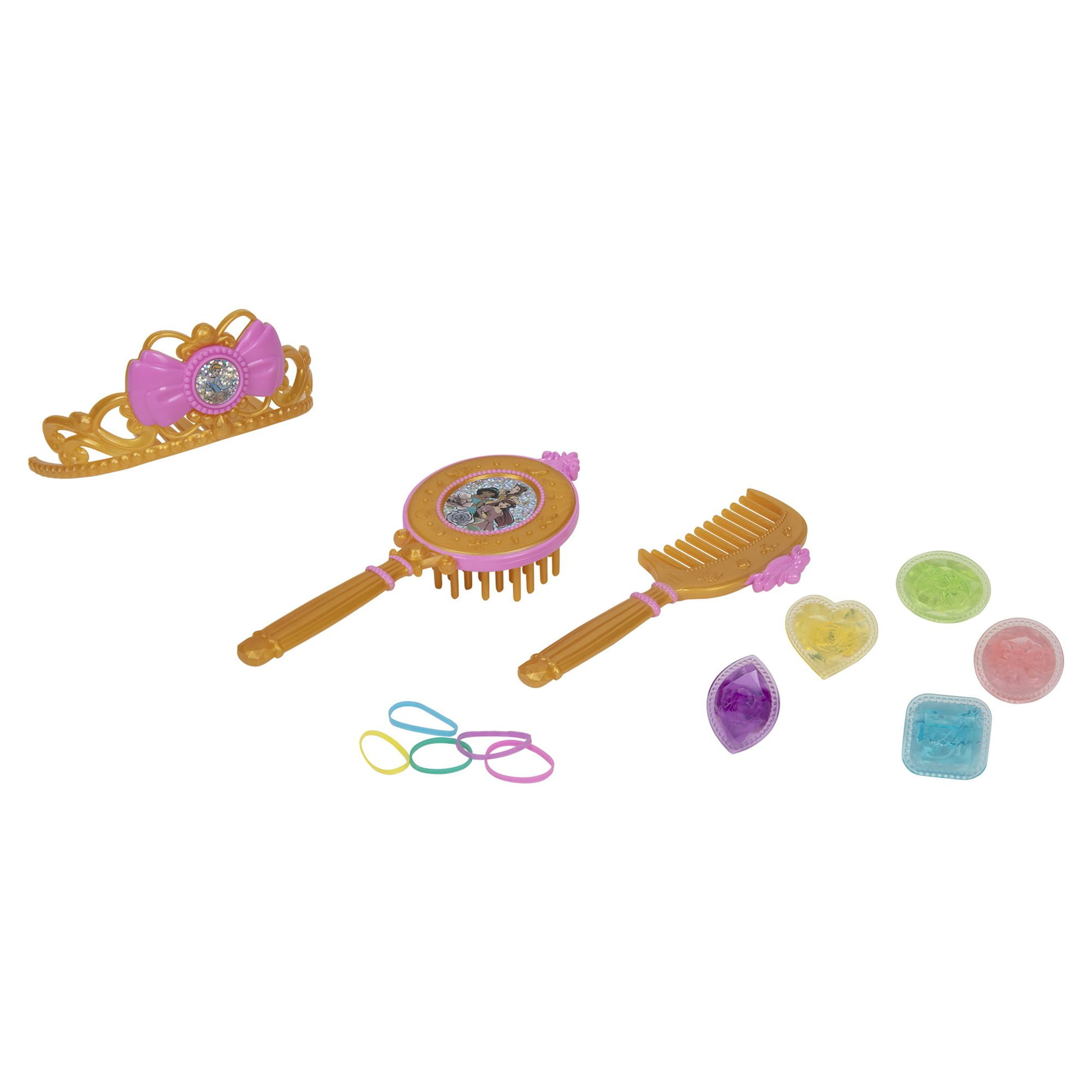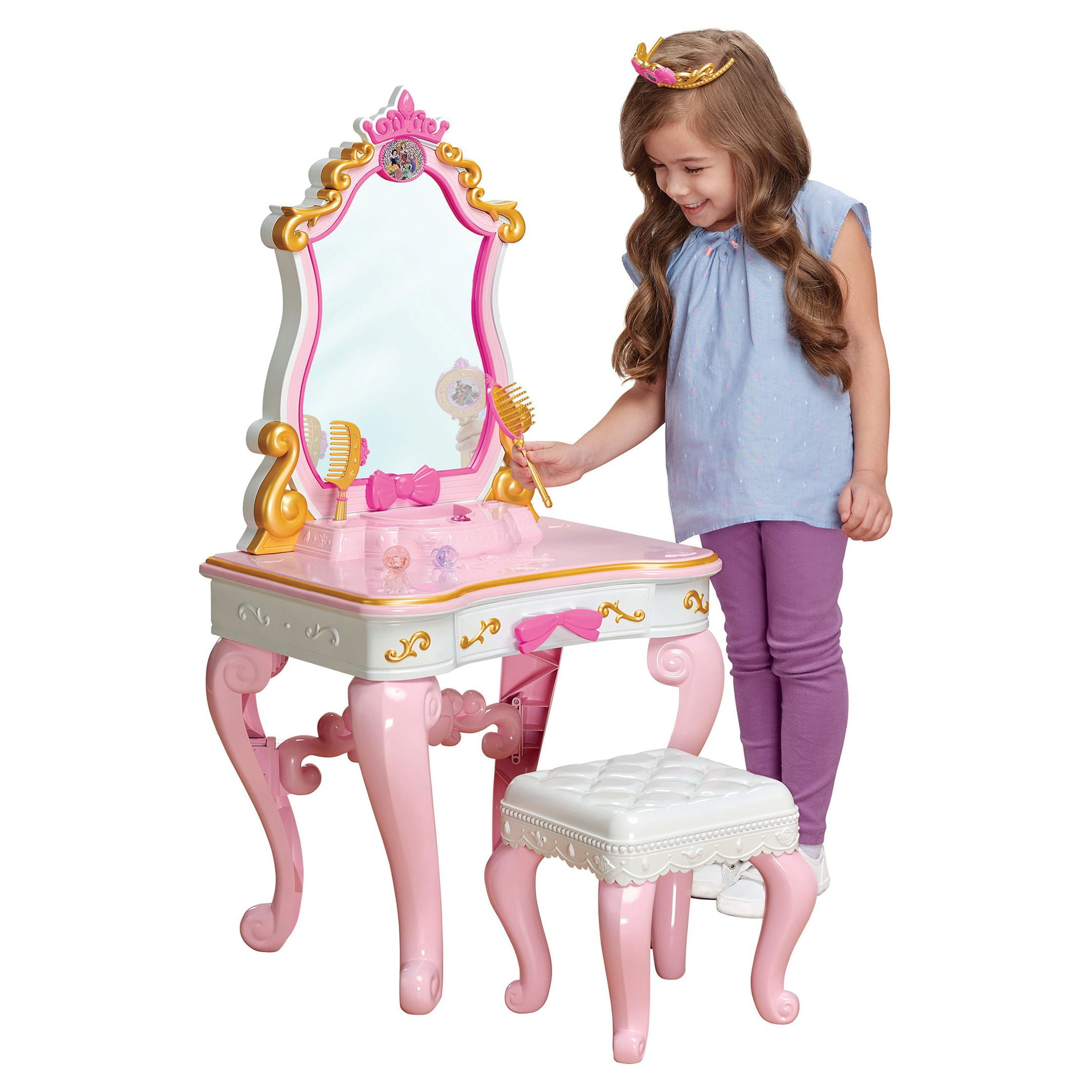 Features 16 positive messages inspired by the stories of 8 Disney Princess characters; Ariel, Belle, Cinderella, Jasmine, Moana, Mulan, Rapunzel, and Tiana Accessories activate the enchanting messages & sound effects and tabletop gem activates the Ultimate Princess Celebration song “Starting Now” Also includes five Disney Princess rings, representing the characters of Belle, Cinderella, Jasmine, Rapunzel and Tiana, which can be stored in the special heart-shape in the drawer Includes 1 Vanity, 1 Stool, 1 Tiara, 1 Brush, 1 Comb, 5 Elastic Bands and 5 Princess Rings Suggested for Ages 3+ (small parts) Requires 3 x AA batteries (not included)