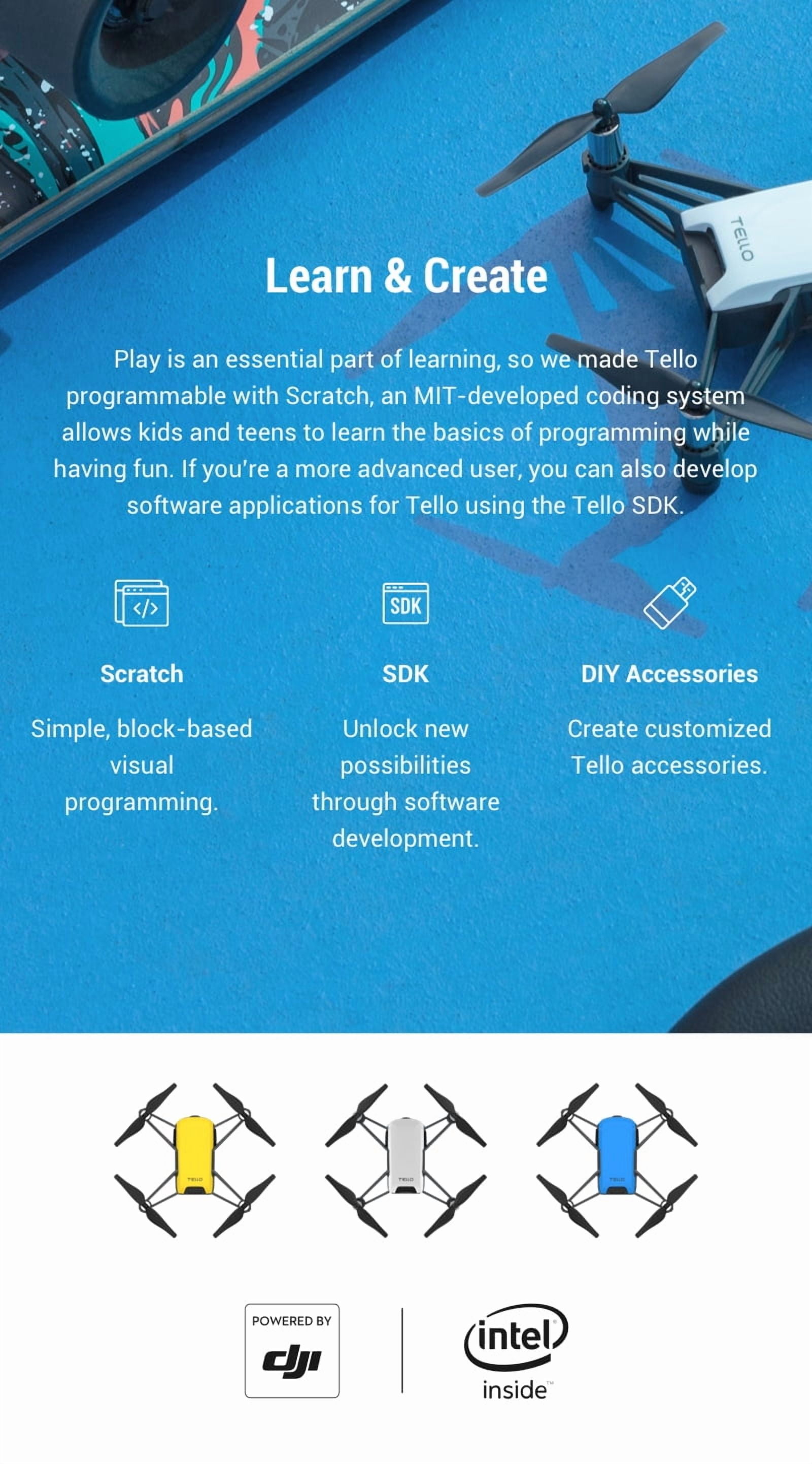 Learn about drones, shoot video and easily perform impressive tricks with this lightweight Ryze Tello drone. The 5-megapixel camera records JPEG photos and 720p MP4 video, and the Tello flies up to 10m vertically and up to 100m away. This Ryze Tello drone operates up to 13 minutes per charge. Perform flying stunts, shoot quick videos with EZ Shots, and learn about drones with coding education. Get yourself a Tello to find out just how awesome flying a drone can be!