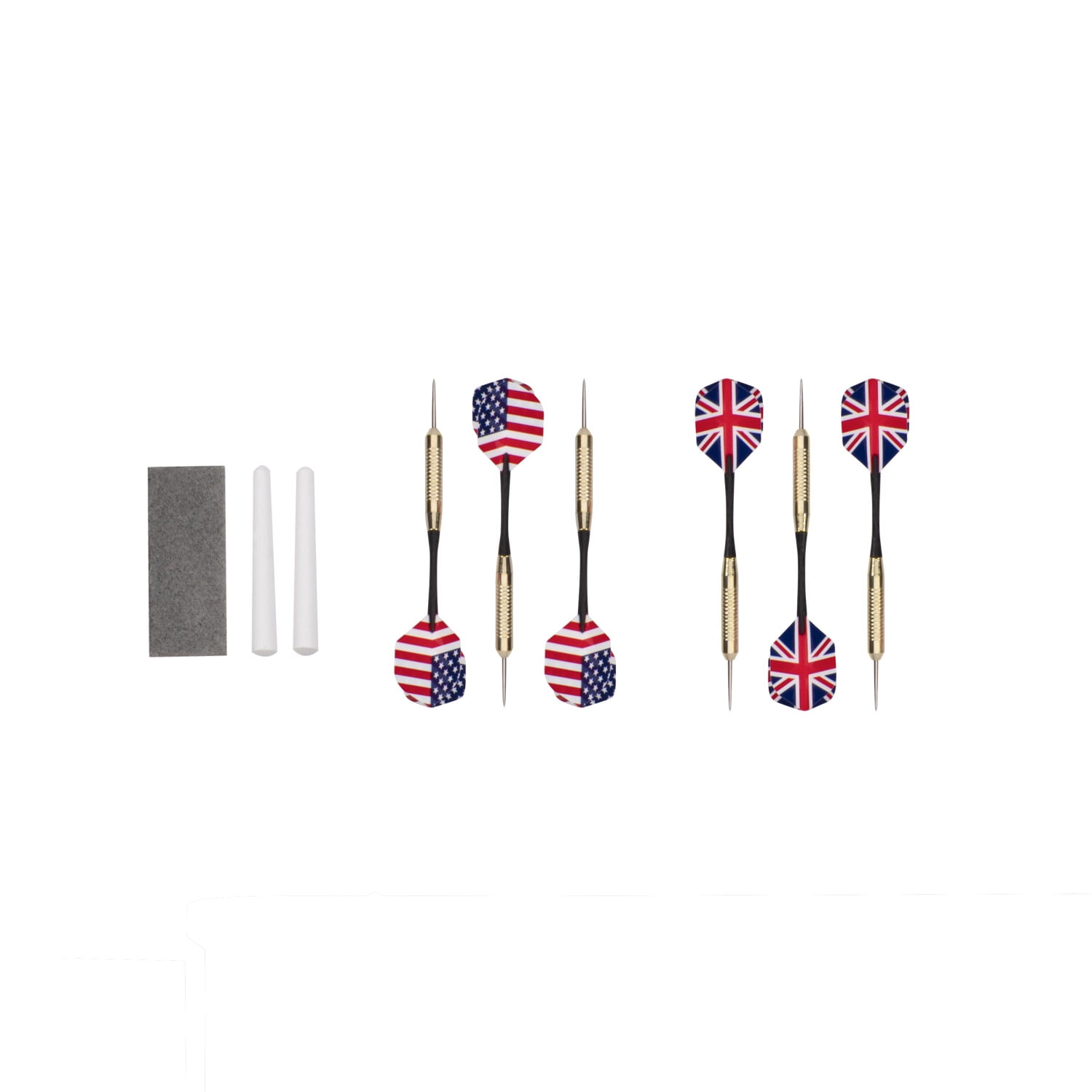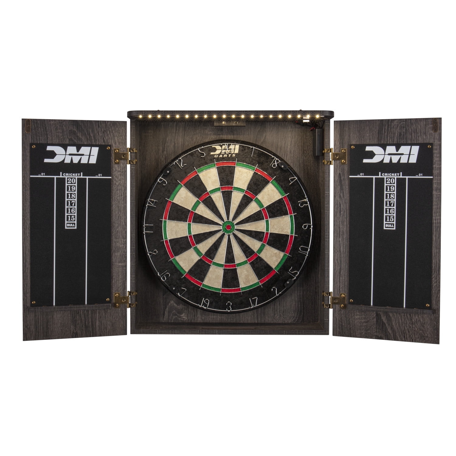 DMI Sports Bristle Dartboard Illuminated Cabinet Set Builtin LED lighting illuminates the dartboard and automatically shuts down when the doors are opened and closed Attractive rustic grey wood grain laminate complements modern home décor Includes an official size 18in x 15in bristle sisal dartboard with self healing properties Comes with 2 dry erase scoreboards, a marker pen, and an eraser for easy scoring The set includes 6 steel tip darts, allowing for immediate play right out of the box