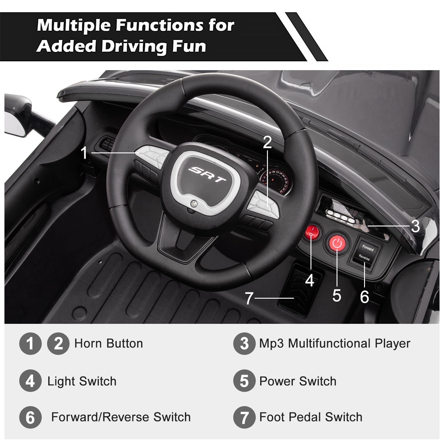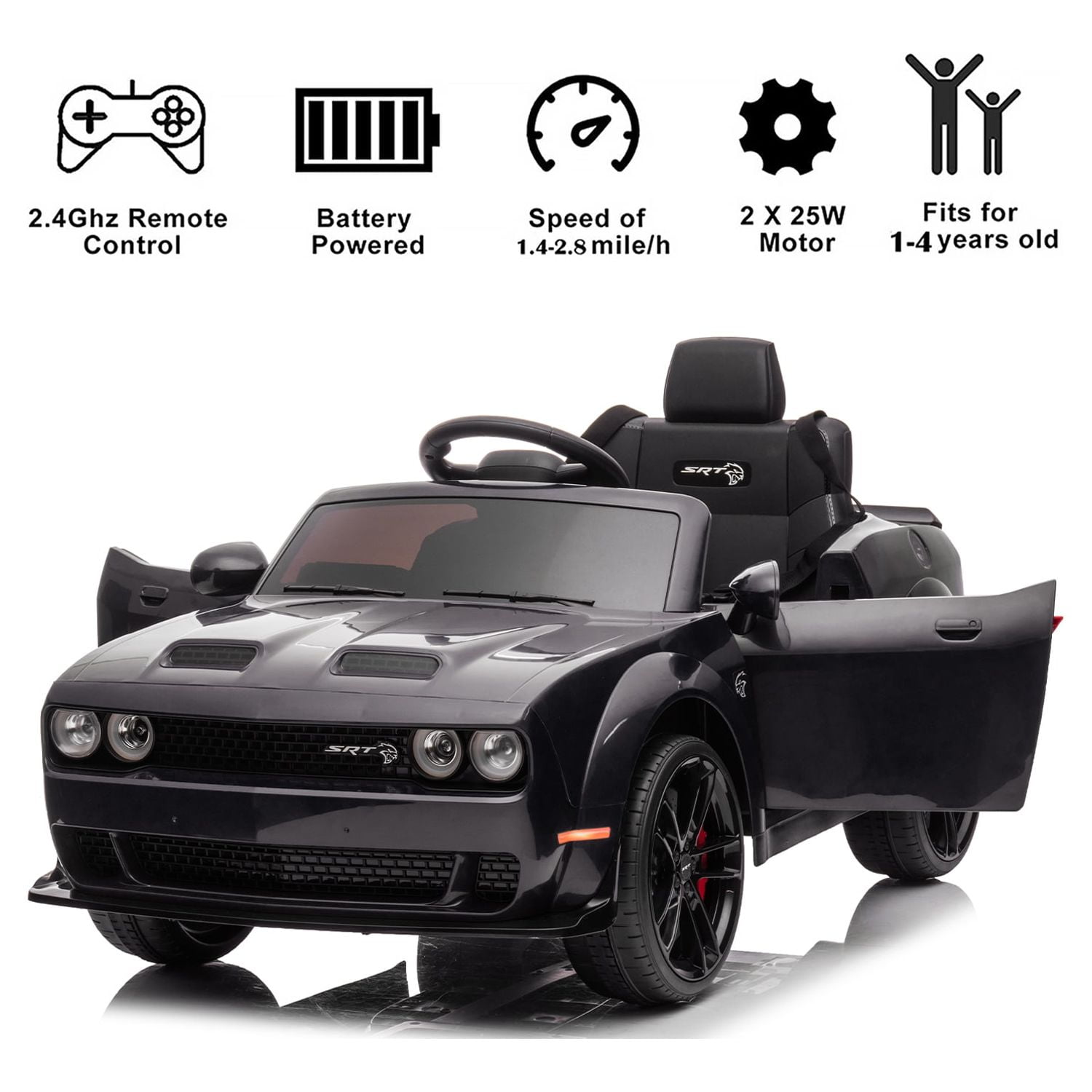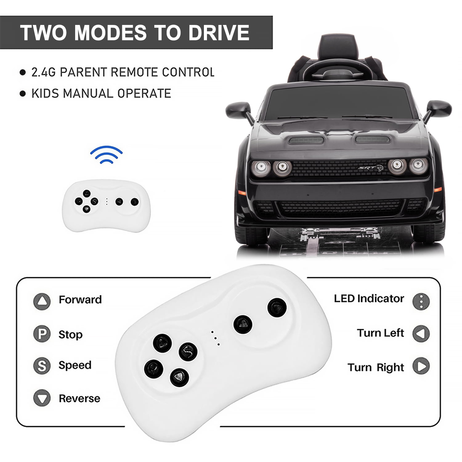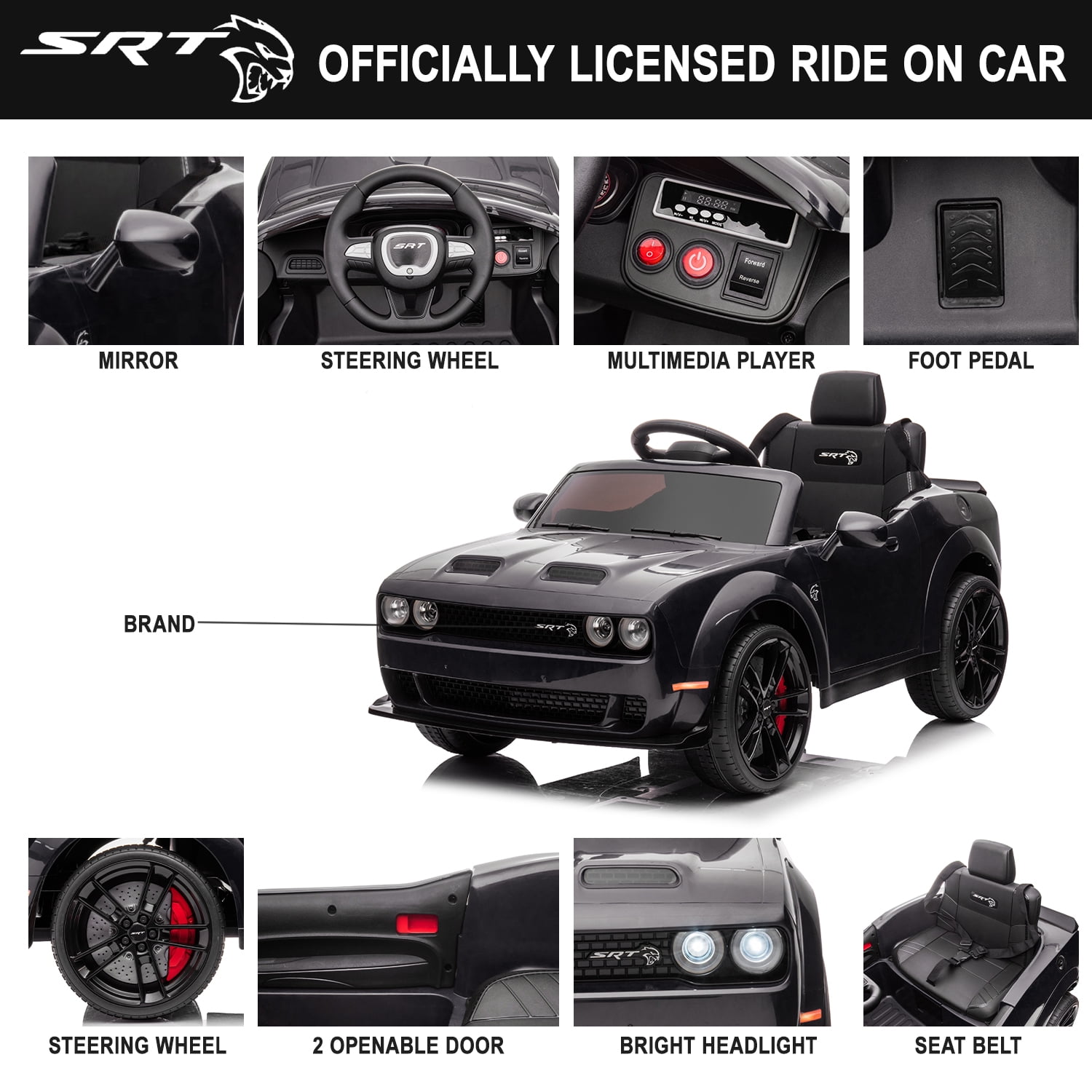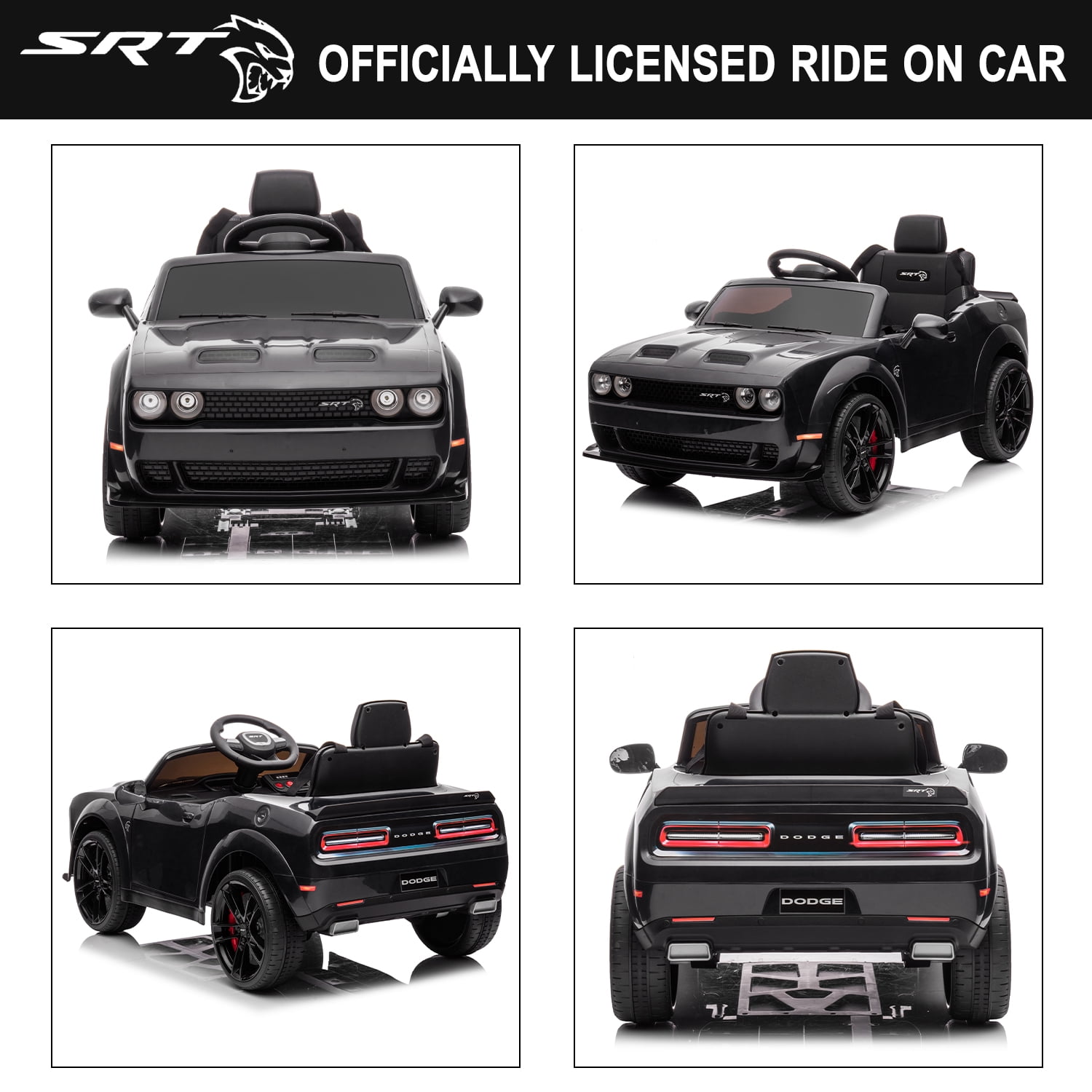 Dodge Challenger 12V Ride On Car, Battery Electric Car for Ages 3+ Kids, Licensed SRT Hellcat Ride On Toys with Remote Control, LED Lights, USB, Bluetooth Music, Black