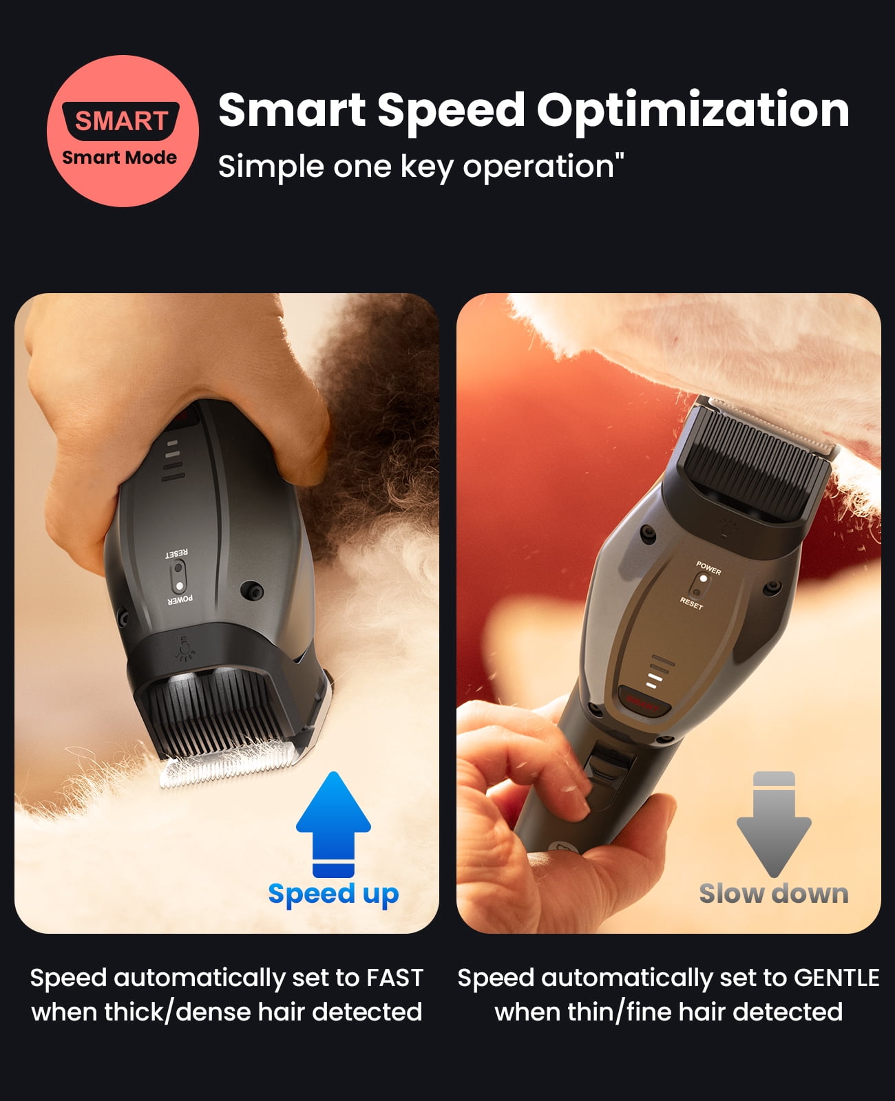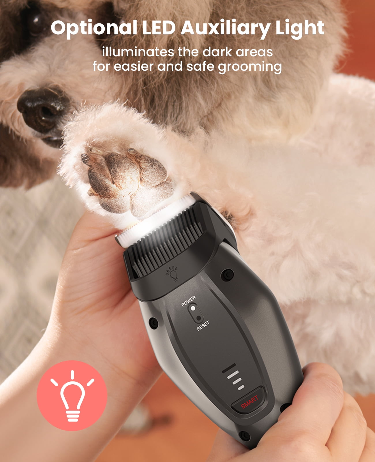 【User-friendly smart mode】Do you worry that you cannot groom your pets smoothly without superb skills and proficiency for home pet grooming? Equipped with powerful algorithm, DogCare dog clippers’ smart mode intelligently senses the level and thickness of hair, and automatically adjusts to the optimal clipping speed. No skill is required, just click on the ‘SMART’ button and let DogCare dog grooming kit do the rest of the job. Home grooming has never been this easy. 【Sharp and detachable blade】Have you ever wondered why your pet always struggles during dog grooming? Experiencing pain or discomfort might be one of the reasons! Featuring alloy material and aerodynamic structure, DogCare dog clipper prevents the blade from clogging, and provide smooth and safe trimming experience. Pets become more cooperative as grooming is no longer torture. The blade can also be removed with one push of the thumb, which is convenient for cleaning and maintenance. 【Rechargeable and long-lasting battery】Unlike other wired clippers restricted in use or cordless clippers with short battery life, DogCare dog clippers for grooming, with convenient cordless design and USB charging port, deliver up to about 180 minutes of run-time per charge (more than enough even for novices), which means 6 dogs can be groomed continuously with one charge, perfect for families that have multiple pets to continuously groom different pets. 【Auxiliary light for easier trimming】Home pet grooming lacks professional environments and cannot provide light conditions compared with groomers, and there is no way to trim well if light is insufficient. DogCare dog grooming clippers, with its auxiliary lighting design, provide proper illumination so you can see more clearly when trimming darker areas, which helps you to achieve detailed grooming; The design of light switch at the tail of the clipper is convenient for efficient dog grooming. 【Fast and easy home grooming】DogCare dog hair clippers are driven by powerful heavy-duty motor, which is suitable for all hair types to realize snag-free cutting and even the thickest coat can be groomed smoothly and quickly without pulling hair; DogCare dog trimmer runs at low noise and vibration, achieving a perfect balance between powerful clipping and ultra-quiet operation: no matter how timid and sensitive your pets are, they won’t be afraid of grooming anymore.