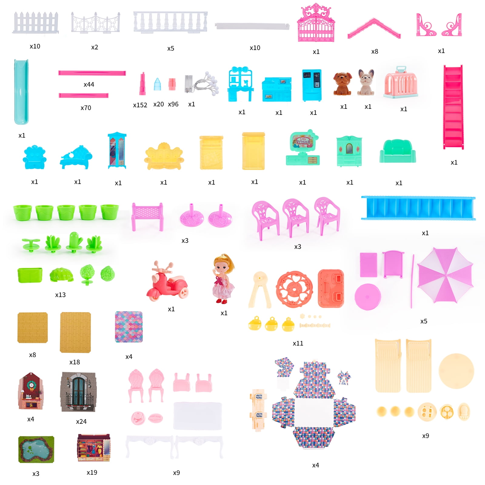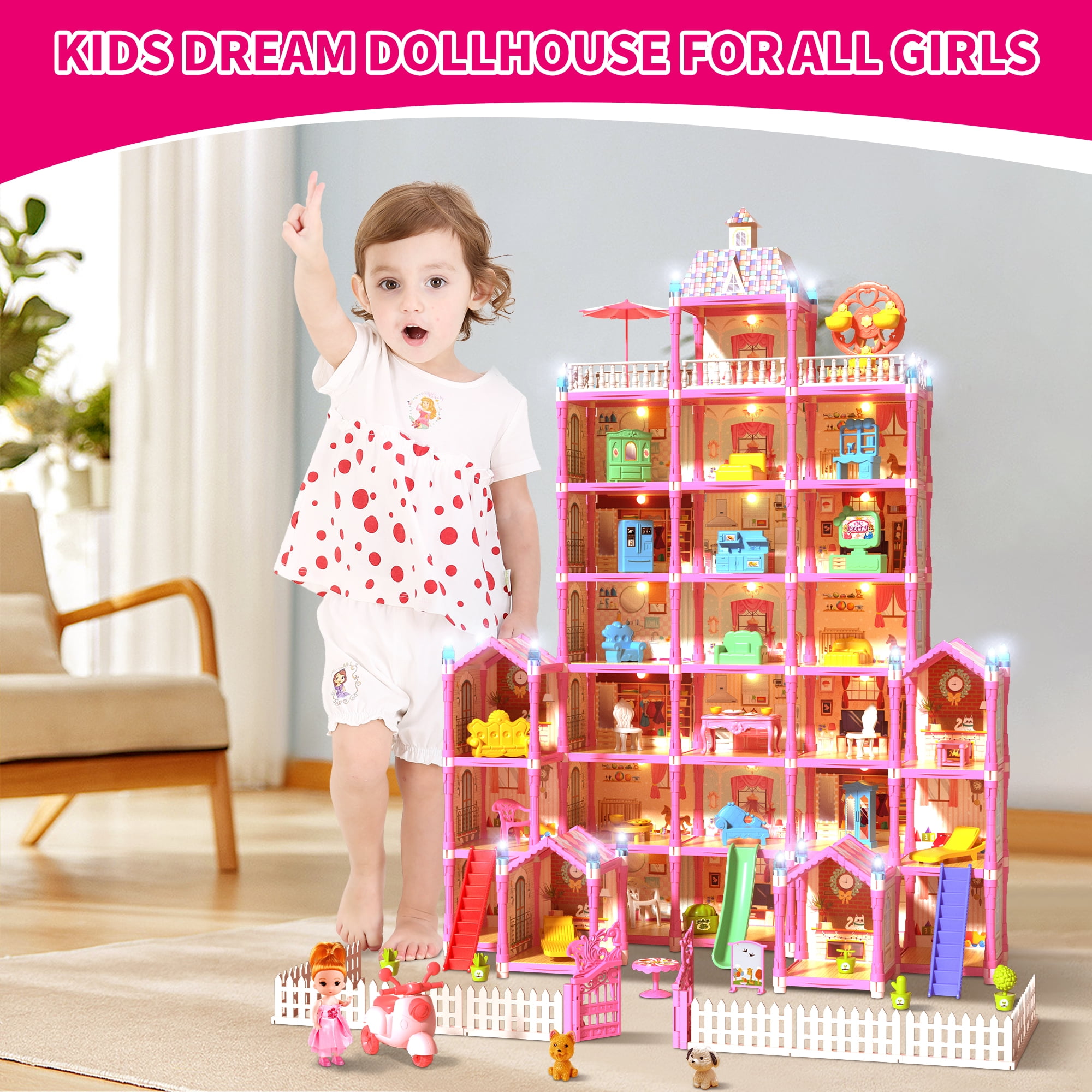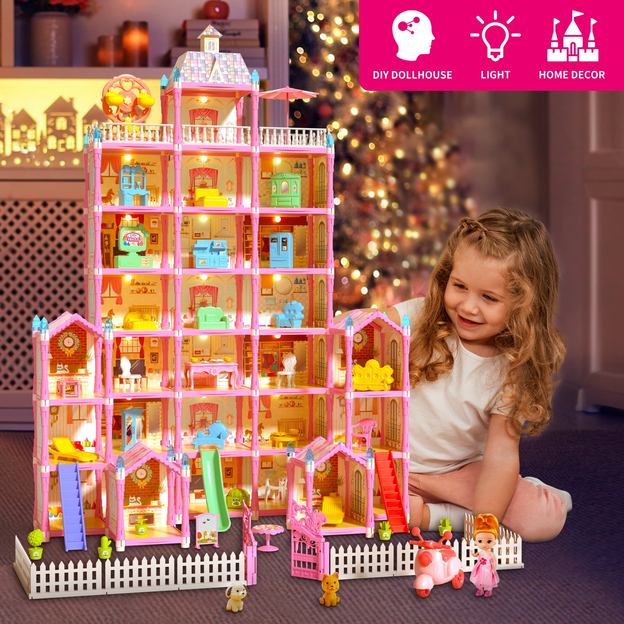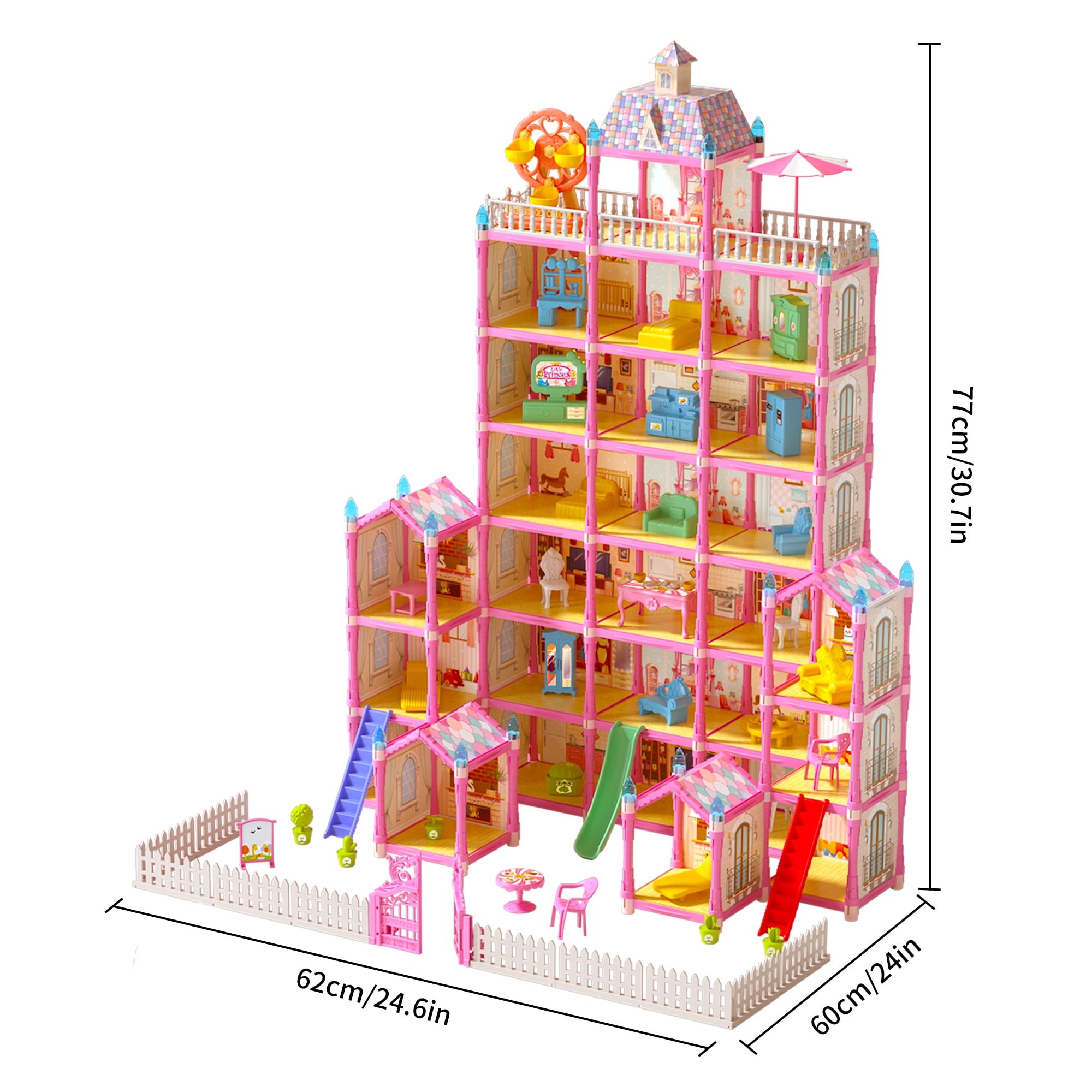 【Princess Doll house】With a height of 40.1 inches, a width of 20.47 inches, and a depth of 28.9 inches, this seven-story doll house provides ample space for 29 different rooms to explore. Complete with one doll and two adorable puppies, your child can bring their stories to life with this playset. (Detailed instruction included) 【High Quality Material】Made with high-quality materials, this doll house is designed for safety and durability to ensure it lasts for endless hours of imaginative play. From cooking in the kitchen to relaxing in the bedroom, your child can experience different aspects of daily life and develop valuable skills while having fun and interacting with friends. 【Abundant Accessories and Furniture】This playset comes with a wide range of accessories, including unique home furnishings, household appliances, slides, adorable puppies and other accessories for easy movement and arrangement. Children can mix and match the accessories according to their preferences, adding new plot to their stories. 【Encourage Role-play】Imagine these dolls and their furry friends living in this pink princess castle house and starting a wonderful life. Get up, wash up, dress up, have a lunch, watch TV, walk the dog and have afternoon tea in the yard,climbs the stairs and slides down the slide, go to the toilet then go to bed, what a realistic & healthy daily life! 【Great Gift Idea For Girls】Are you looking for a perfect toy for your princess? Meromore princess doll house is a great gift idea for girls of any age! Doll house kids toys comes in a beautiful box, perfect for 3 4 5 6 7 8 9 10 11 12 year old boys and girls toddlers for birthday parties, Christmas, and other holidays. The playhouse is the #1 gift to every girl ! Doll house also can be used as home decoration in kid’s room.
