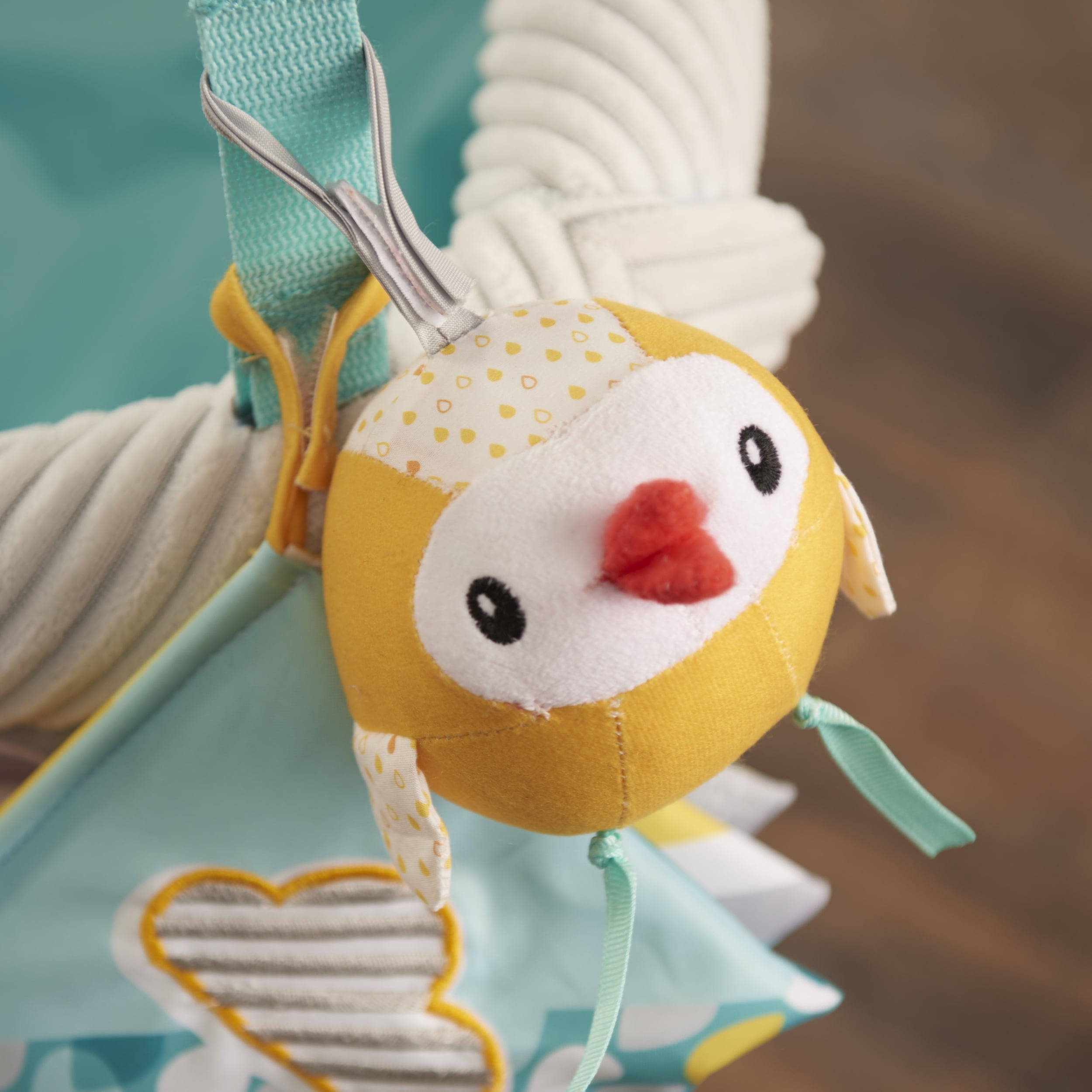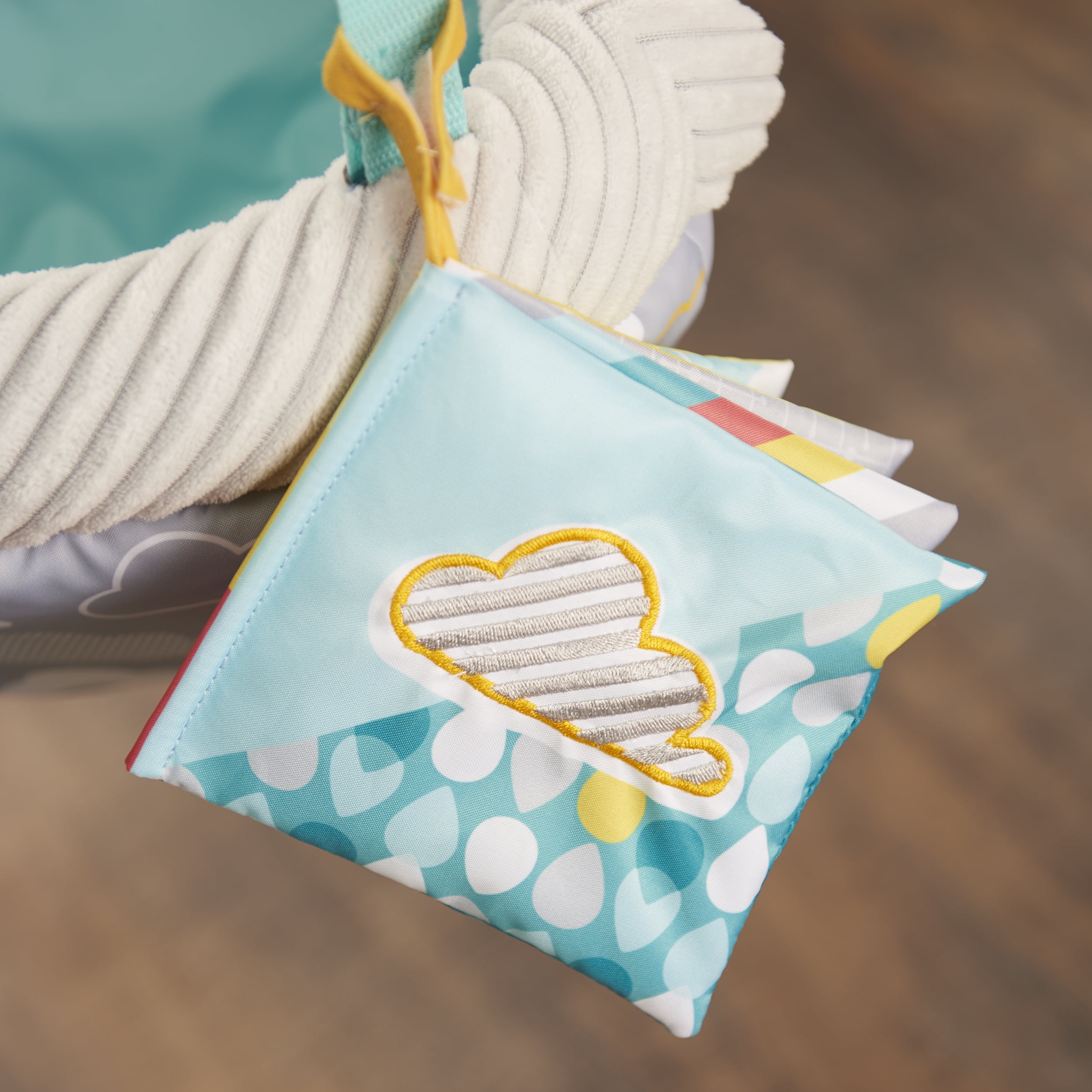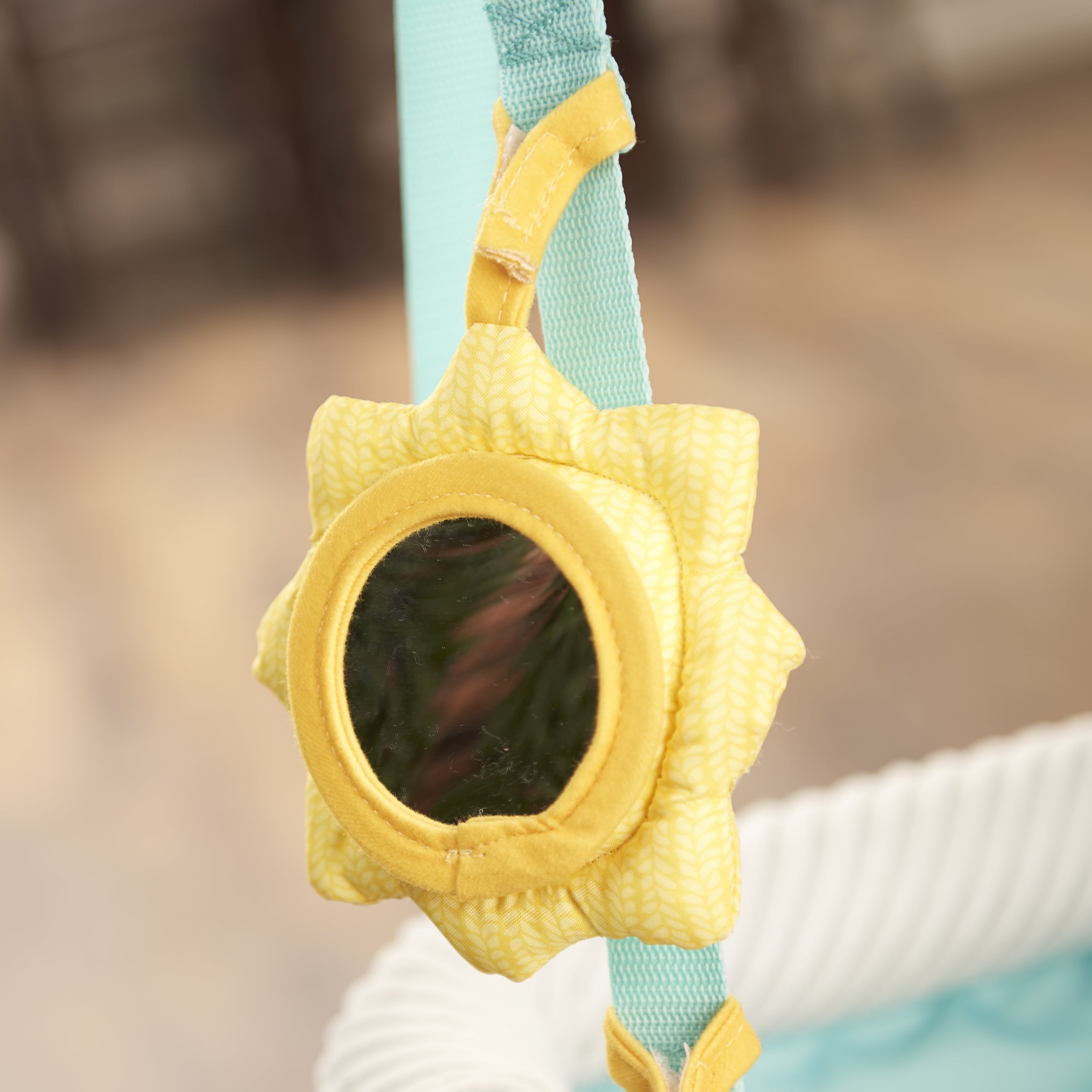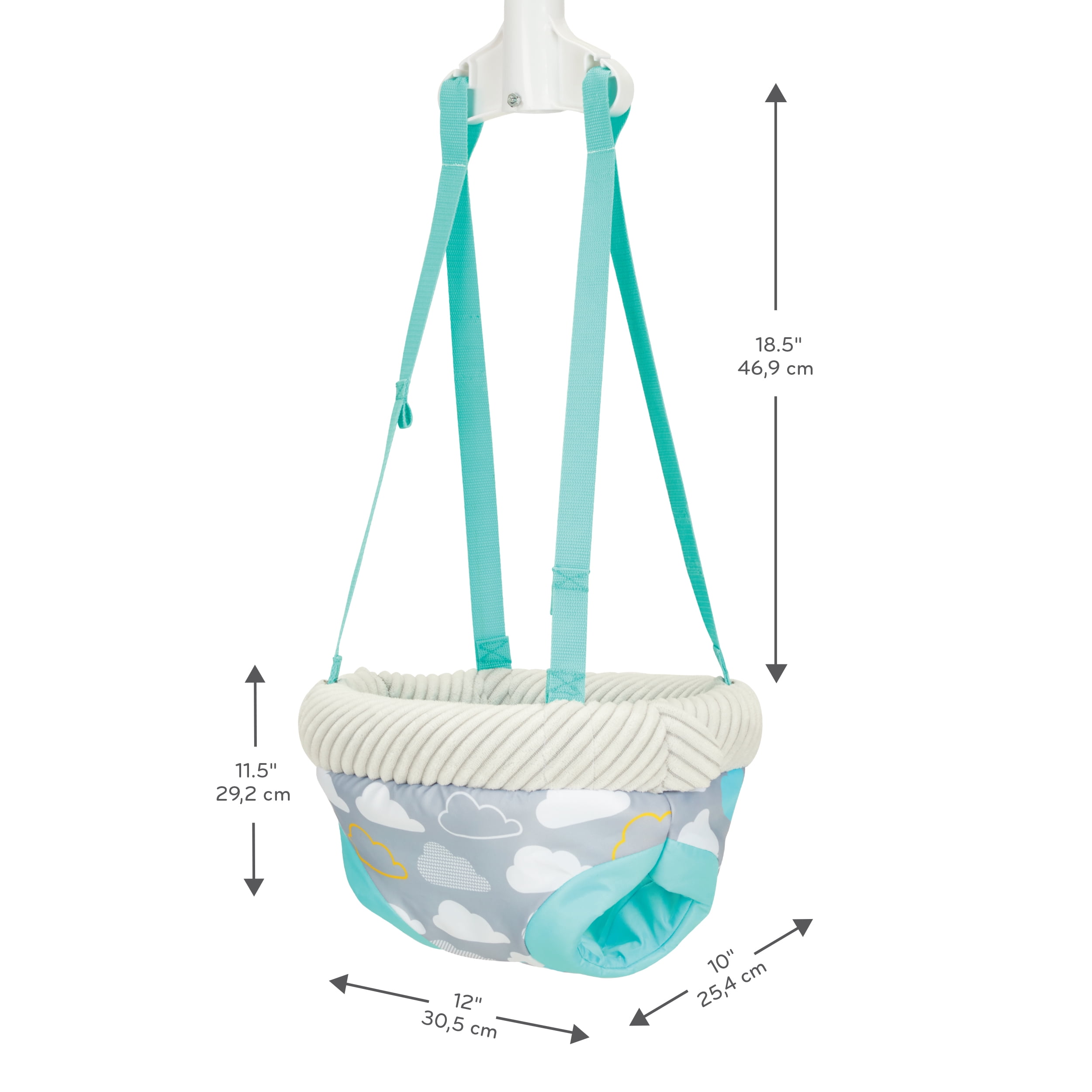 The ExerSaucer® Sweet Skies Door Jumper with Removable Toys delivers jump after jump for your little one with the added fun of four removable toys. Jumping provides entertainment and exercise, without taking up floor space! Four removable, plush toys are easy to take with you for playtime fun anywhere! Toys include a self-discovery mirror, tag rainbow, plush rattle and peek-a-boo flip book. The easy-to-use clamp makes moving the jumper from room to room a breeze, and the adjustable straps give you a customized height for your child as they grow. Because setup is quick and doesn’t require tools, this item is perfect to throw in a travel bag for day trips or vacations. The soft, premium fabrics and toys are wipeable and machine-washable, a convenience you’ll love.