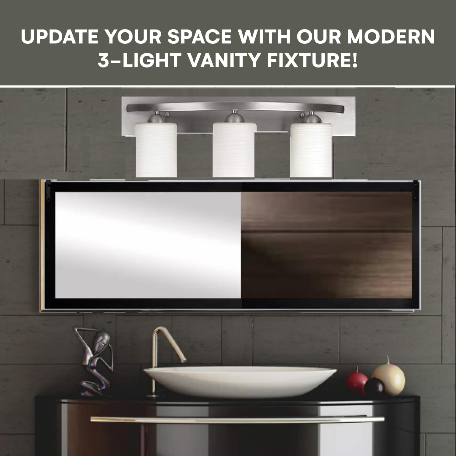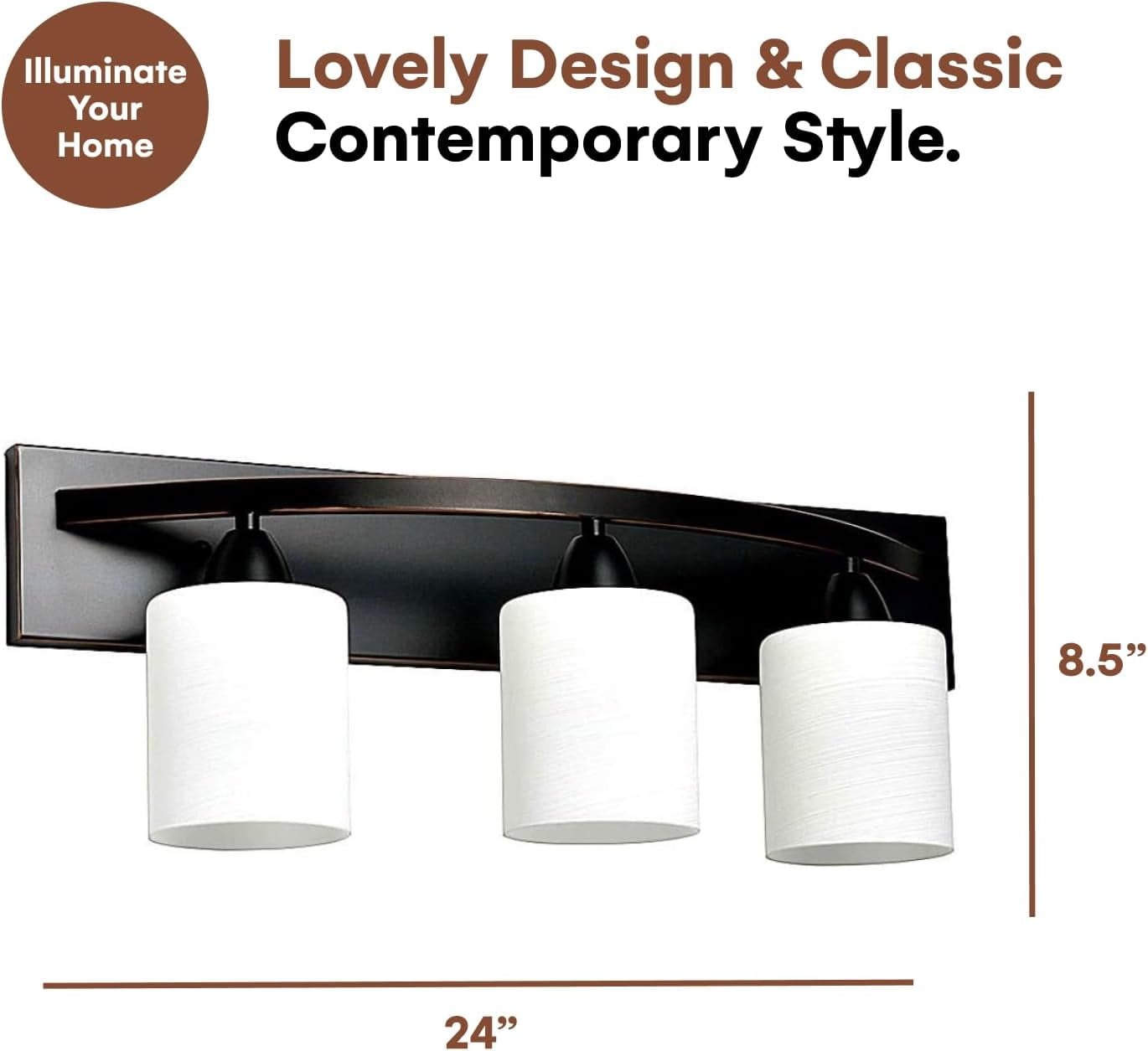 New And Modern Design: Our lovely bathroom vanity lights are ideal for your other rooms and have an attractive appearance. With its classic contemporary style, the stylish 3-light vanity fixture illuminates any space. Size: The vanity light fixture measures 24” in width, 8.5” in height, and 7” in depth. Requires three 100W (or equivalent) Type A light bulbs (LED, CFL, Halogen, or Incandescent) – not included Easy to Install: The package contains all the hardware required for installation; all you need to do is connect the wire and assemble your vanity bathroom light fixtures, which takes only a few minutes. Wide Application: Depending on your needs, this bathroom vanity lighting can be hung with the light facing up or down. It can be the ideal decoration for your home and other locations. Customer Service: If you have any questions about our products, please “Contact Seller” and share your comments with us. Our customer service will contact you and we will try our best to improve your shopping experience.