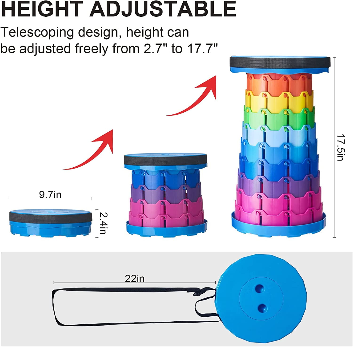 Doseno Portable Collapsible Stool with Adjustable Height, Black Holds up to 550 lbs with high-density thickened PP material for durability Upgraded fish scale structure and reinforced 10-layer buckle design for enhanced strength and stability Non-slip bottom design for improved safety and anti-tilt capability Easy to open and close with stiffeners that hold the stool in place Lightweight at only 2 lbs, with a diameter of 9.84 inches and folds down to 2.4 inches for easy storage Adjustable height from 2.4 inches to 17.5 inches, suitable for both adults and children Versatile for various activities such as hiking, fishing, camping, and home use Convenient to carry with an adjustable shoulder strap