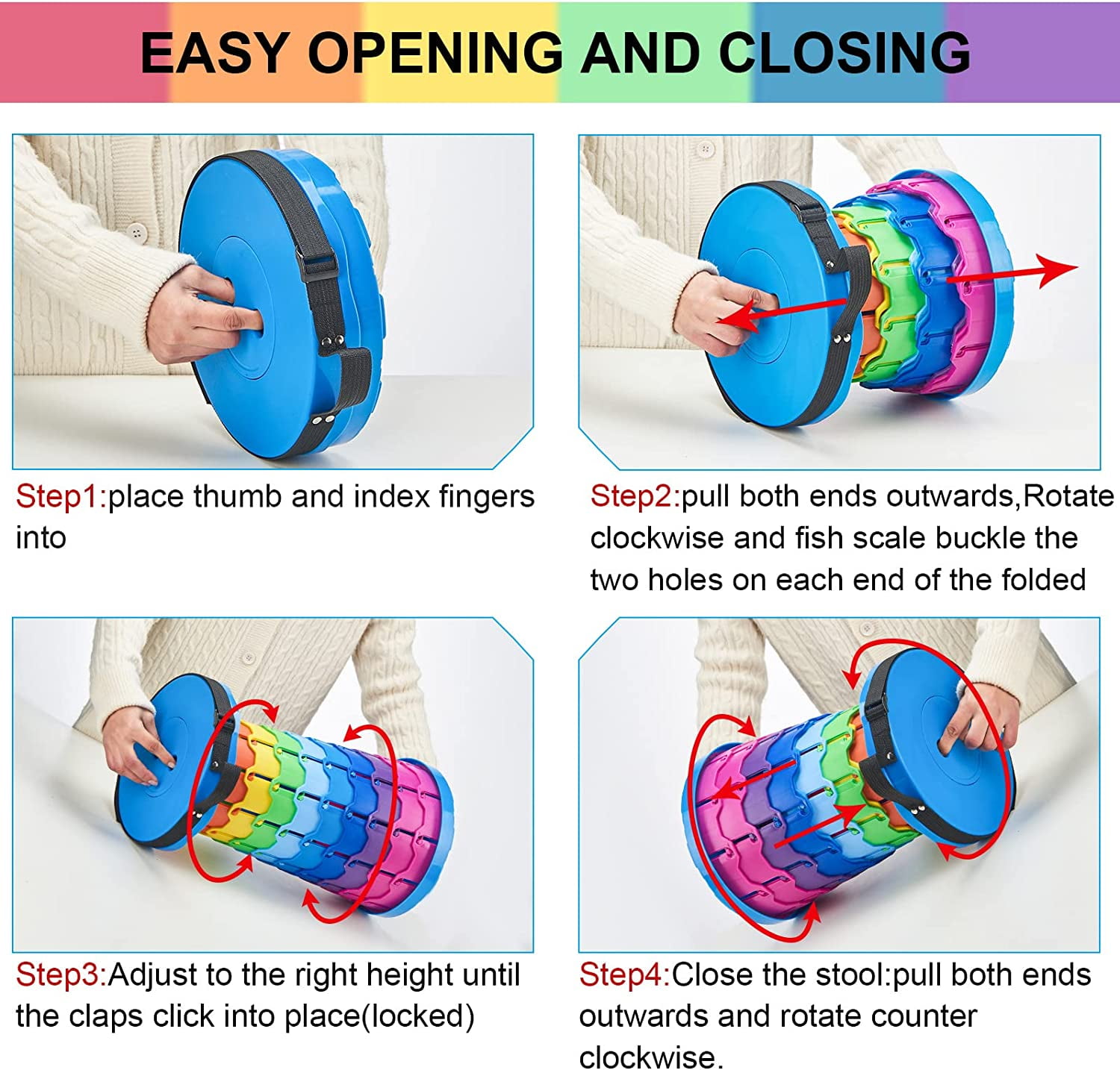 This newly upgraded portable collapsible stool is made of high-density thickened PP material, which is hard, stable, scratch-resistant and wear-resistant. Upgraded fish scale structure and reinforced 10-layer buckle design, increase collapsible stool strength, rigidity and stability. The load capacity reaches 550 lbs, far exceeding other similar products. It is only 2 pounds, with a diameter of 9.84inch/25cm, and can be folded into 2.4inch, which is easy to carry and store. The bottom of the portable stool has a non-slip design, and the side support and anti-tilt ability have also been strengthened, making the stool more durable and safe.This portable collapsible stool has a load capacity of up to 550lbs, and the product weighs only 2lbs. It is lightweight and portable, and it is very suitable for use in all aspects of life. When you go out, carry it on your back for hiking, fishing, traveling, camping, barbecue, outdoor concerts, or queuing, you can sit and rest anytime, anywhere, or use it as a small table. When you are at home, put it in the living room, bathroom, or office. When you hold a party at home or have a lot of guests at the birthday party, you can take it out to sit, and put it away when not in use without taking up space.