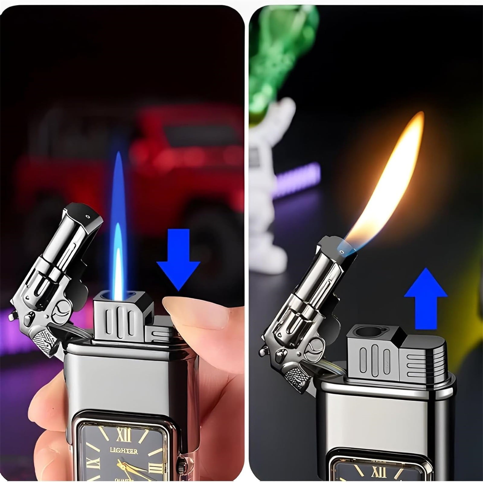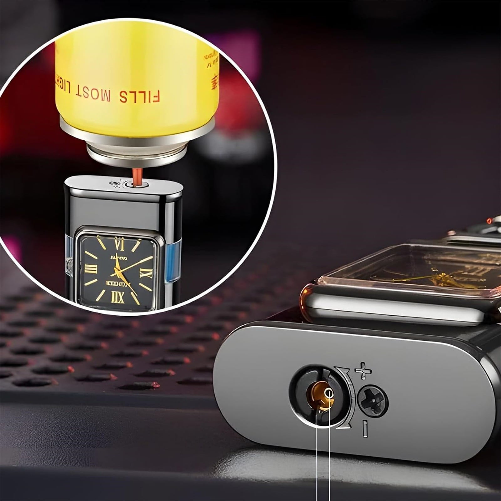 Double Fire Embossed Watch Windproof Torch Metal Inflatable Gift Material: metal Color: as the picture shows, (Due to the difference between different monitors, the picture may have slight color difference. please make sure you do not mind before ordering, Thank you!) Package weight: 110g Package size: 9.5×7.5×2.5cm,(Please allow 1-3mm error due to manual measurement. please make sure you do not mind before ordering.) ♛【Refillable 】: You Just Fill The With , Shake The Up And Down, Wait For A Minute, Let The Get Hot, And The Is Ready. (Note: Due To Air Mail Regulations, The Is Shipped Without , You Need To Fill Up The Before Use) ♛【 Shopping Experience】: For All Customers Who Purchase Our Windproof Vintage Watch Bezel Flame Torch, We Will Provide Friendly And Promise To Do Our To Solve Your Problems. If You Have Any Questions About The Product, Please Feel To Us Via Information Or . We Will Respond To You Within 24 Hours. ♛【New & Unique Gift】: Striking, Cool Design, Sturdy And Durable. The Is A Wonderful Gift For Dad, Mom, Husband, Wife, Lover, Boyfriend, Family And Friends On Birthday, Valentine’s Day, Christmas. Everyone Will Be Happy To It. The Gift You Desperately Need.