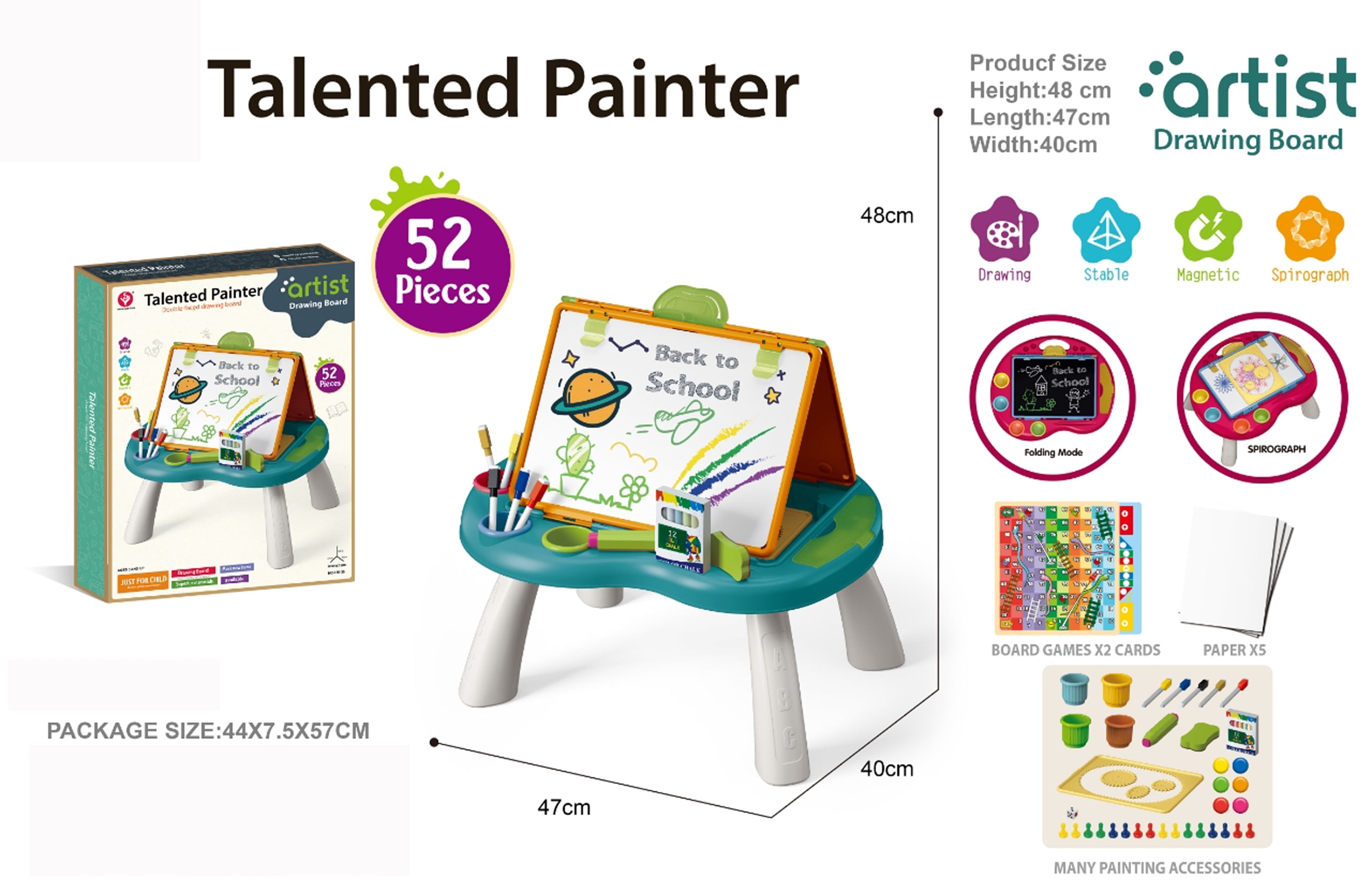 Standing easel for painting, coloring, drawing, and more. Double side board. One side is magnetic white board. The other side is chalk board. Package includes dry-erase magnetic whiteboard chalkboard, dry erase pen and eraser, chalk, crayons and all Your Other Art Supplies Encourage kids creativity. Allow hem to explore and develop their creativity Help develop kids social skills.