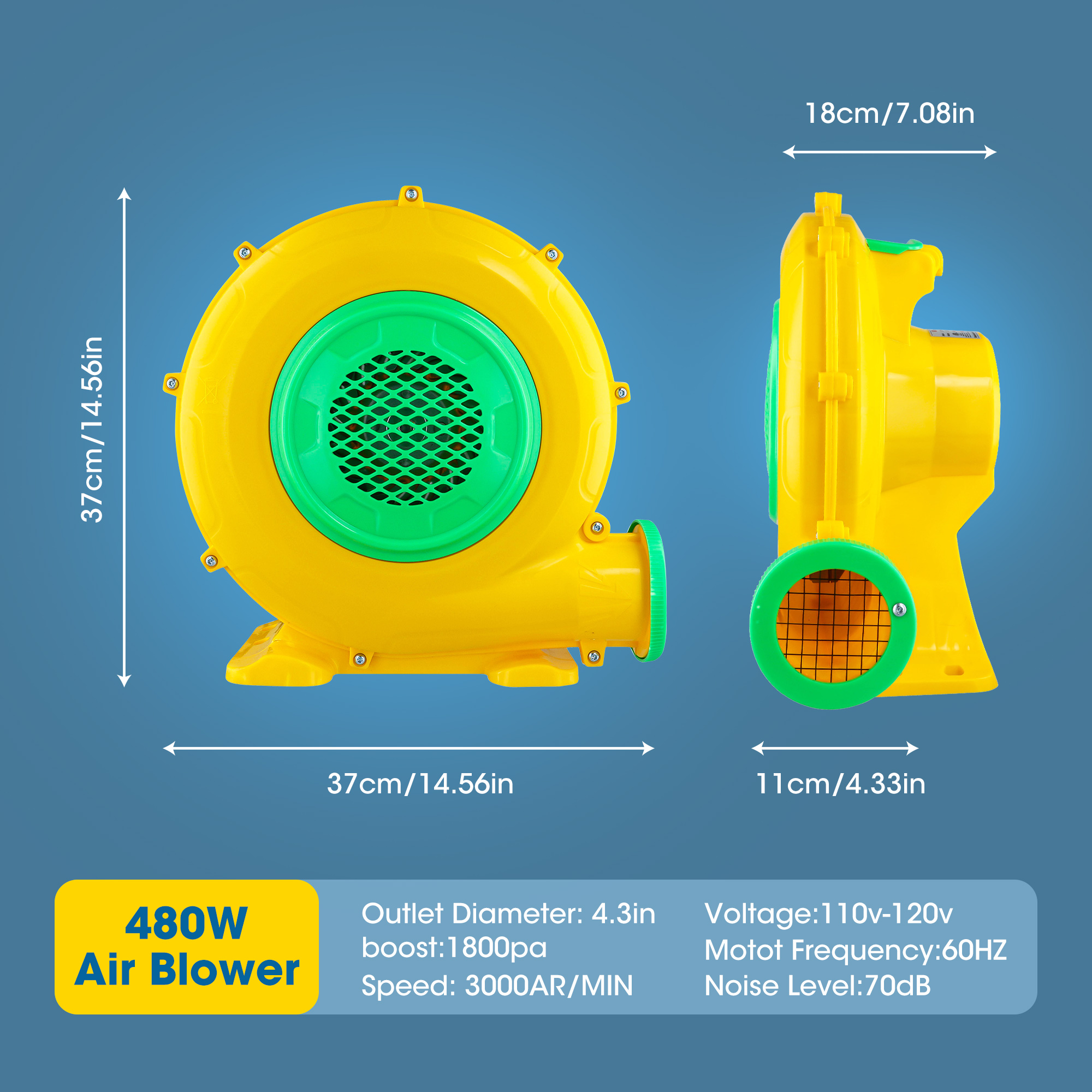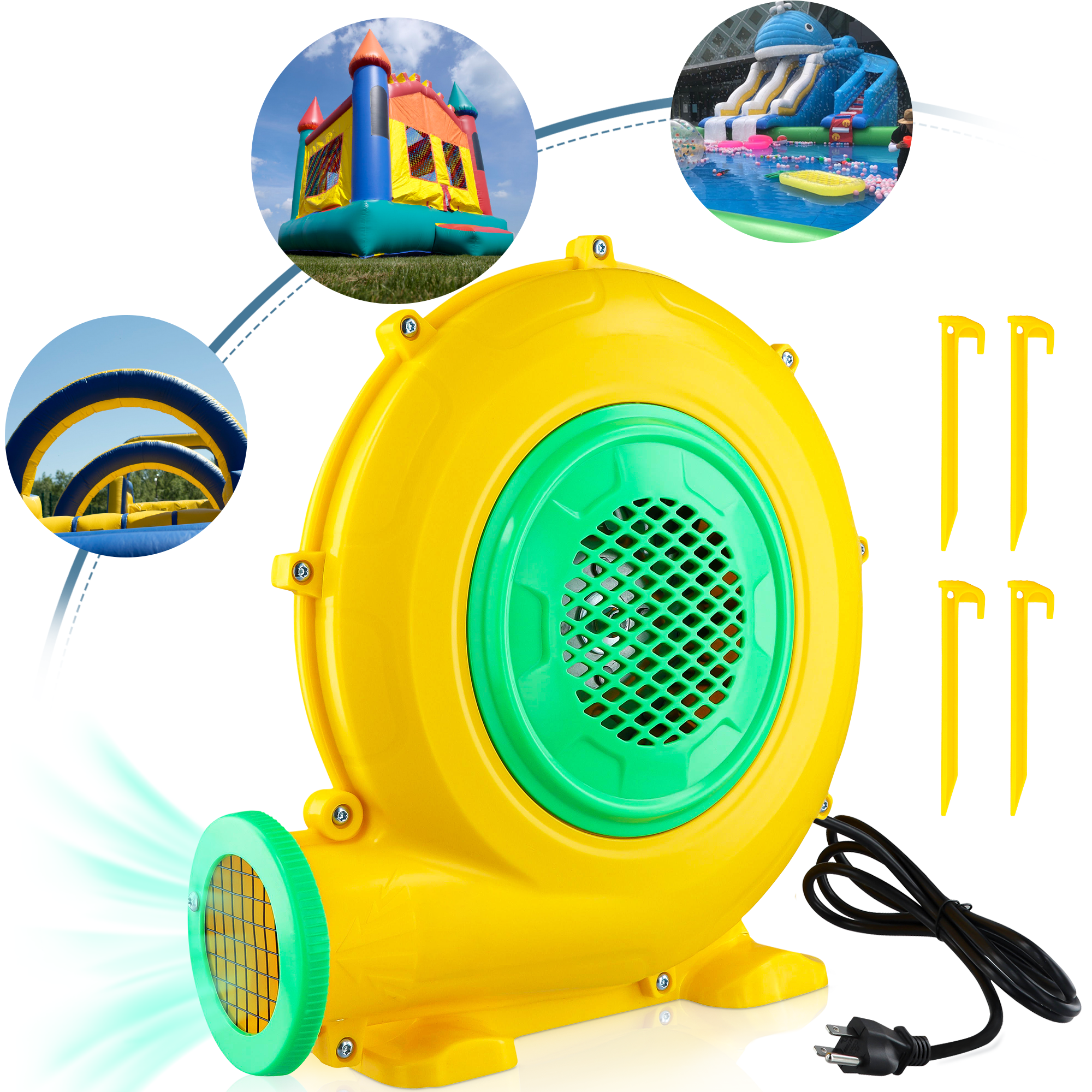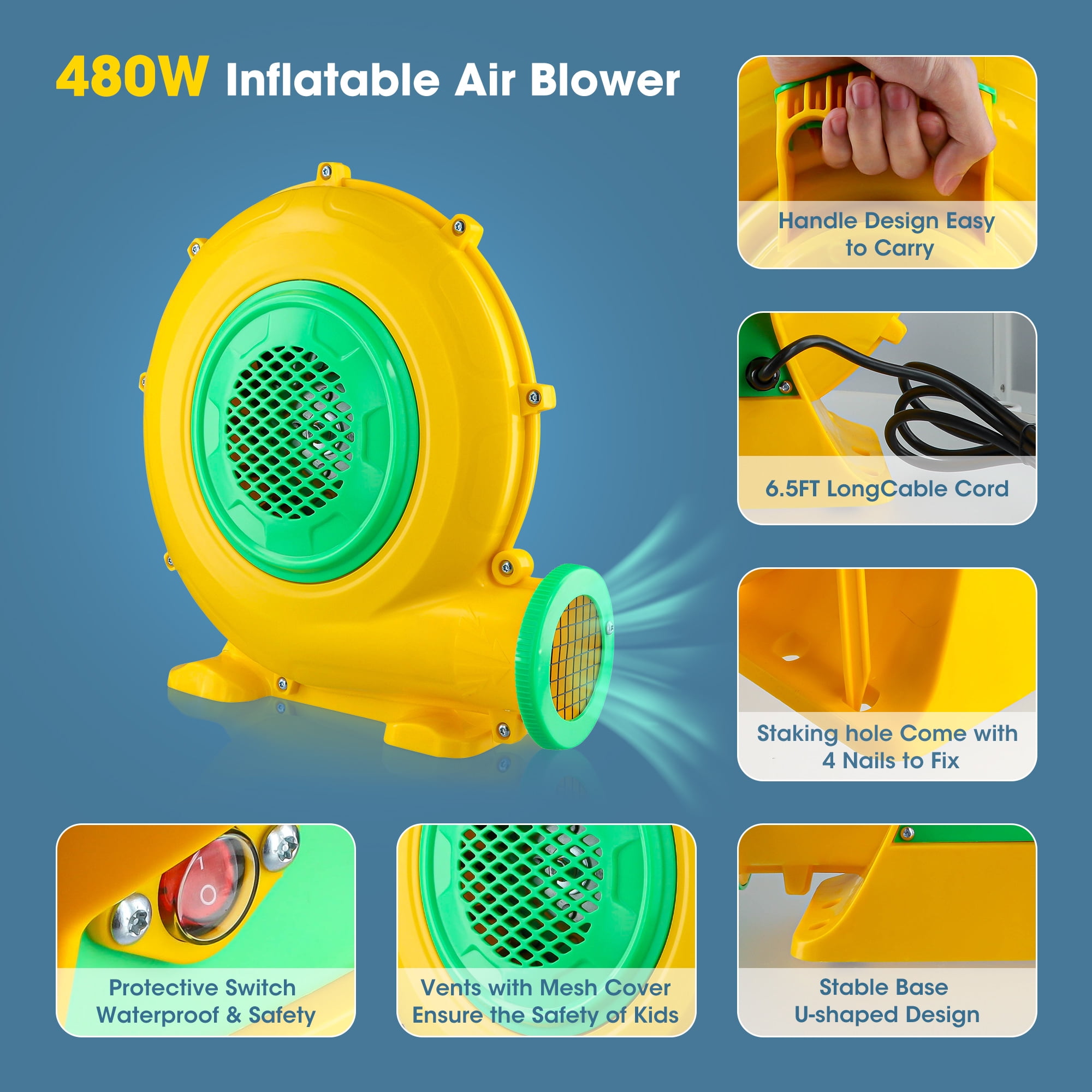 ▶ KEY FEATURES: 【480W POWERFUL BLOWER】 ⚡⚡Doulami air blower is equipped with a 480W super motor, providing strong impetus and saving more energy. Input Voltage: 110V-120V AC/60Hz. Outlet Diameter: 4.33 in. The air volume is 800 m³/h, so you can fill the inflatable that you need quickly and easily. 【SAFE DESIGN & EASY OPERATION】 ⚡⚡Our Air Pump Fan is made of flame retardant and environmental protection PP, fireproof and anti-static.It has a clear cover on the switch, which is safe enough for you to turn on/off in case it gets wet. 【COMPACT & PORTABLE AIR BLOWER】 ⚡⚡Our air blower pump fan is designed with a handle and 6.56ft cable, you can carry it to different occasion conveniently. Besides, the small size of this electric pump blower will not take up a lot of space. 【SILENT OPERATE】 ⚡⚡Adopts premium metal impellers and built-in bearing, both of which reduce noise greatly during operation.This air blower bump will bring your life a double advantage.This impeller and built-in bearing will greatly reduce noise spreading; While getting rid of the loud sound, this material of impeller will not increase the weight. 【WIDE USAGE】 ⚡⚡Our air blower is suitable for almost inflatable item, such as bounce houses, water slides, jumpers and so on, also perfect for Halloween, Christmas using, this air blower is perfect for inflating your festival decoration or kids’ inflatable toys. ▶ SPECIFICATIONS: Material: Flame retardant and environmental protection PP Air outlet diameter:4.33 “(outside) Input: 110V-120V AC / 60HZ 4.2A Wattage: 480W Fate of flow: 800m³/h Rotate speed: 3000RPM Line length: 200cm Noise:70 decibels Boost voltage: 1800PA Package Includes: 1* blower 4* floor nail 1* manual