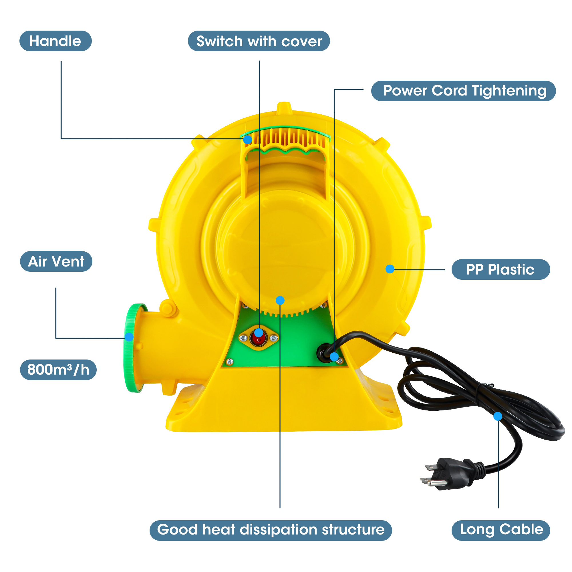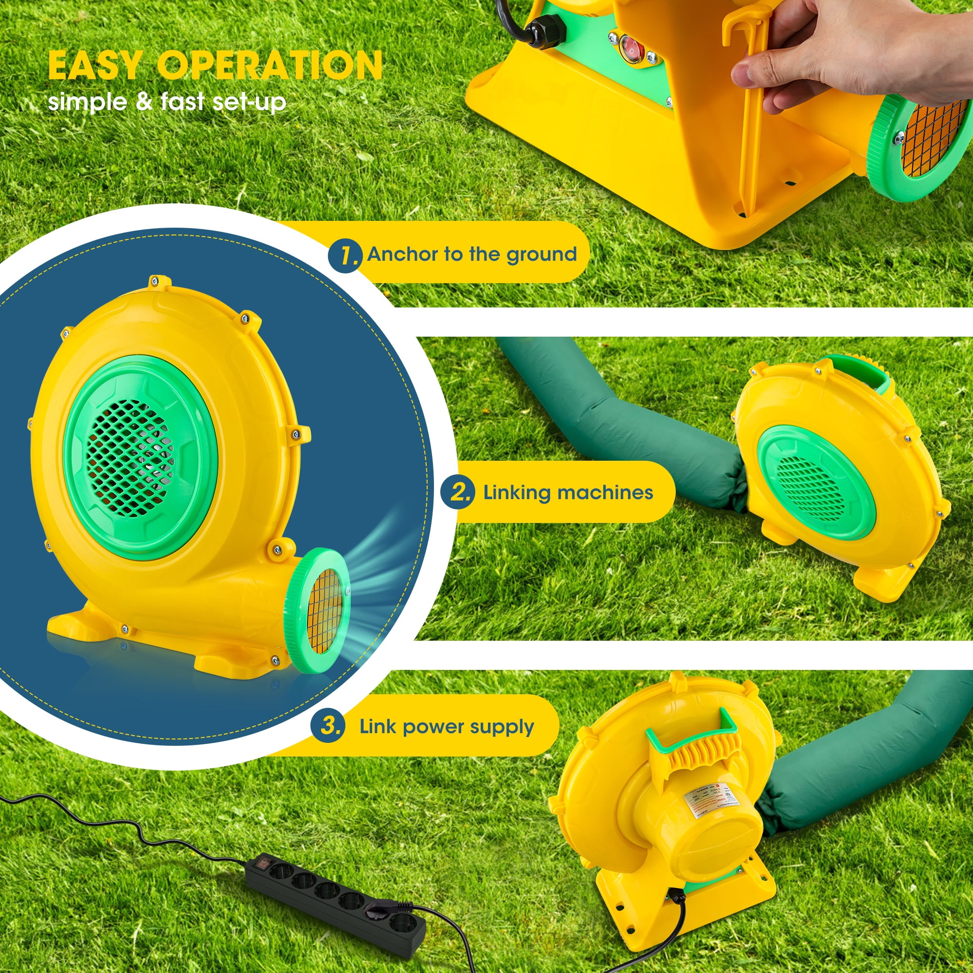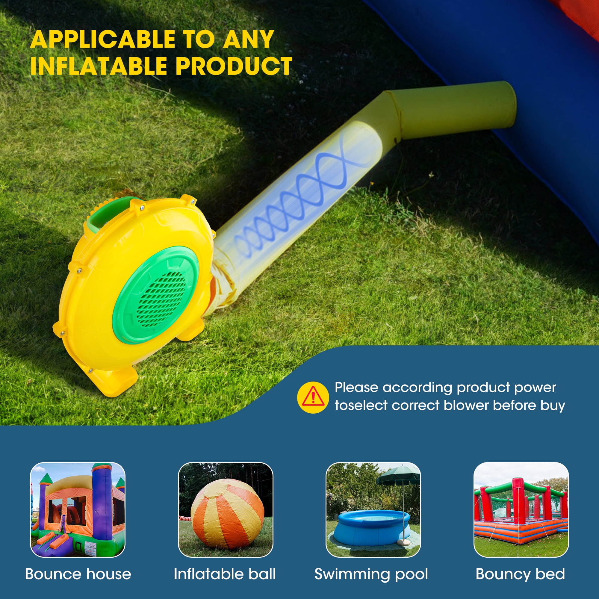 ▶ KEY FEATURES: 【480W POWERFUL BLOWER】 ⚡⚡Doulami air blower is equipped with a 480W super motor, providing strong impetus and saving more energy. Input Voltage: 110V-120V AC/60Hz. Outlet Diameter: 4.33 in. The air volume is 800 m³/h, so you can fill the inflatable that you need quickly and easily. 【SAFE DESIGN & EASY OPERATION】 ⚡⚡Our Air Pump Fan is made of flame retardant and environmental protection PP, fireproof and anti-static.It has a clear cover on the switch, which is safe enough for you to turn on/off in case it gets wet. 【COMPACT & PORTABLE AIR BLOWER】 ⚡⚡Our air blower pump fan is designed with a handle and 6.56ft cable, you can carry it to different occasion conveniently. Besides, the small size of this electric pump blower will not take up a lot of space. 【SILENT OPERATE】 ⚡⚡Adopts premium metal impellers and built-in bearing, both of which reduce noise greatly during operation.This air blower bump will bring your life a double advantage.This impeller and built-in bearing will greatly reduce noise spreading; While getting rid of the loud sound, this material of impeller will not increase the weight. 【WIDE USAGE】 ⚡⚡Our air blower is suitable for almost inflatable item, such as bounce houses, water slides, jumpers and so on, also perfect for Halloween, Christmas using, this air blower is perfect for inflating your festival decoration or kids’ inflatable toys. ▶ SPECIFICATIONS: Material: Flame retardant and environmental protection PP Air outlet diameter:4.33 “(outside) Input: 110V-120V AC / 60HZ 4.2A Wattage: 480W Fate of flow: 800m³/h Rotate speed: 3000RPM Line length: 200cm Noise:70 decibels Boost voltage: 1800PA Package Includes: 1* blower 4* floor nail 1* manual