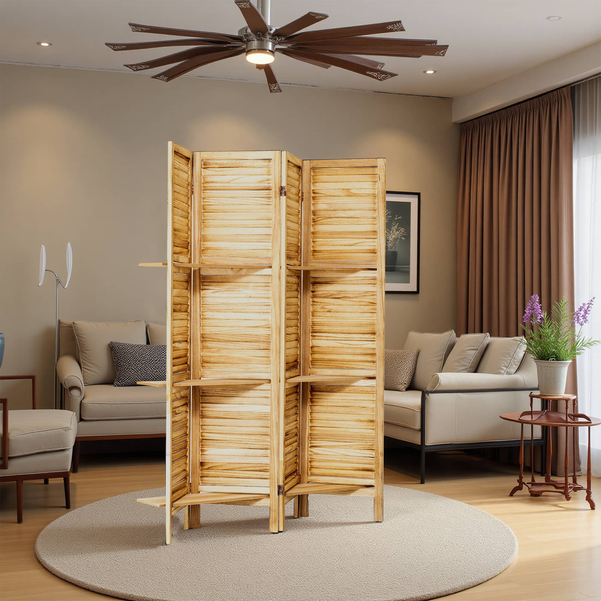 Dovelina 4 Panel Freestanding Wood Room Divider with Display Shelves, Natural Wood