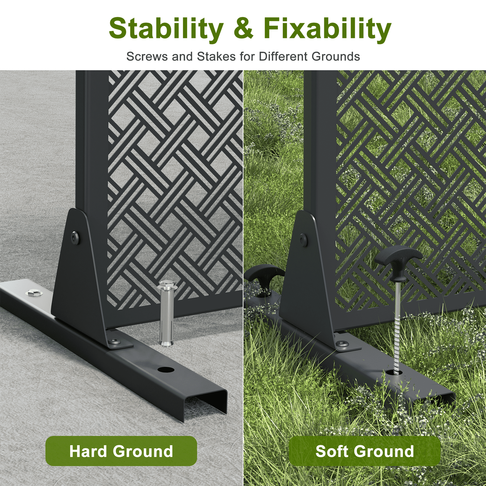 HIGH QUALITY MATERIALS:The privacy screens are made of laser-cut galvanized steel,which is durable.The privacy screen is good coating to prevent rust from weather. PRIVACY PARTITION:The size of the metal privacy screen is H 72in×W 35in,which can be very good to fulfill the role of partition privacy.If you think one piece is not enough,you can put several freestanding privacy screens together to form a big partition screen.You don’t have to destroy your house to build a divider wall. VARIOUS PRIVACY SCREEN OPTIONS:we have a variety of graphic screens,you can choose according to the style of the screen you like to decorate your space or the privacy of the screen you need. MULTIPLE PLACEMENT PLACES:Our screens can be placed both outdoors and indoors such as parks,yards,by the swimming pools,beach,bedrooms,kitchen,living rooms,balconies and other scenes that need to protect privacy or be decorative. A VARIETY OF INSTALLATION METHODS:Our screens can be installed horizontally or vertically according to your needs.Our privacy screens are easy to install and we have installation instructions.The privacy screenshot has special screws at the bottom to fix the screen without shaking.The privacy screens are free standing with stand and can be moved to different place according to your needs.