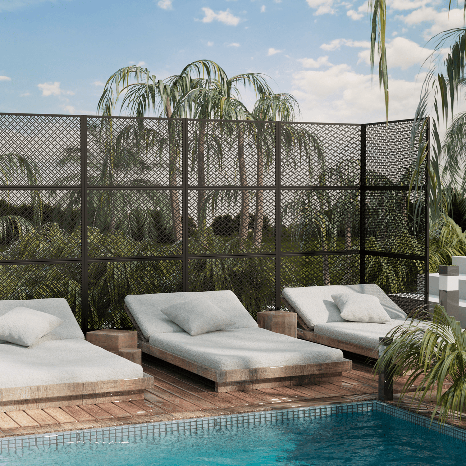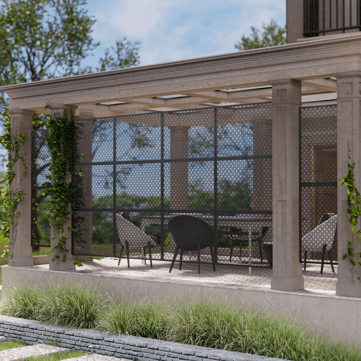 This metal privacy screen brings outdoor chic to your balcony or patio in an instant. Crafted from durable laser-cut steel,its vertical slat design allows you to shield yourself from prying eyes while still taking in the views. Stand it freely to form a stylish room divider or group multiple screens together for an enclosed getaway. Install it horizontally as a decorative barrier or vertically as a privacy partition up to 72 inches high. The powder-coated steel finish resists rust and weathering so it holds up season after season. Wherever you place this versatile screen—by the pool,on the deck or flanking your outdoor seating—it infuses your space with modern industrial charm while keeping the outside out and your privacy in.