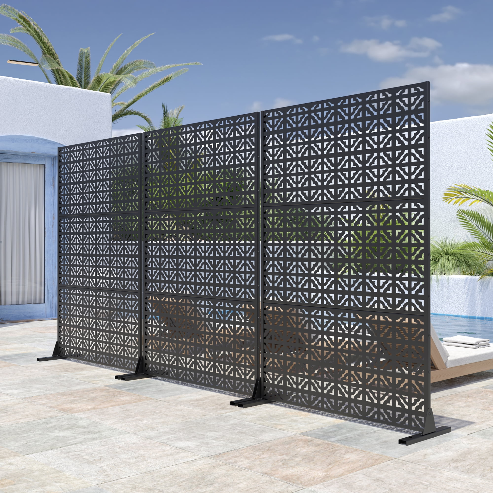 This metal privacy screen brings outdoor chic to your balcony or patio in an instant. Crafted from durable laser-cut steel,its vertical slat design allows you to shield yourself from prying eyes while still taking in the views. Stand it freely to form a stylish room divider or group multiple screens together for an enclosed getaway. Install it horizontally as a decorative barrier or vertically as a privacy partition up to 72 inches high. The powder-coated steel finish resists rust and weathering so it holds up season after season. Wherever you place this versatile screen—by the pool,on the deck or flanking your outdoor seating—it infuses your space with modern industrial charm while keeping the outside out and your privacy in.