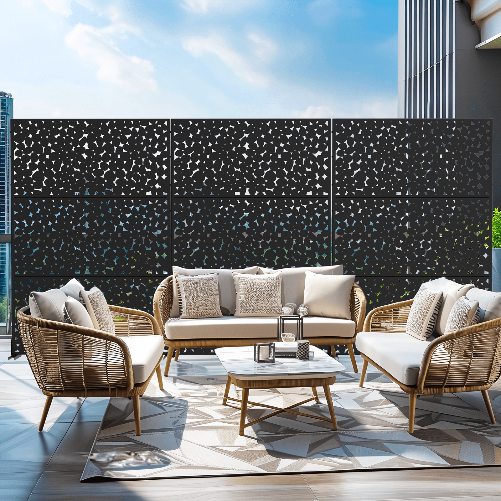 This metal privacy screen brings outdoor chic to your balcony or patio in an instant. Crafted from durable laser-cut steel,its vertical slat design allows you to shield yourself from prying eyes while still taking in the views. Stand it freely to form a stylish room divider or group multiple screens together for an enclosed getaway. Install it horizontally as a decorative barrier or vertically as a privacy partition up to 72 inches high. The powder-coated steel finish resists rust and weathering so it holds up season after season. Wherever you place this versatile screen—by the pool,on the deck or flanking your outdoor seating—it infuses your space with modern industrial charm while keeping the outside out and your privacy in.