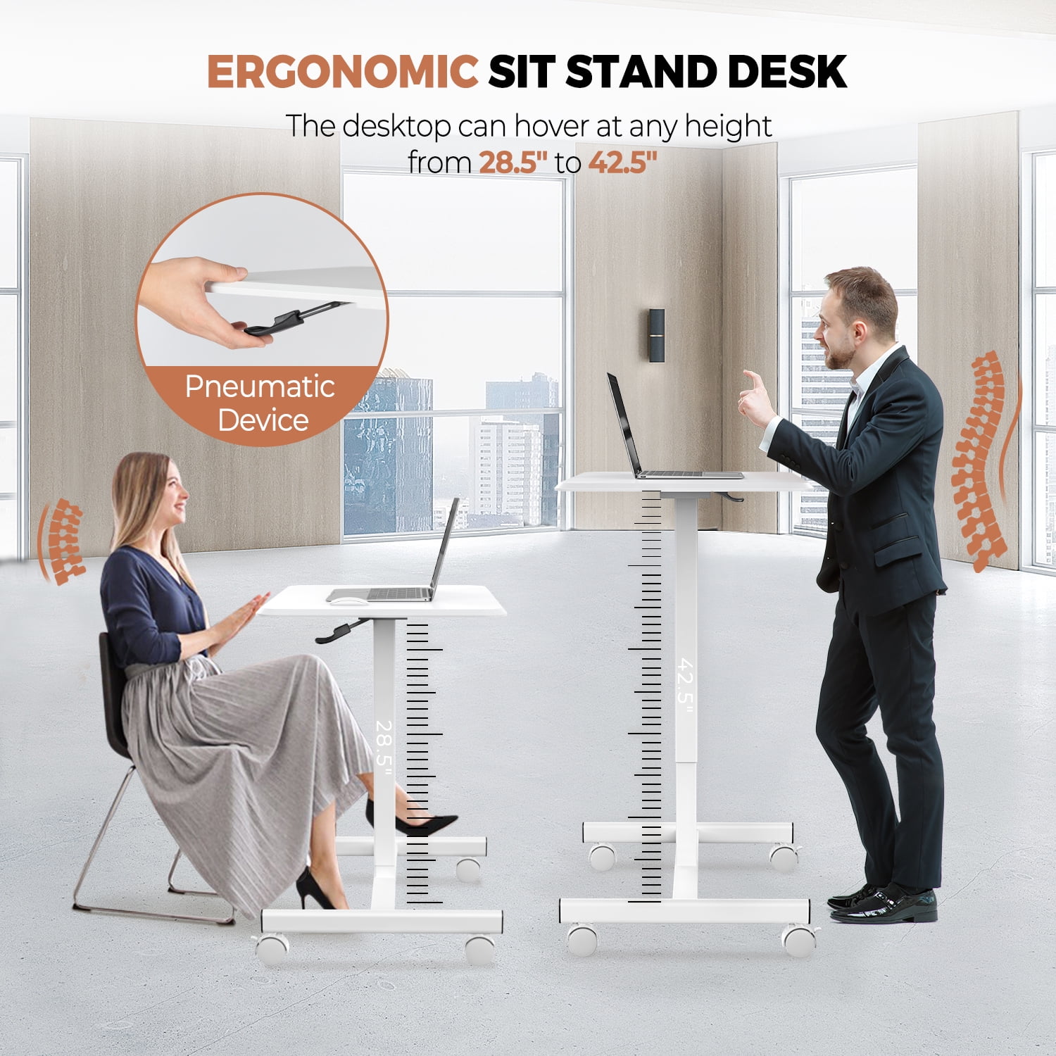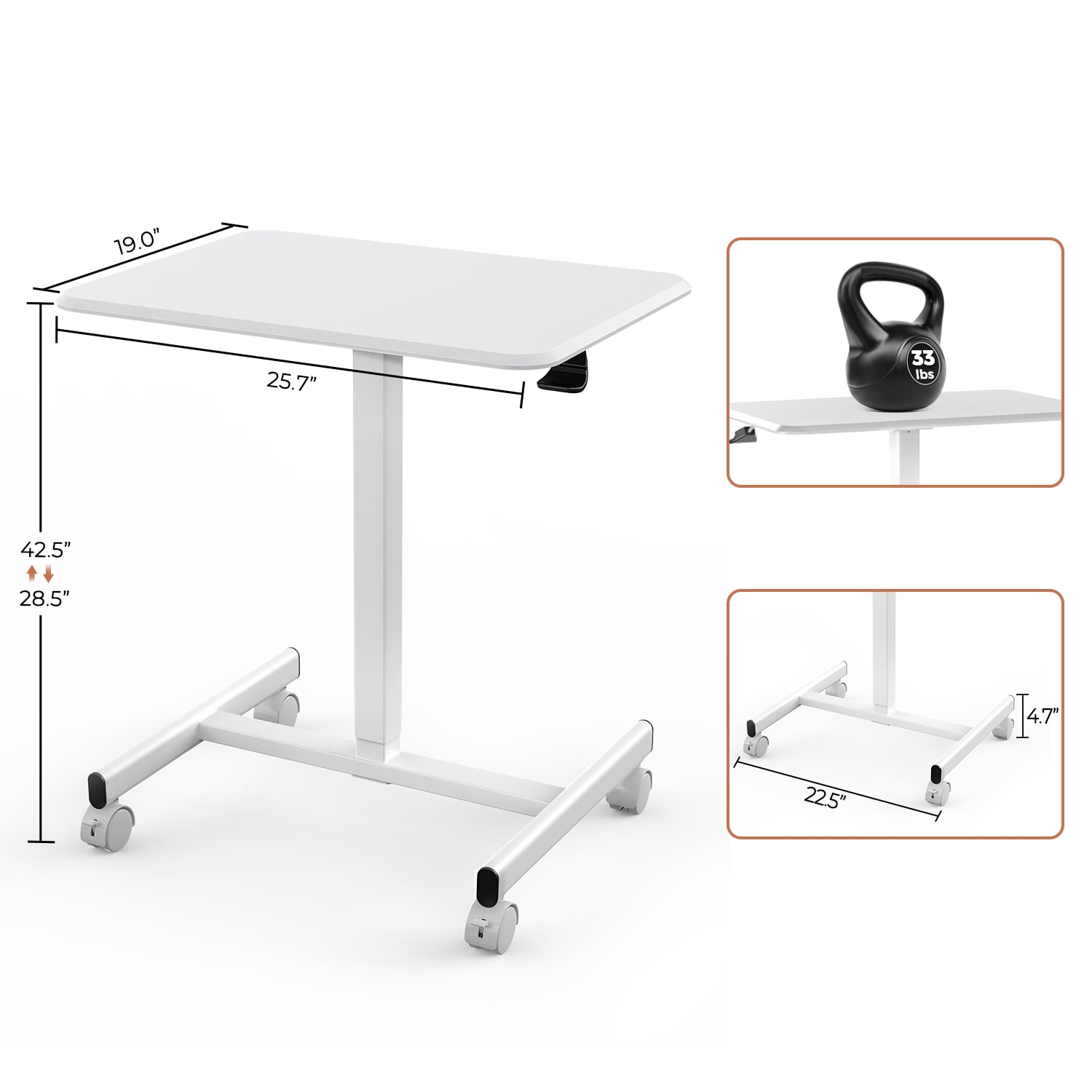 【Height Adjustable】 Driven by the powerful gas spring system when you press the handle beside the table, the height of this mobile standing desk with wheels can be changed from 28.5 to 42.5 inches in seconds with fast and smooth lifting, which can be a good solution to help you get rid of long sitting and enjoy health benefits of the small standing desk – with which you can stretch out your legs, better focus while working, reduce your back pain and lose the weight. 【Premium Material】The mobile laptop desk legs are made of durable thickened steel frames, making the desk wear well, helping prevent scratches, and ensuring superior stability and safety.4 flexible wheels let you enjoy smooth-gliding mobility with silent casters, 2 of which are lockable to keep the portable standing desk stable. The 360°rotation wheels make it easy to move evenly on the carpet. 【Saving Space】Adopted a combination of single-column structure design and simple base design, which is collapsible to help save space while giving your legs plenty of room to stretch when you sit down. Wheels with brakes allow you to stop wherever you want. You can slide this standing desk with wheels under your sofa or bed easily. It will reduce the occupied floor space while ensuring ample working space. 【Versatile Applications】This standing laptop desk provides a collapsible, mobile, and ergonomic working space(25.7*19 In/33Lbs), fitting almost any size of laptop or tablet with the keyboard. It’s also perfect for professional workplaces like offices, art and music studios, libraries, dental clinics, optometrists, and doctors’ offices. 【Easy to Assemble】The packages will come with all the tools and accessories for quick assembly, which allows only about 10 minutes to assemble your standing desk adjustable height with detailed instructions and the installation video. If you have encountered any problems, we would be delighted to help you find a solution and reply to your email within 24 hours.