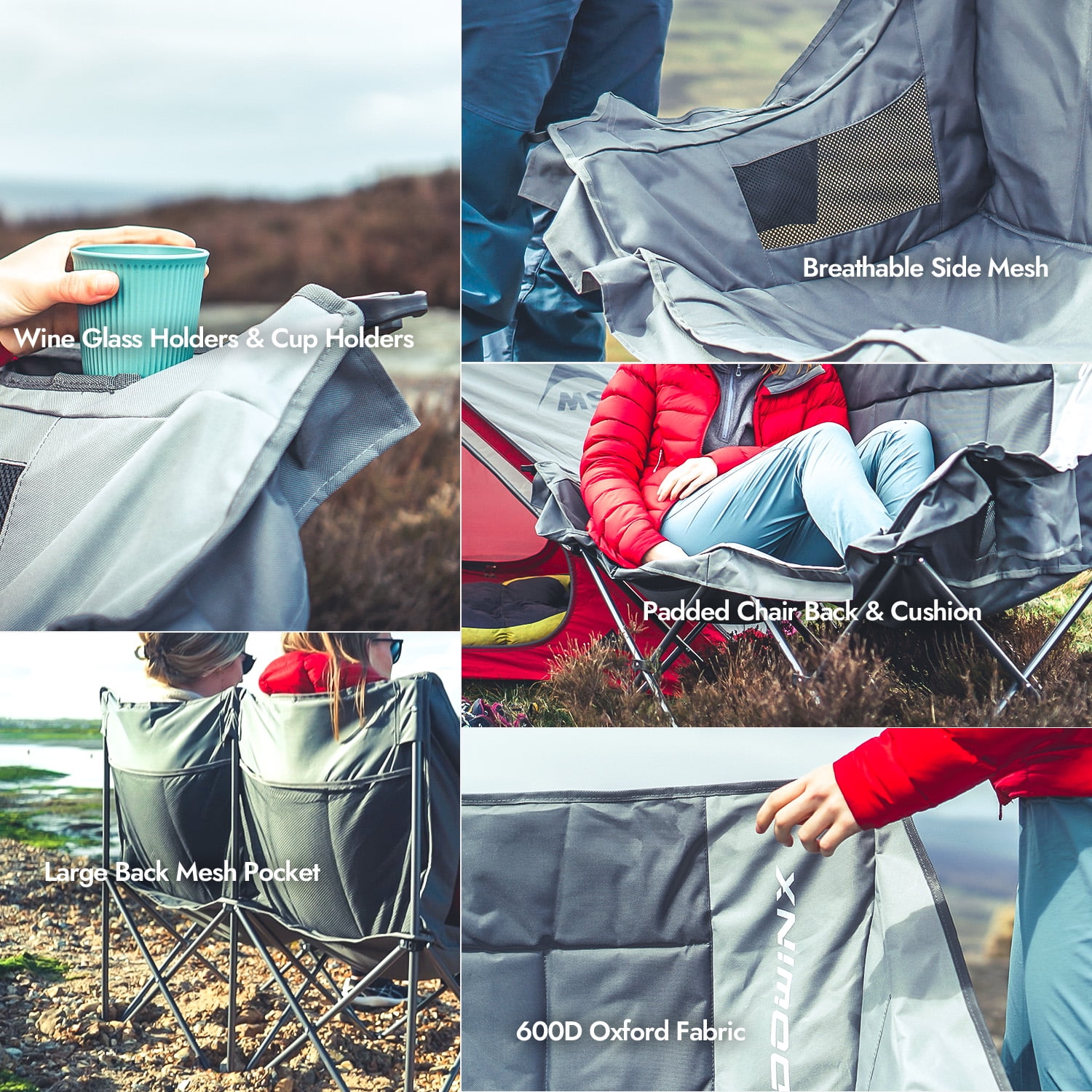 Dowinx Double Camping Chair Loveseat, Portable Folding Outdoor Lawn Chair with Padded Seats, Armrests, Side Pockets, 440lbs Capacity for Beach, Patio, Picnic – Gray PRO