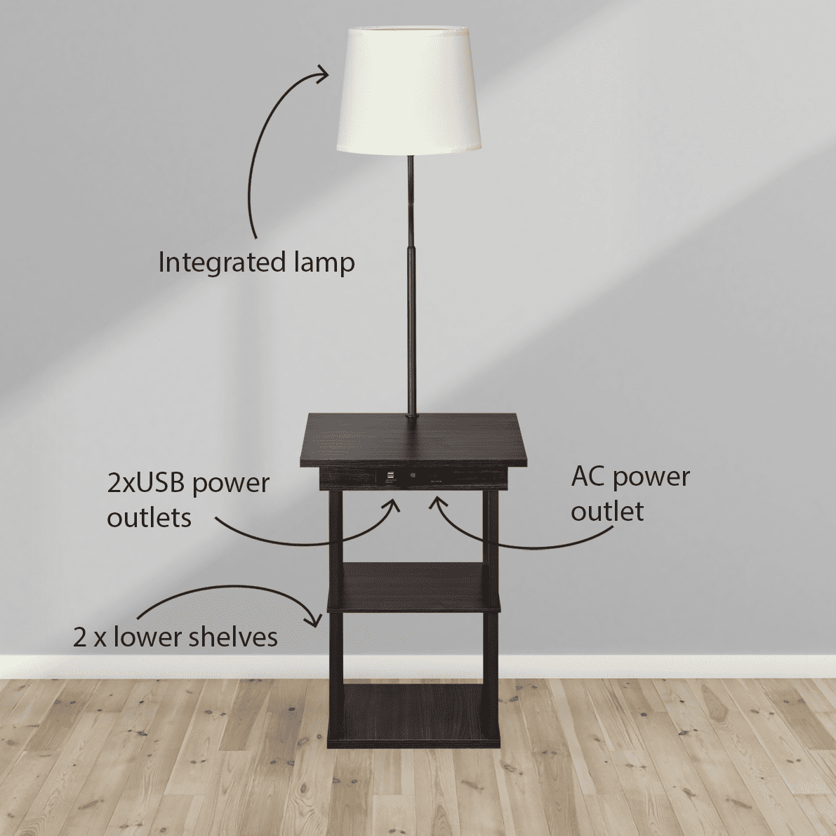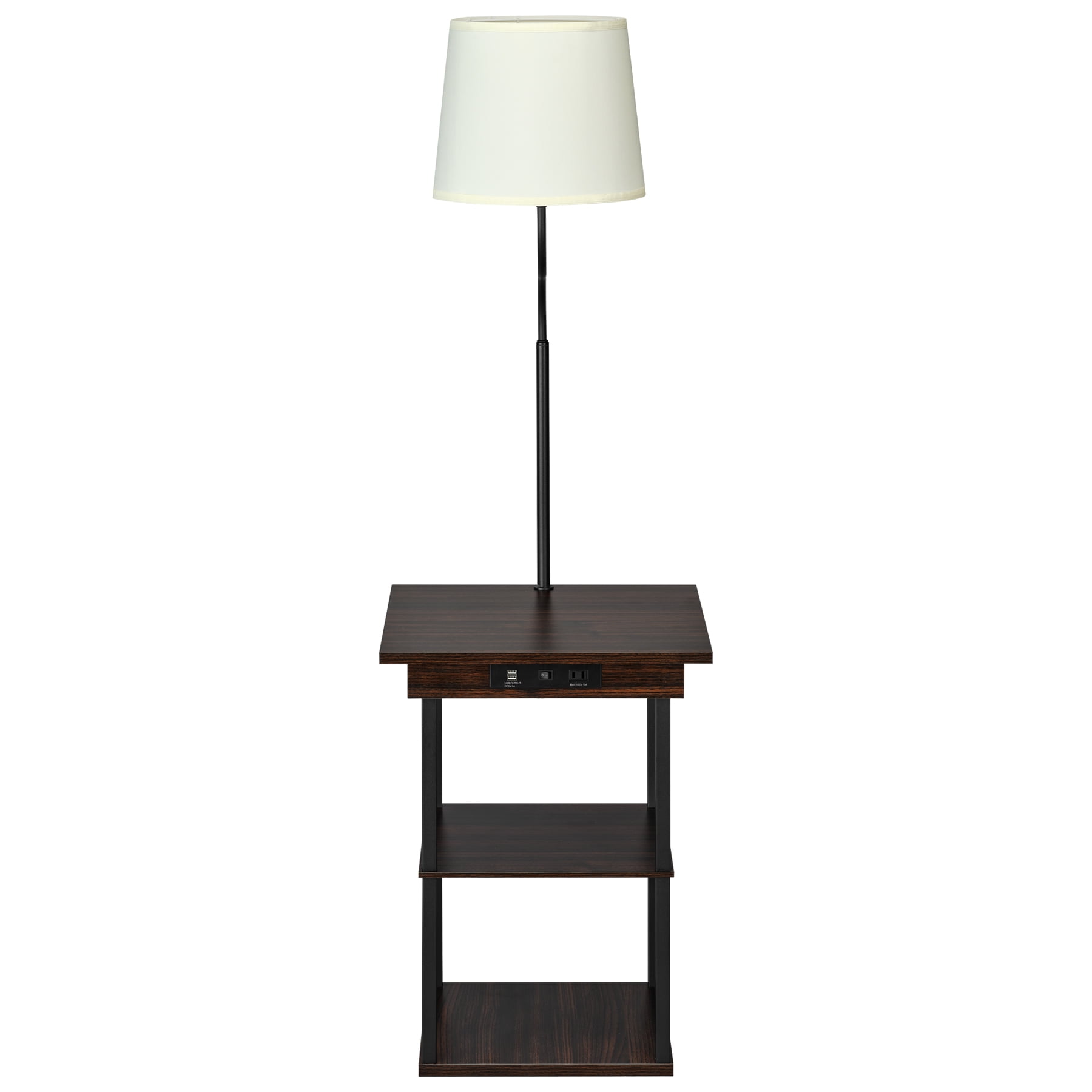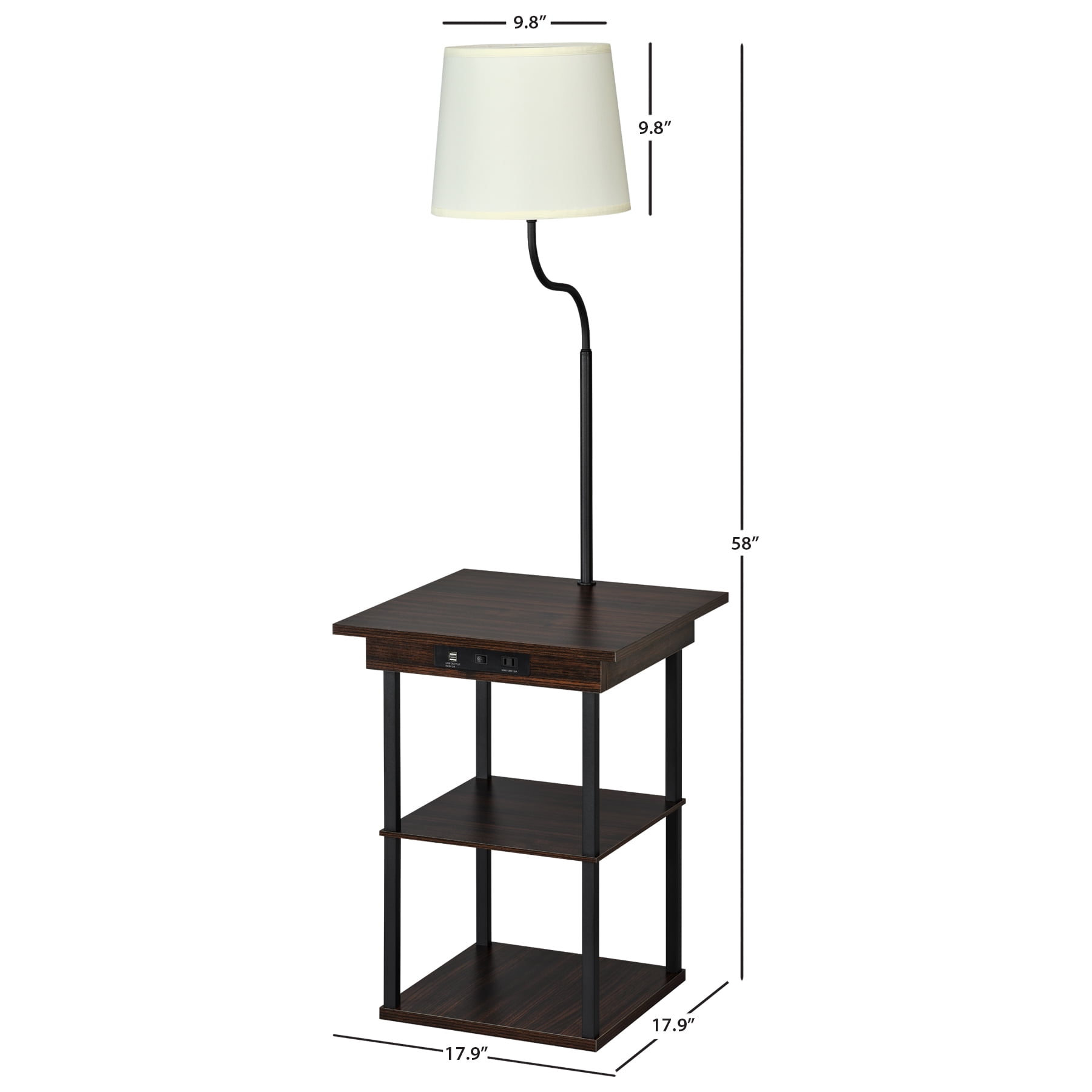 Dimensions: 18.11″ W x 18.11″ D x 59.1″ H inches Maximum weight limit: 44 lbs Sleek walnut finish 2 USB ports (5V/2A total) AC receptacle (2-pin 125V/8A 60Hz) Engineered wood table with installed charging station and 2 shelves White linen lamp shade with PVC backing: 11.8″ bottom diameter, 9.84″ top diameter, 9.84″ height LED light bulb: type A60/9W, 3000K warm white, E26 base Light on/off switch AC power: built-in AC power cable Assembly required, hardware and instructions included 1 Year Limited Warranty User’s Guide