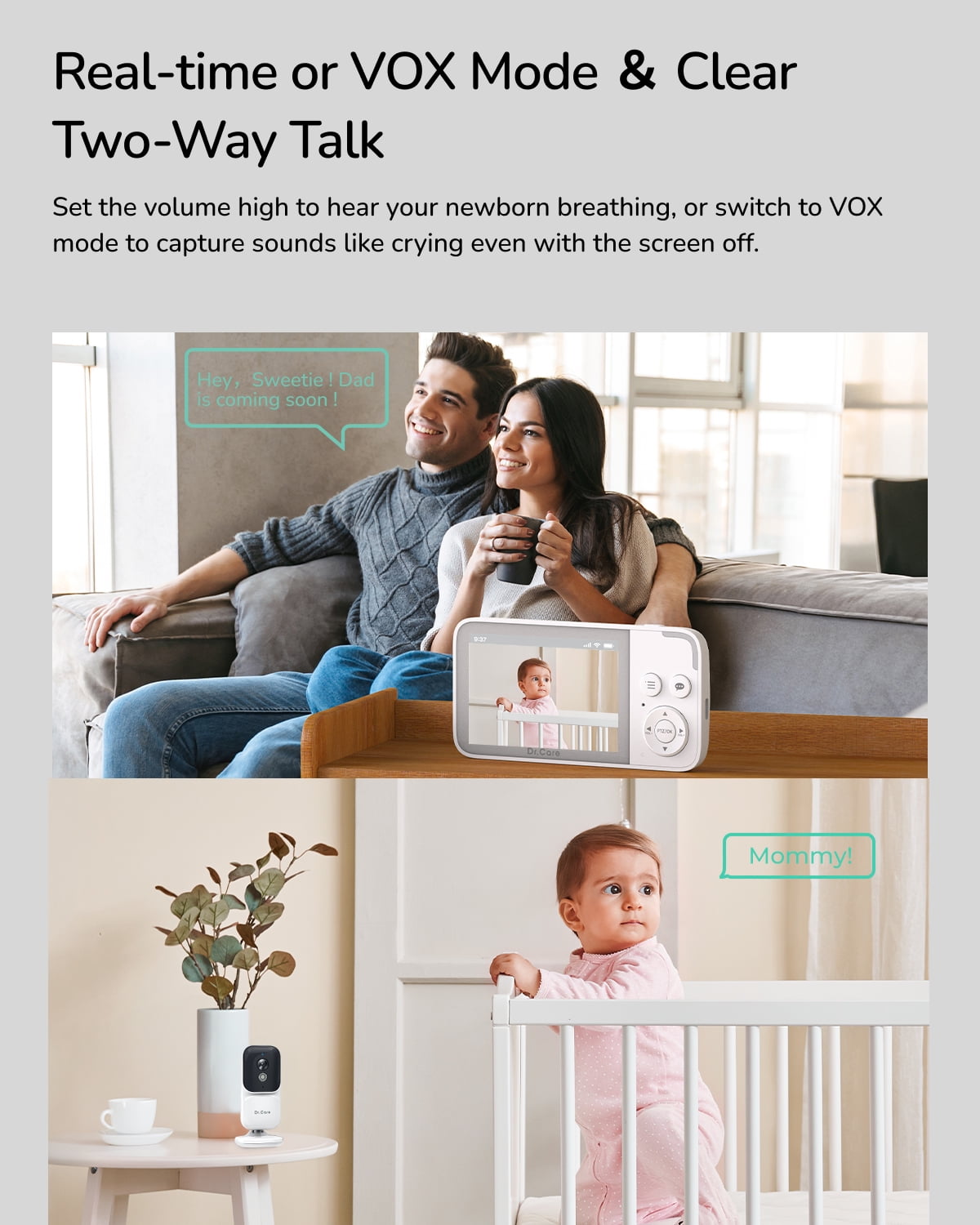 Enjoy Ultimate Clarity and Secure Non-WiFi Recording: Featuring a 3.5″ 720P HD display and auto infrared night vision, it captures every moment day and night. Safely store video with SD card loop recording (SD card not included, supports FAT format TF cards). Dual Mode Voice Monitoring: High-sensitivity microphones capture all sounds, including your newborn’s breathing. Switch to VOX mode to capture louder sounds like crying. (The monitor stays silent until a sound exceeding your VOX settings activates it.) Stay Securely Connected to Your Baby Anywhere: Trusted by thousands of families worldwide, the Dr.Care monitor uses a secure 2.4GHz channel with FHSS technology, ensuring only you can hear, see, talk to, record, and monitor your baby. With a range of up to 1000ft, you can keep an eye on your baby from any room or even the yard, making sure you never miss a moment. Easy Nursing Day and Night: Provides up to 16 hours of audio-only and 12 hours of video streaming, allowing you to monitor your baby throughout the night. Enjoy ultimate clarity and peace of mind all day and night with 8 pediatrician-recommended lullabies, from gentle tunes to calming sounds, to help your baby relax and sleep peacefully. Customizable feeding reminders keep your baby’s schedule on track. What You Get: At Dr. Care, we help every parent embrace the joy of parenthood without sacrificing personal time. Package includes: 1 Dr. Care NeoView baby monitor parent unit, 1 baby unit, 2 USB-C charging cables, 2 power adapters, and 1 user manual. Covered by a 1-year quality warranty with an additional 6-month warranty upon registration, plus 24/7 customer support.
