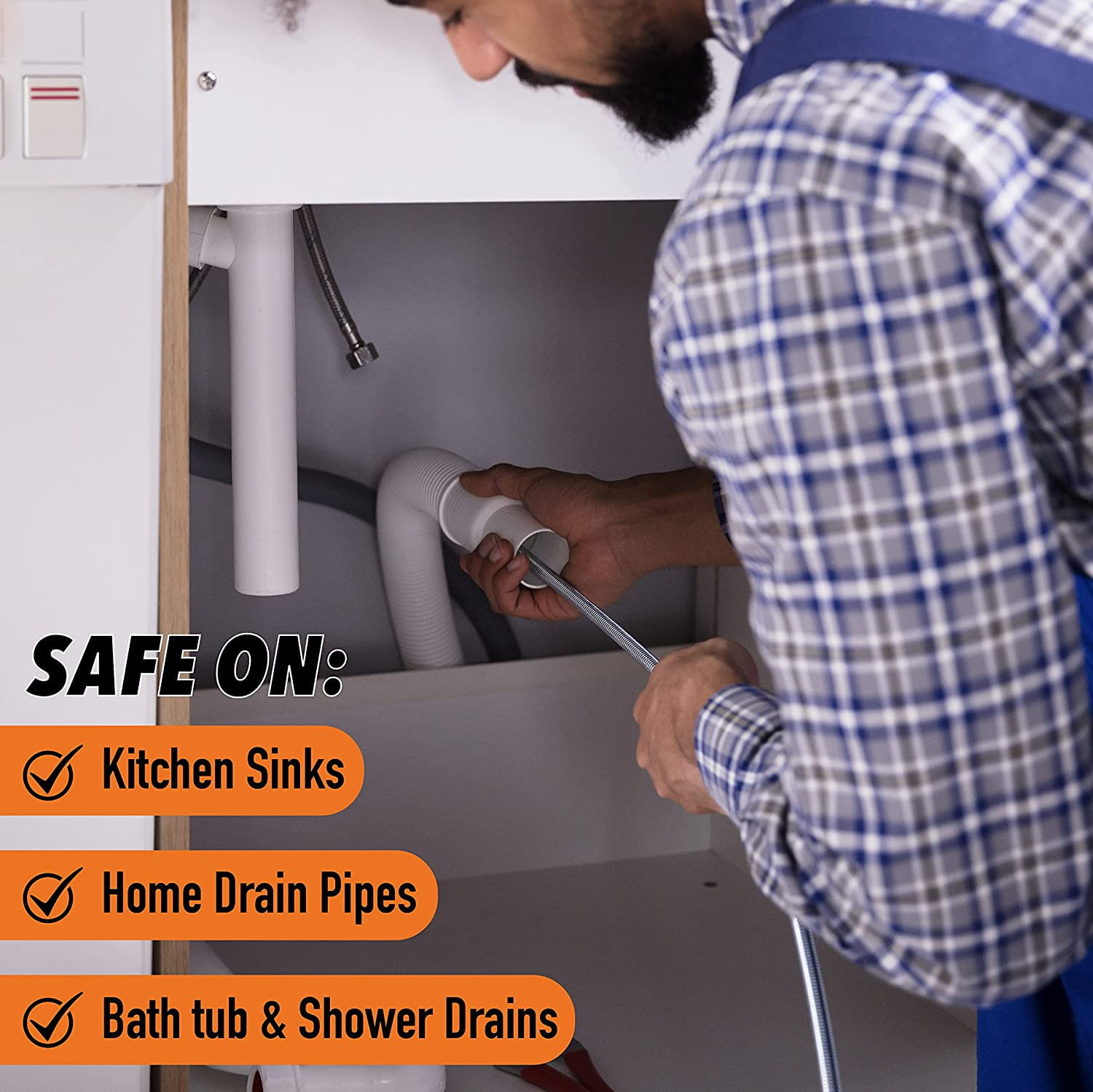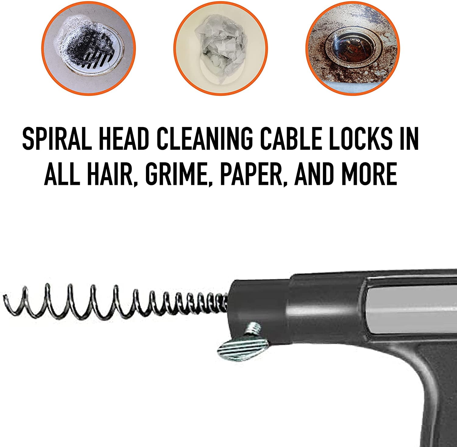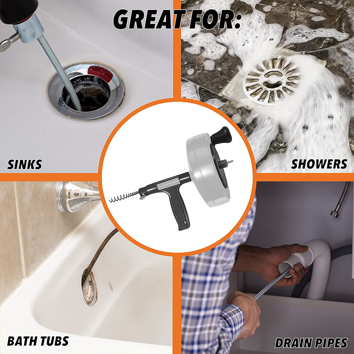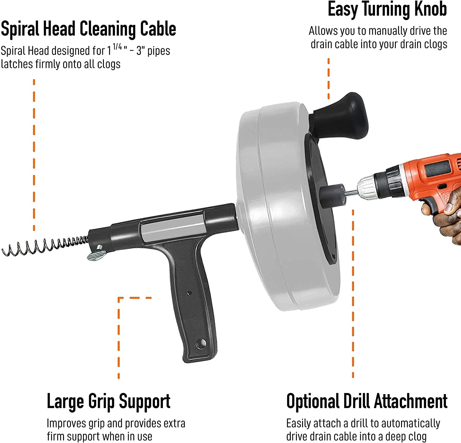 50 FT Spin feed Drain Auger Our 25 Foot Drain Auger is a great household tool for quickly unclogging any drain including kitchen and bathroom sinks, bathtubs, showers, and drainage pipes. Save yourself a big plumbing bill by trying to unclog the drain yourself first. Hands Free Power: Combining the best features of our Power Pro drill auger along with SPINFEED technology enables completely mess free operation. The drain cable extends automatically as the drum spins with the simple press of a lever, unlike other drain augers which require you to manually pull the cable out as you go. You can also turn the drum manually using the turning knob if you want to avoid using a drill.