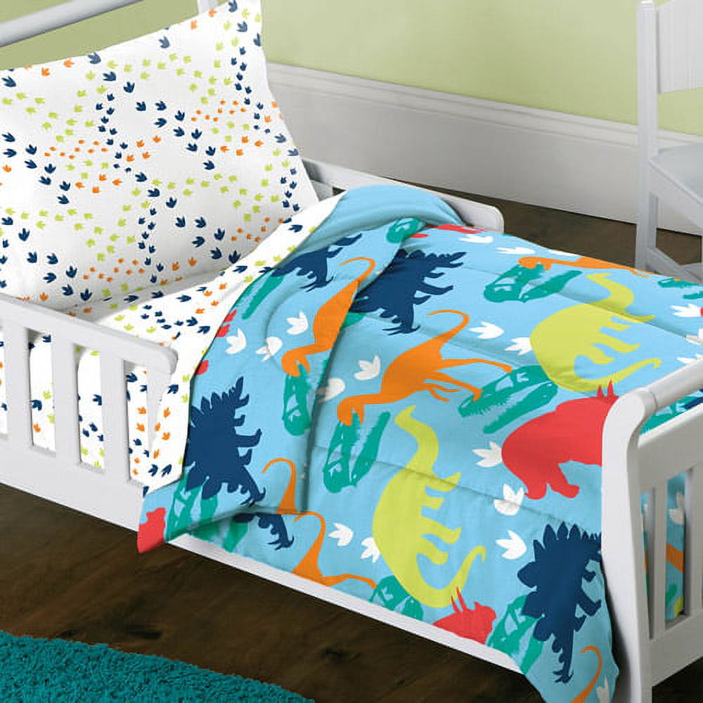 This dinosaur toddler bedding set creates a prehistoric feel for a child’s bedroom that any toddler will love. The four piece set comes with a colorful comforter and sheet set to fit a toddler size bed. Set includes: One (1) comforter, one (1) flat sheet, one (1) fitted sheet and one (1) pillowcase. Gender: Male Style: Patterned. Comforter pattern: Dinosaurs Comforter reverse: Solid. Comforter detail: Printed fabric.Sheet set color: Multicolored. Sheet weave: Plain. Fitted sheet pocket depth: 8 inches. Fully elasticized fitted sheet: Yes. Sheet thread count: 180 Materials: 60-percent cotton/40-percent polyester. Care instructions: Machine washable.Dimensions. Comforter: 42 inches wide x 58 inches long. Flat sheet: 45 inches wide x 60 inches long. Fitted sheet: 28 inches wide x 52 inches long. Pillowcase: 20 inches x 30 inches. The digital images we display have the most accurate color possible. However, due to differences in computer monitors, we cannot be responsible for variations in color between the actual product and your screen.