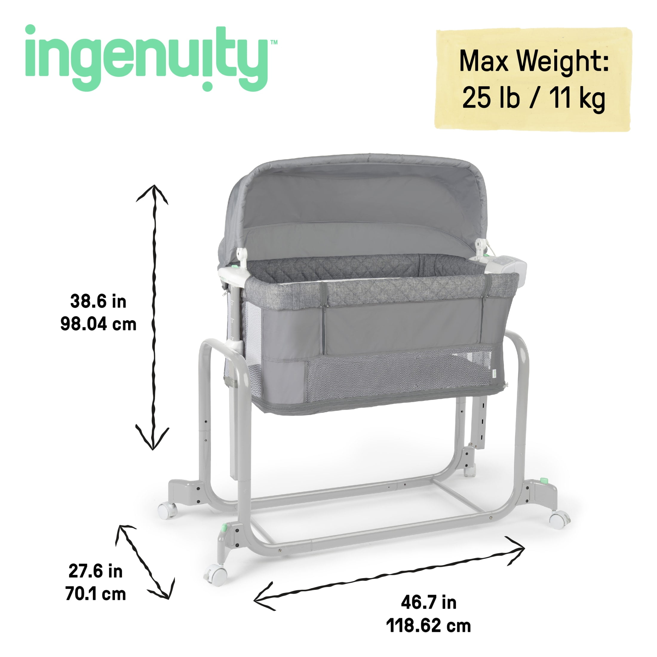 Get 3 modes in one with the Ingenuity Dream Hero Starlight; 3 modes of use: bedside sleeper, bassinet and crib; securely attach to your bedside with safety straps in bedside sleeper mode 4 height adjustments accommodate the height of your bed for safe bedside sleeping and easier access to your baby; lower the mattress as baby grows to extend use up to 12 months in crib mode Twinkling canopy soothes baby; also includes vibrations, music, white noise; Breathable mesh provides airflow and visibility so you and baby can sleep easy Easy to move from room to room for naptimes or when baby graduates to the nursery; locking wheels ensure secure and stable placement; mattress is designed with the right firmness for baby Includes 1 machine washable sheet; quilted fabric details on the frame provide luxurious comfort with modern gray fabric to fit your home aesthetic; dimensions: 38.6″ (H) x 46.7″ (W) x 27.6″ (D); ages 0-12 months or up to 25 lbs