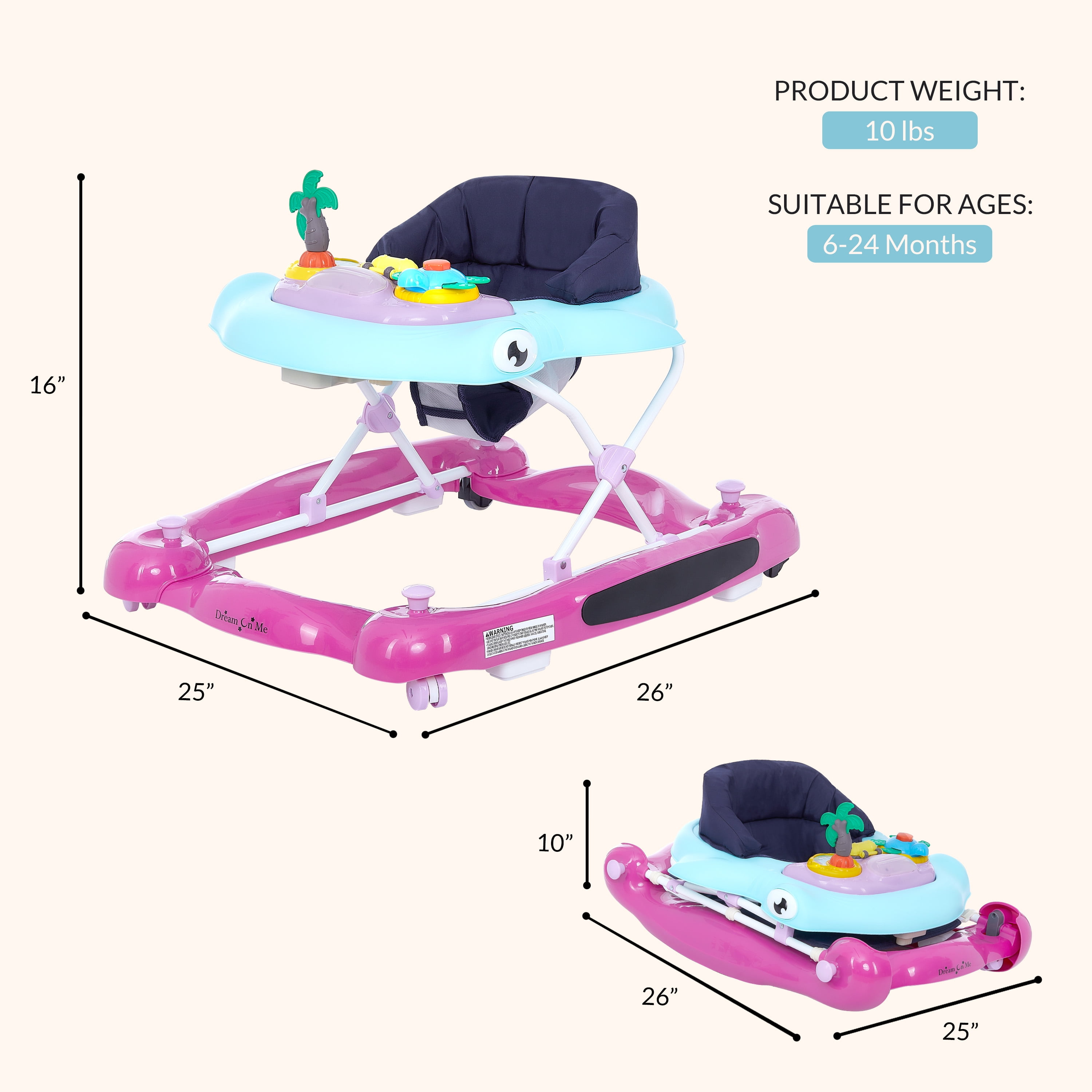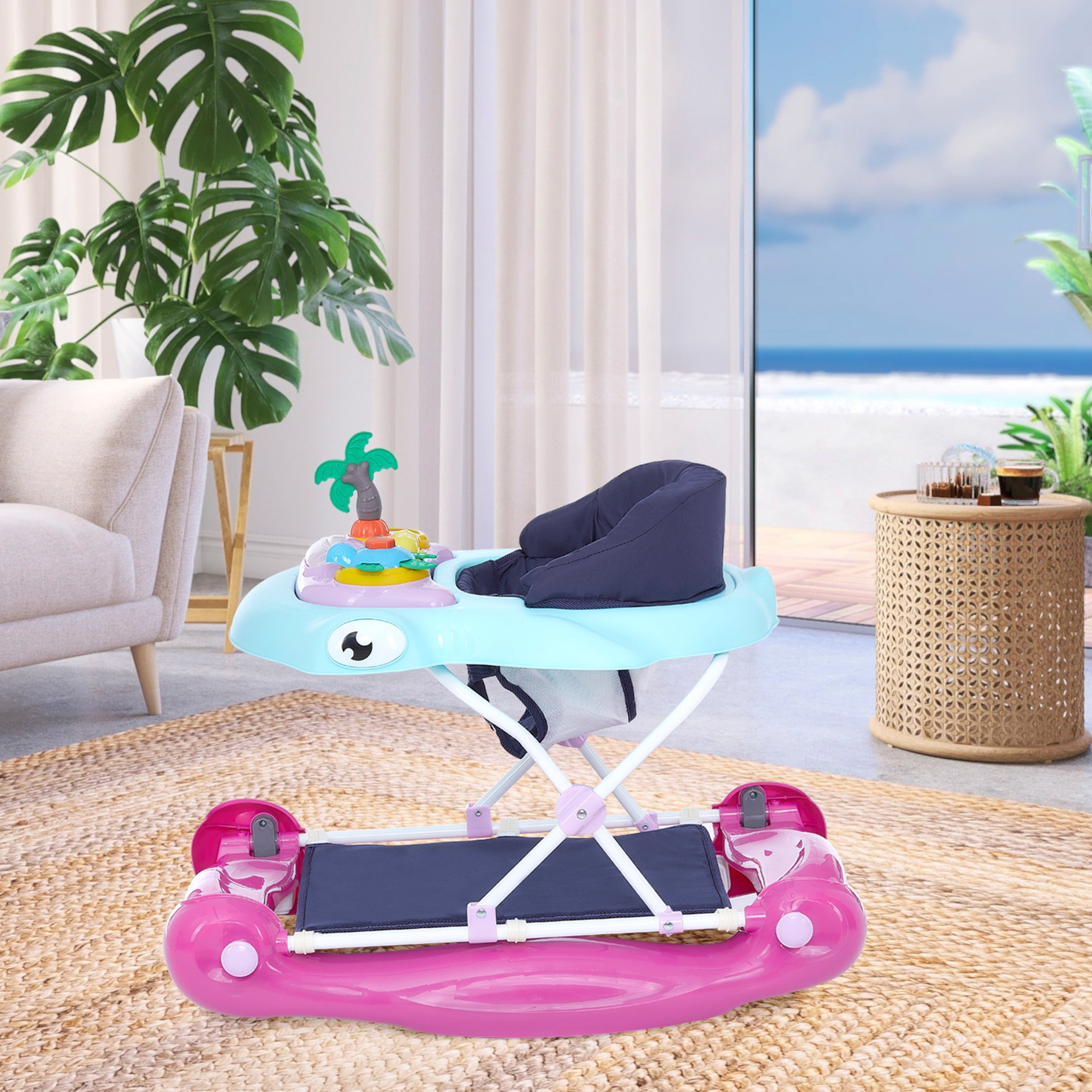 Let your baby discover the magical world of walking in the 2-in-1 Aloha Fun Activity Baby Walker. Let them take those exciting first steps, safely in the seated activity walker with entertaining toys to keep them company. And when those tired legs need a rest from exploring, use it to relax! The Aloha comes with multi-directional wheels for easy and smooth maneuvering. It conforms to ASTM F977 Safety Standards. Is suitable for babies between 6 and 24 months of age. Let your child develop their fine motor skills playing with the fun toys on the colorful removable toy tray. Below it is a fixed snacks tray for quick bites! The Aloha keeps pace with your growing baby with the 3-position height setting. Use the removable fabric footrest when stationary. It comes in charming colors and prints. The seat-pad is comfy and padded; cleaning is easy – simply remove and machine wash the pad when it gets dirty. Clean plastic parts with a damp cloth using mild soap. The Aloha folds compactly making it convenient for storage and travel. Products specs are 26 L x 25 W x 16 H inches and it weighs 10 lbs.