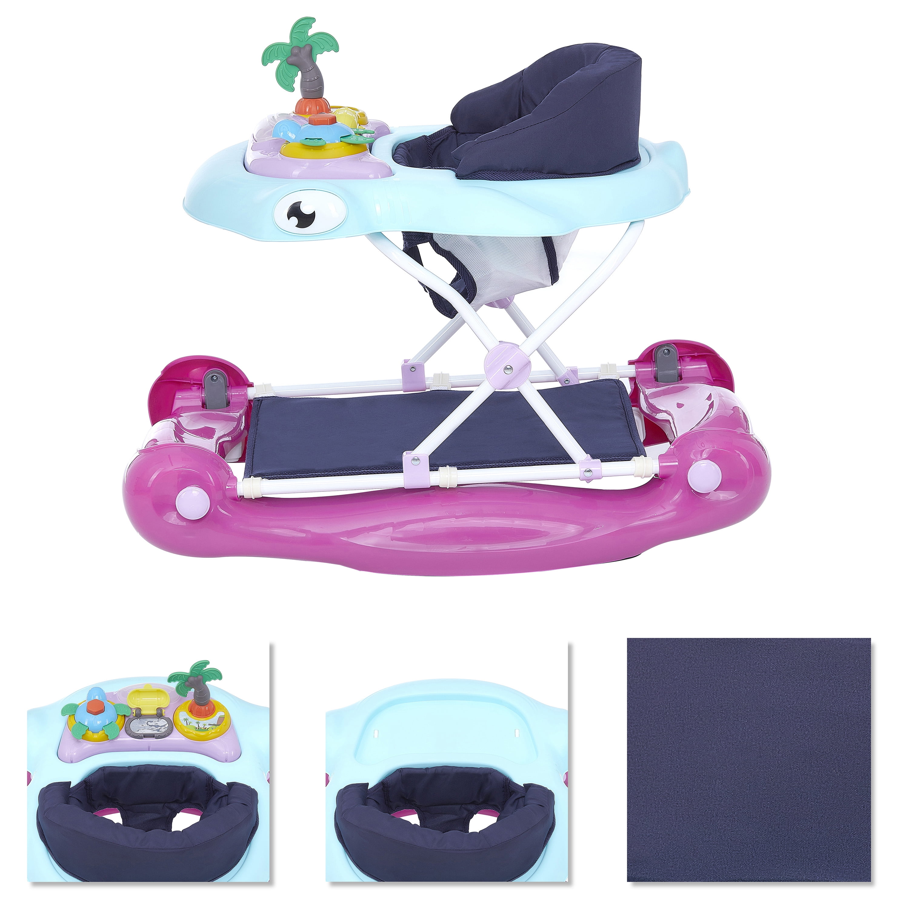 Baby Walker suitable from 6 months to 24 months 3 height positions adjustment as your little one grows Colorful and comfy padded seat. Removable toy tray Handy compact flat fold for storage and travel Conforms to ASTM F977 Safety Standard Multi-directional wheels transition easily from floor to carpet Multi-functional toy tray Removable snack tray Removable And washable seat cover.