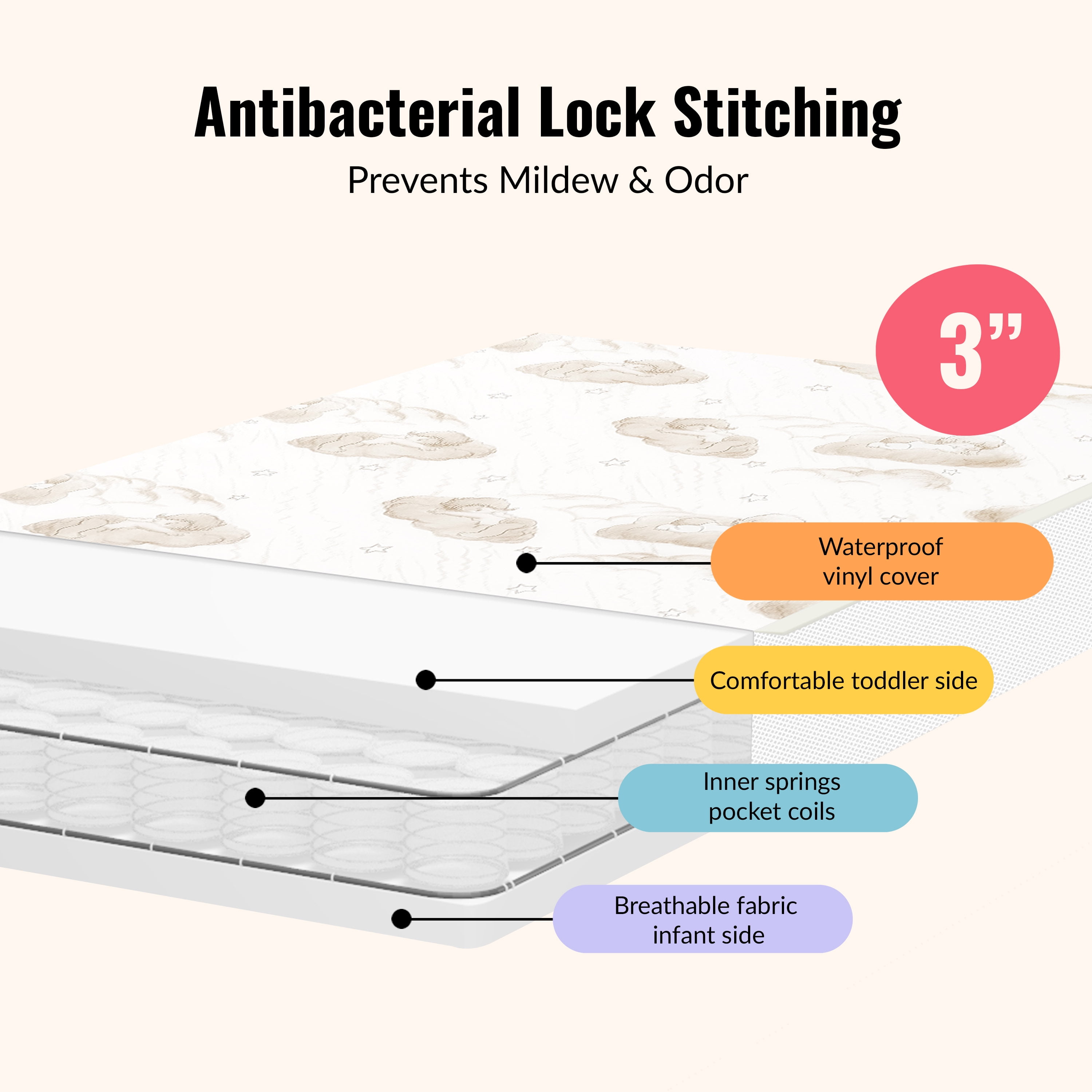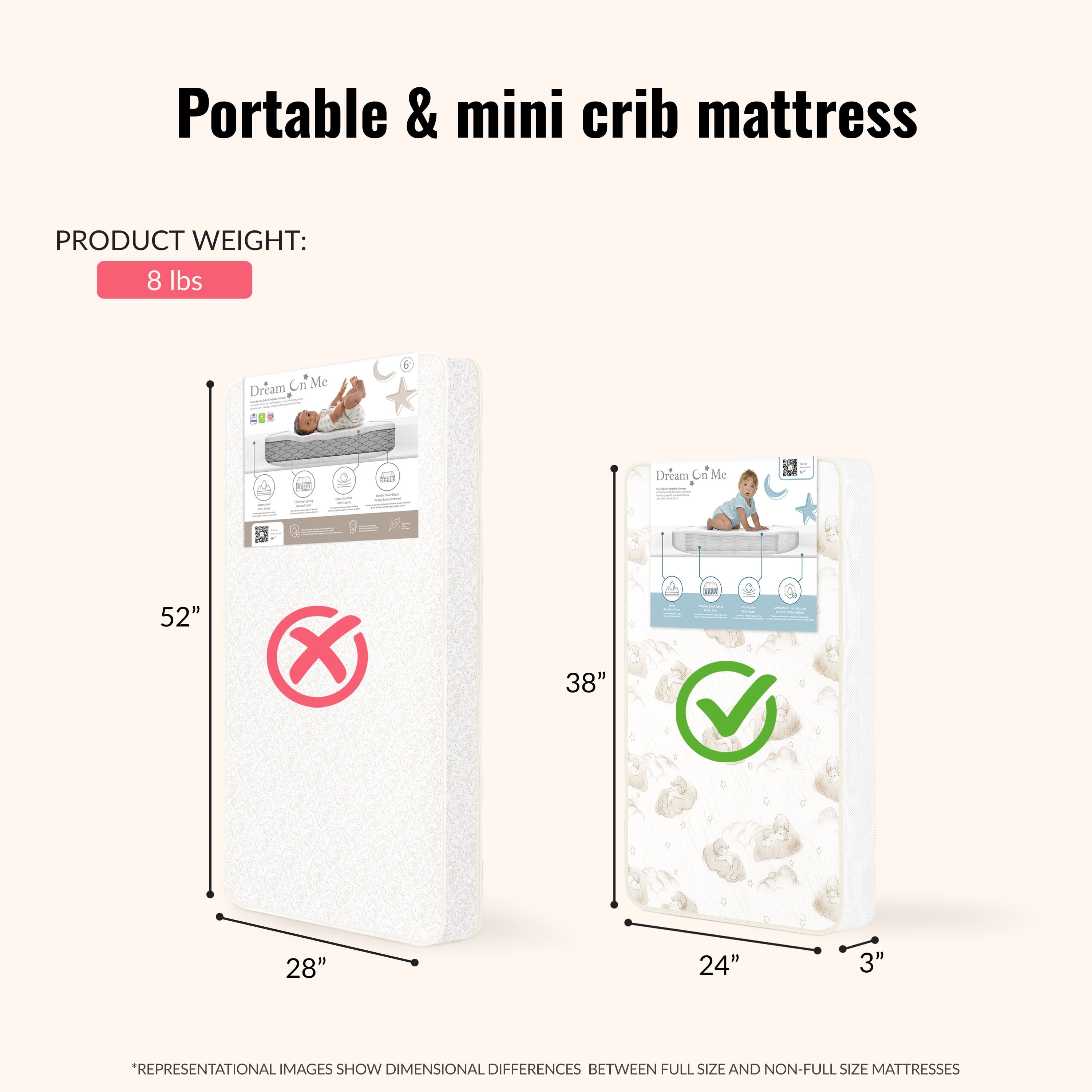 Dream On Me 2-In-1 Breathable Two-Sided Mini/Portable mini Crib coil Mattress: It has a Flat Surface. Breathable Mattress cover Promotes airflow Laboratory tested for air / water vapor permeability 2 Hypo-allergenic layers offer cushioned comfort for infants and toddler Lightweight interwoven, heat tempered coils offers a firm foundation and excellent support Reinforced- waterproof cover and binding resist liquids and stains Fits all standard size portable and mini cribs for years of use Wipe clean with mild soap and warm water Safety Advise: Please ensure Mattress covers or fitted sheets are not too tight or loose over a crib mattress to practices safe sleeping. Passes all Flammability tests (16 CFR 1632 /1633) and also pass phthalate, lead and toxicity tests GREENGUARD Gold Certified for a healthy indoor environment for your baby Product Dimensions: Length 28″ x Width 24″ X Height 3″