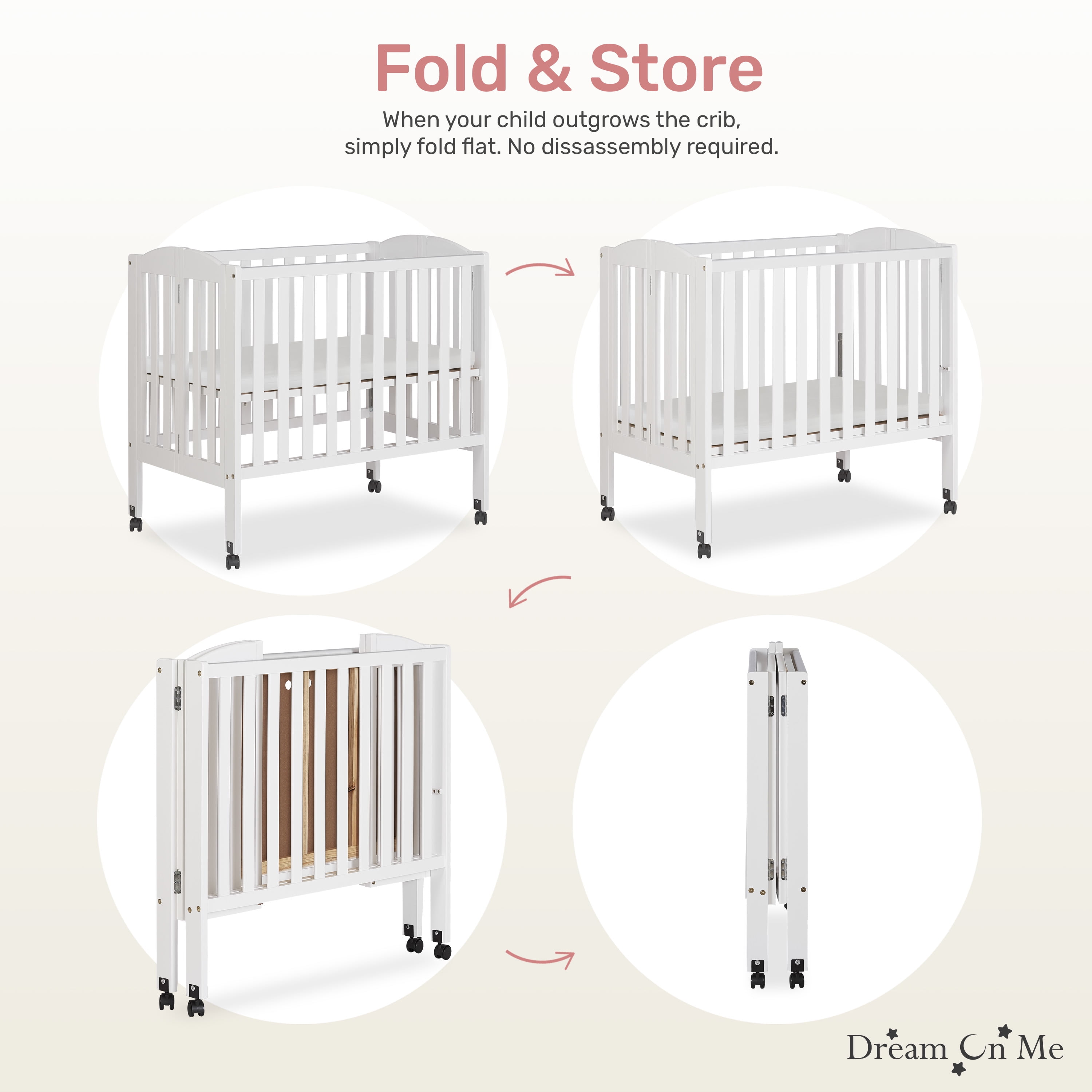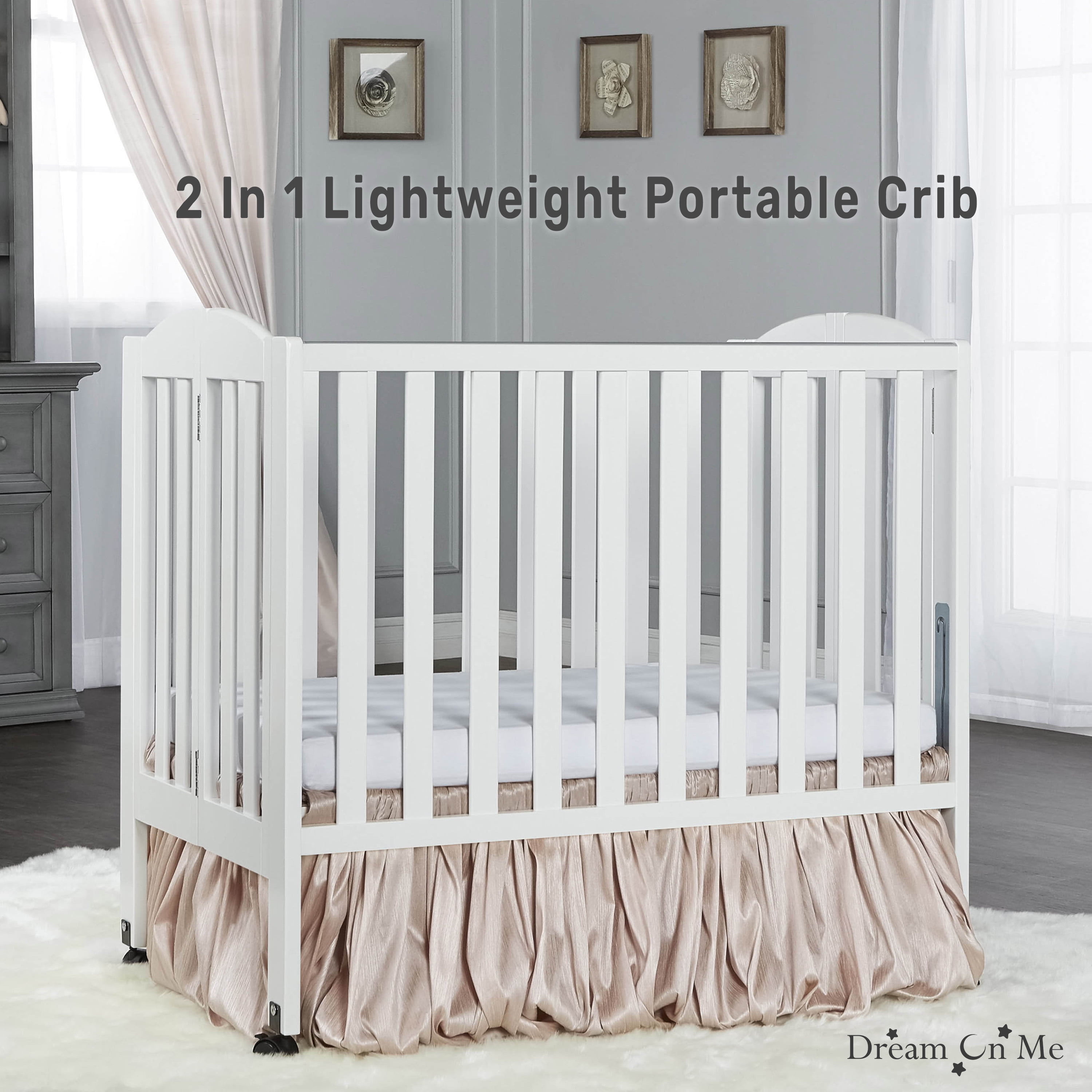 Dream On Me 2-in-1 Folding Portable Mini Crib in White, Mattress Pad Included, Easy to Fold and Store Baby Crib, Two Adjustable Mattress Height positions Convertible Crib