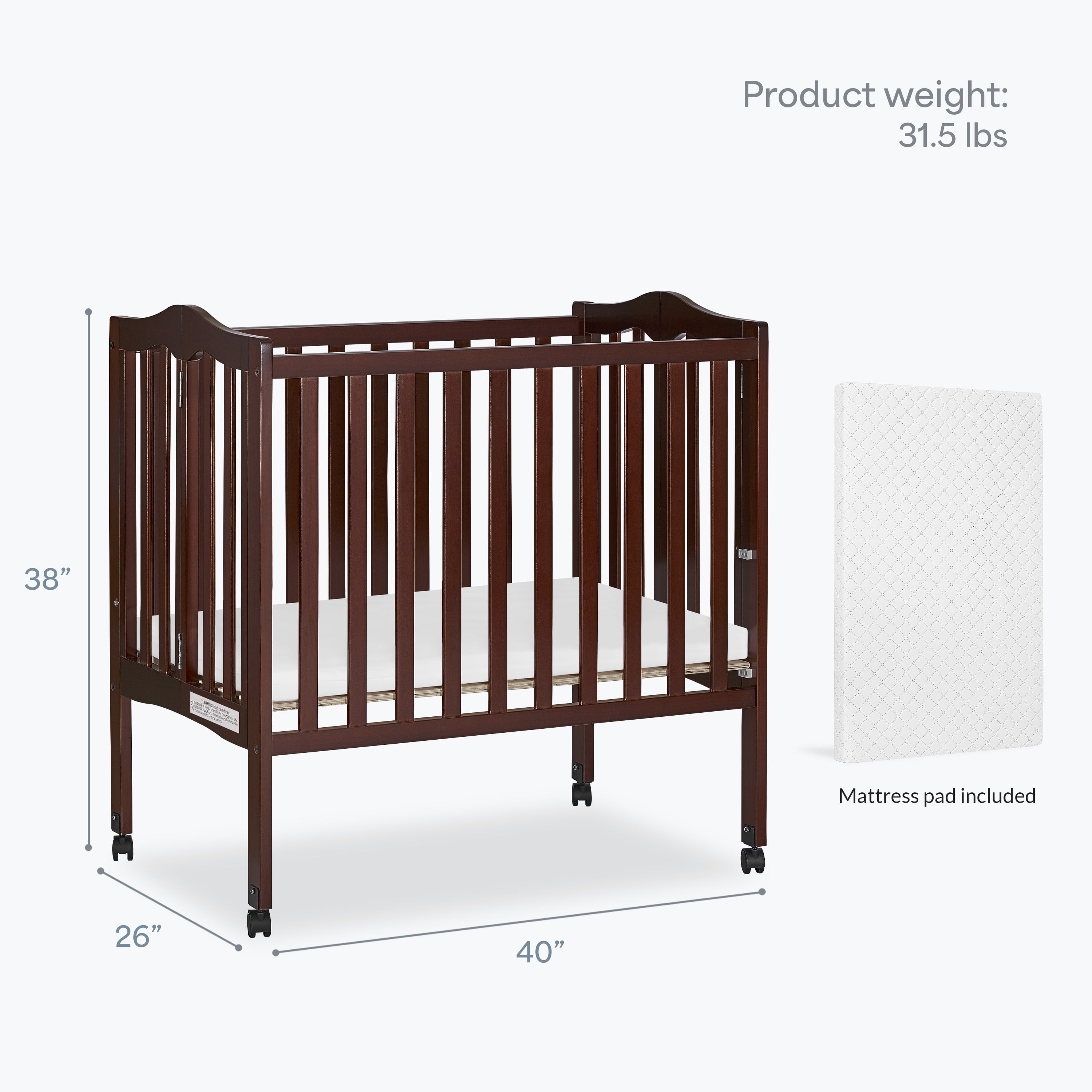 Dream On Me 2-in-1 Lightweight Portable Folding Crib: Easily converts from crib to play pen Dual hooded, locking wheels Fixed-side crib ensures stability 2-position mattress support Made of solid pine with a beautiful non-toxic finish Lightweight; weighs only 32 lbs Easy to maneuver and handle Includes mattress pad and all tools necessary for assembly Meets ASTM standards Dimensions: 40″L x 26″W x 38″H Please use bedding and mattresses that are designed for portable or mini cribs only. Using bedding that does not fit your Dream On Me 2-in-1 crib dimensions increases the risk of injury and suffocation Bedding not included Questions about product recalls? Items that are a part of a recall are removed from the site, and are no longer available for purchase. These items include items only, not those of Marketplace sellers. Customers who have purchased a recalled item will be notified by email or by letter sent to the address given at the time of purchase. For complete recall information, go to Recalls.